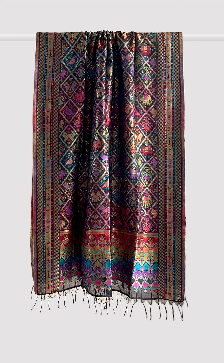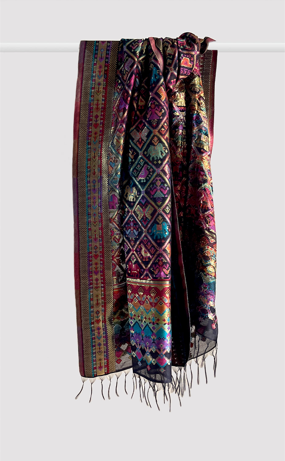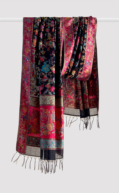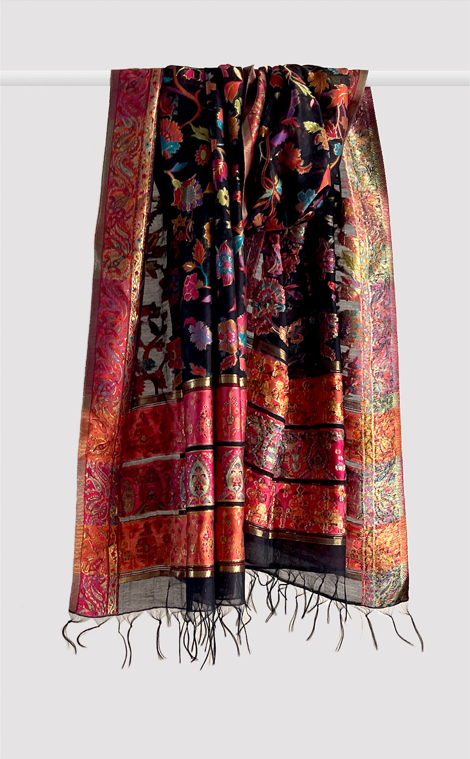 Regular price Rs. 6,000.00Luxurious fine wool stole in a black shade and moroccan zari motif design. Wear on either side to show black on one side and full zari on the other side. The perfect accessory for the festive winter season that will elevate all your outfits