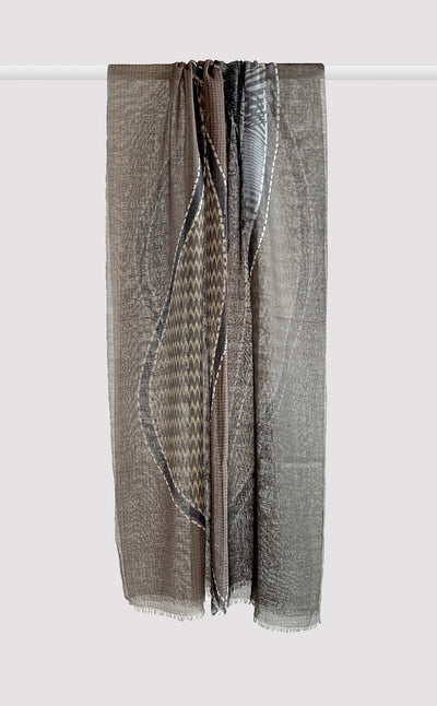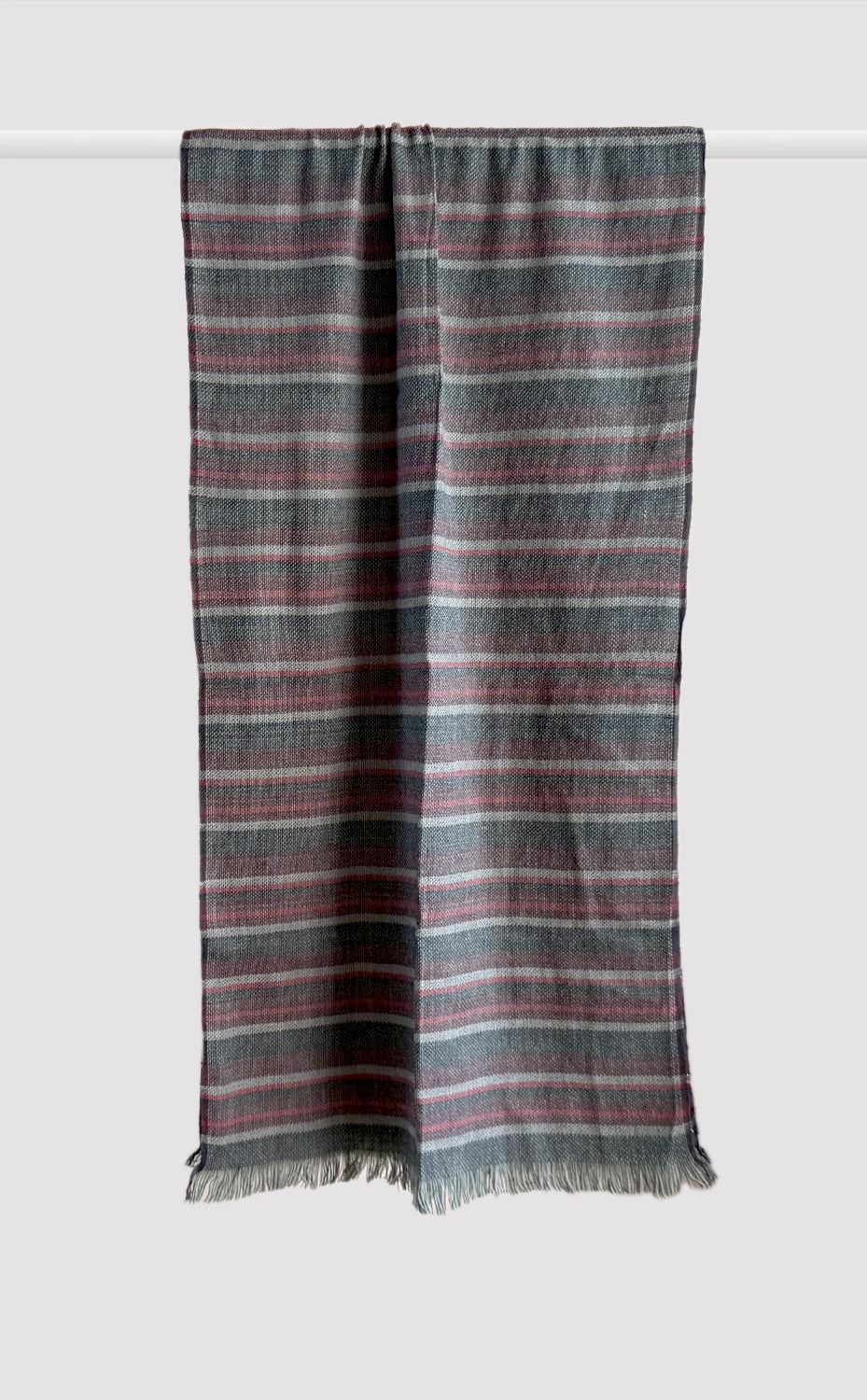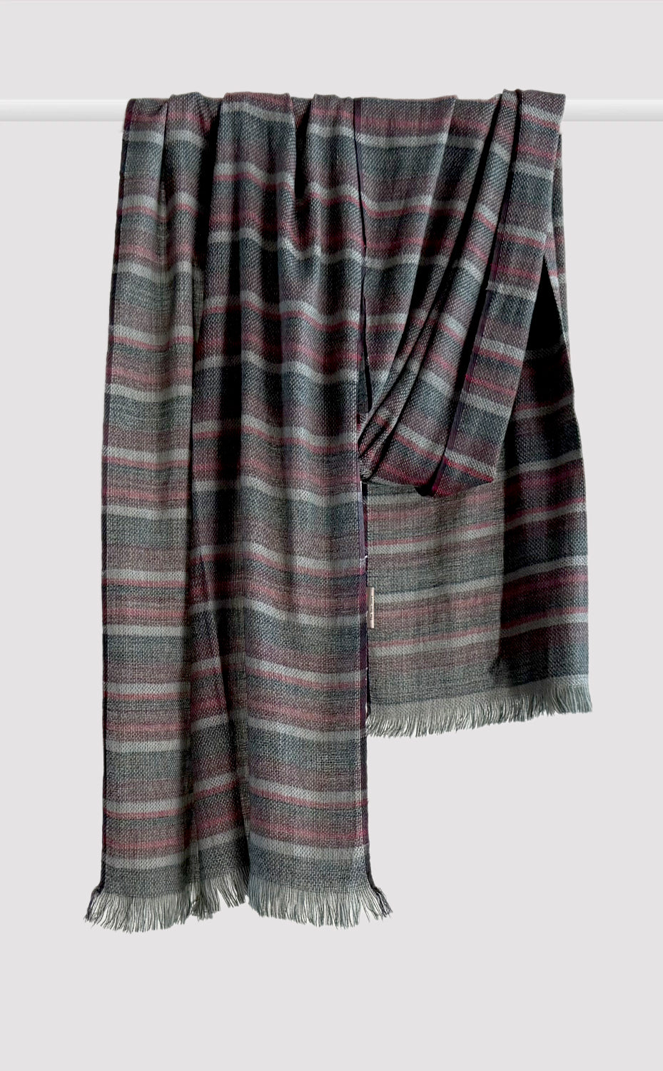 Luxurious fine wool stole in grey with a contrasting block stripes. The fine wool blended with silk gives it an ultra soft & cosy feel