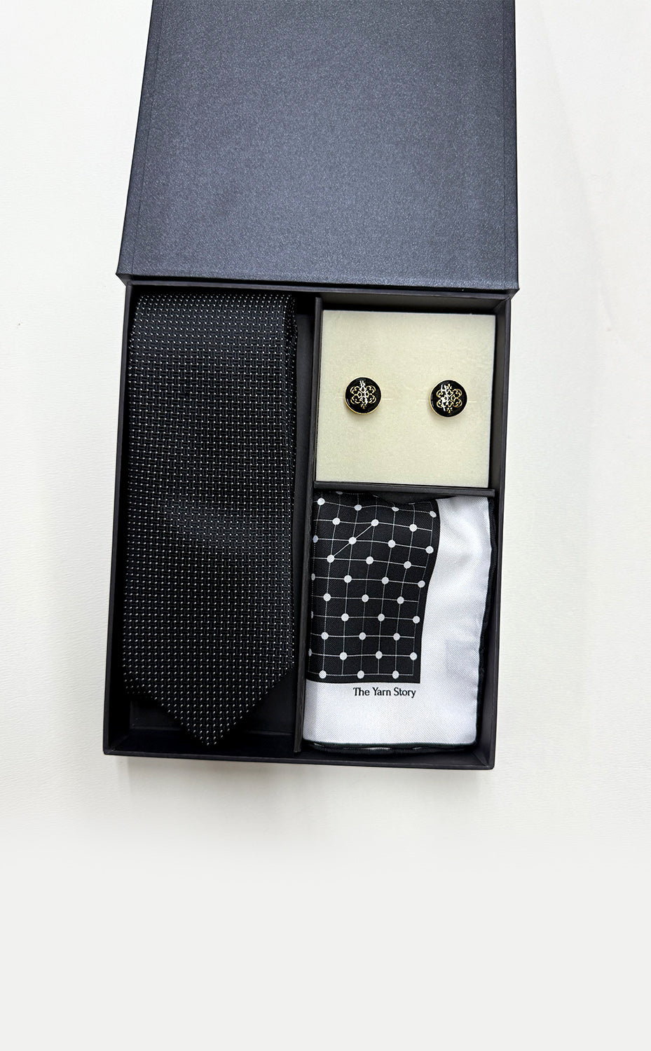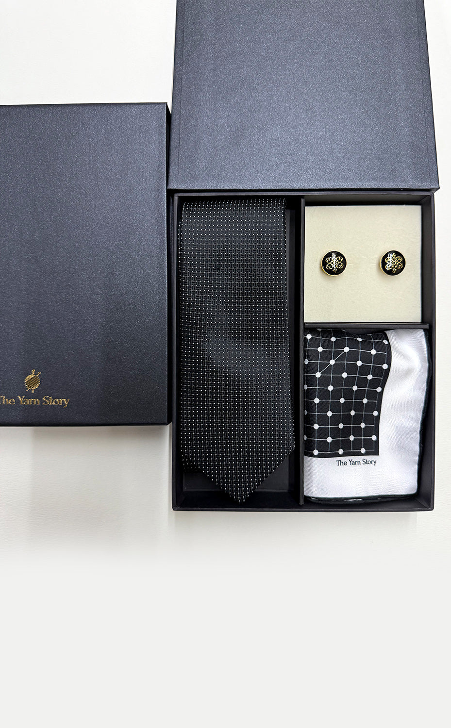 Regular price Rs. 9,500.00A classic silk tie paired with our printed pocket square and cufflinks