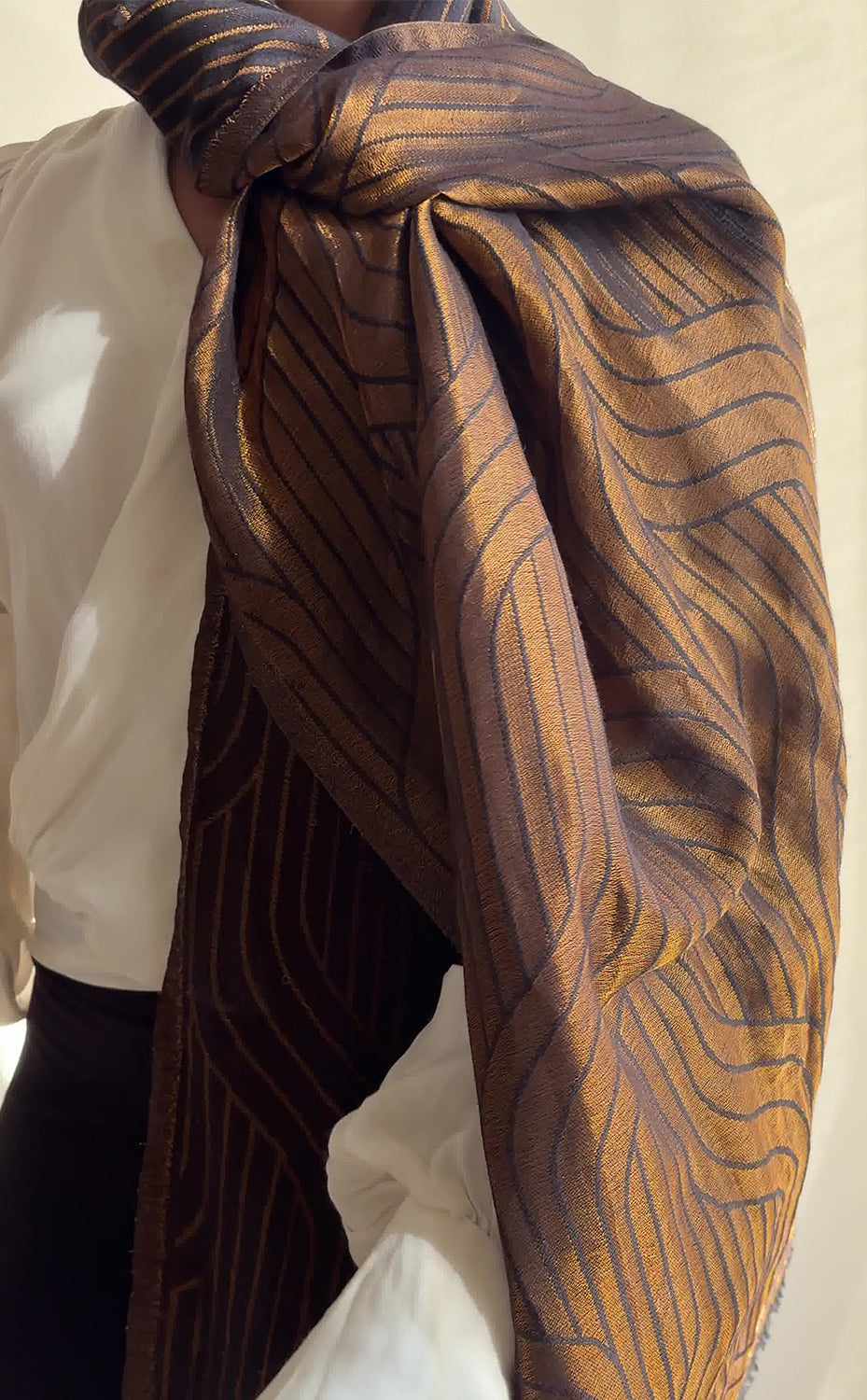 Regular price Rs. 6,000.00Luxurious fine wool stole in a lovely brown shade and zari moroccan motif design. Wear on either side to show brown on one side and full zari on the other side. The perfect accessory for the festive winter season that will elevate all your outfits