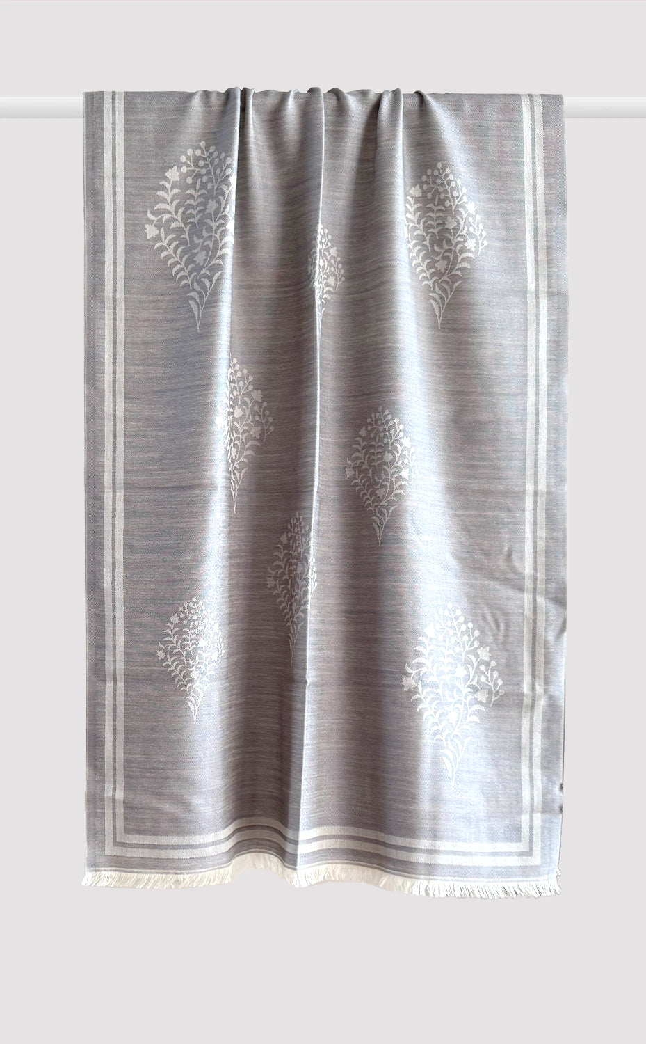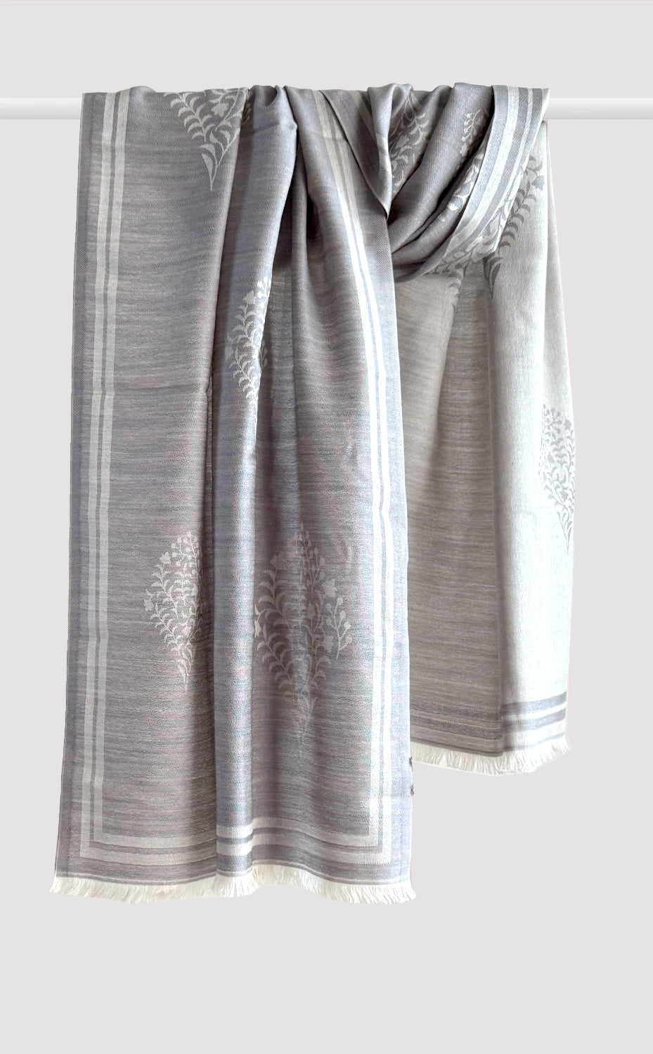Regular price Rs. 3,800.00 Sale price Rs. 1,900.00 Save 50%Fine wool woven stole with intricate leaf design in sophisticated grey color which make it a versatile, classic and a must-have for your wardrobe