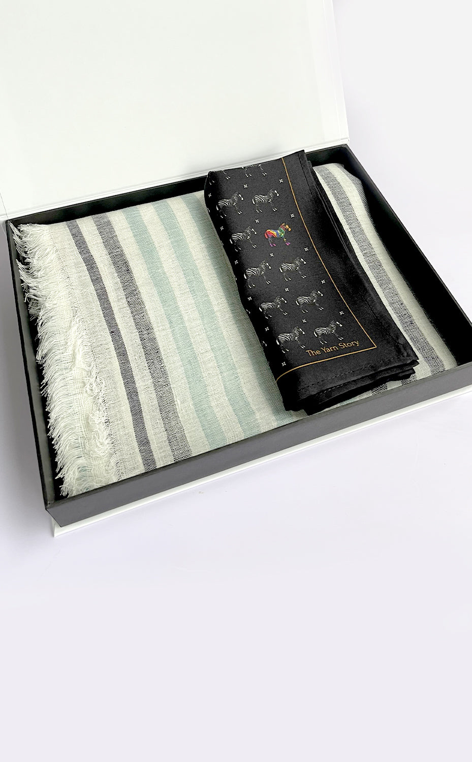 Regular price Rs. 6,200.00Unique gift sets for Him. A classic teal striped muffler paired with an elegant emerald pocket square Makes for a lovely & thoughtful festive gift set.