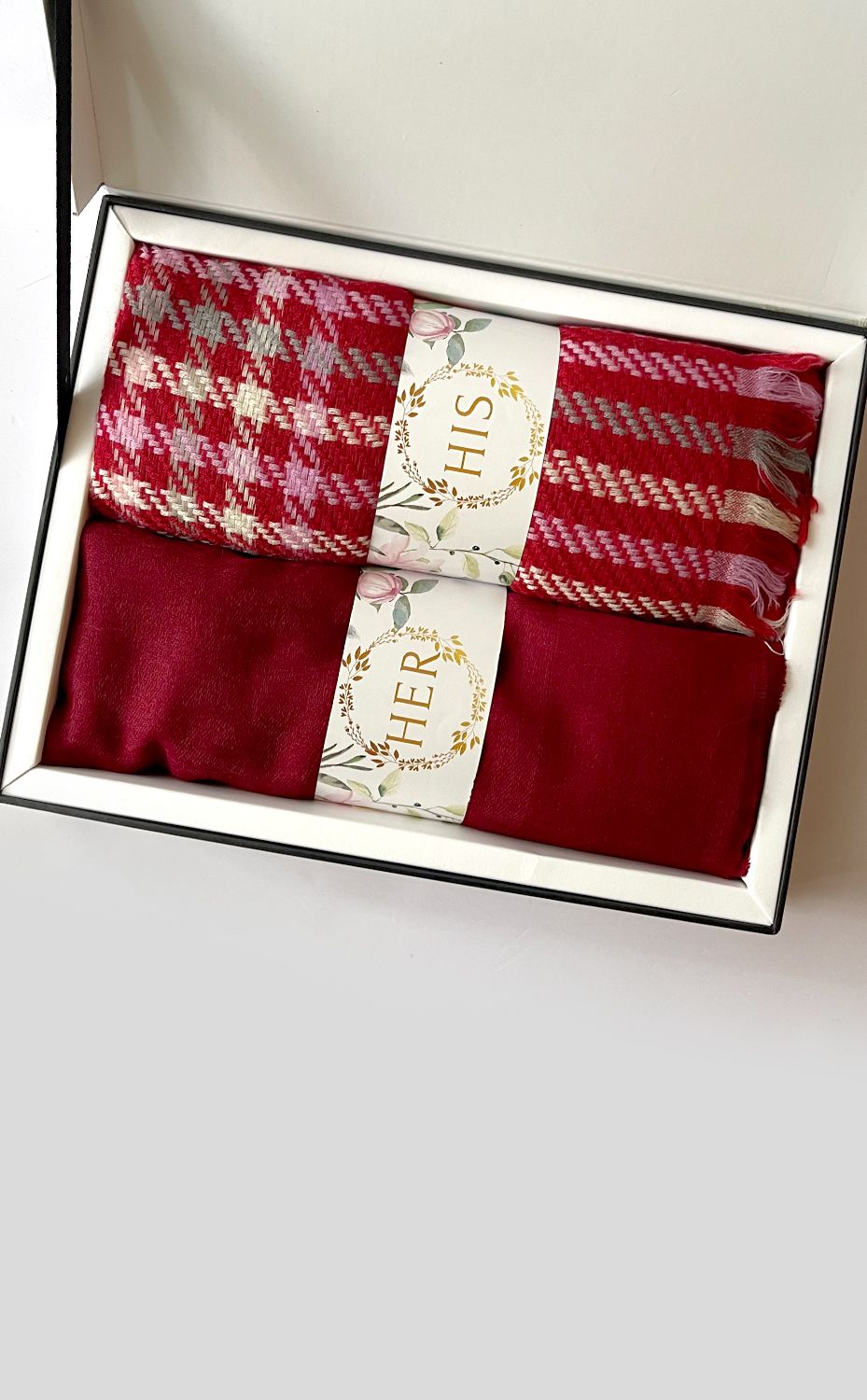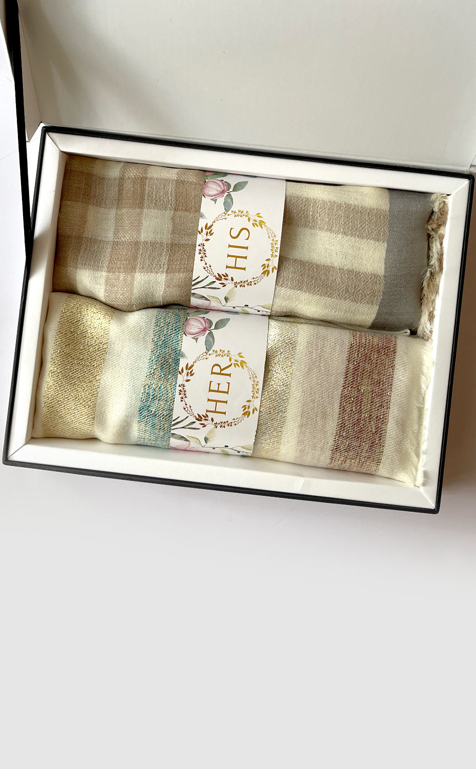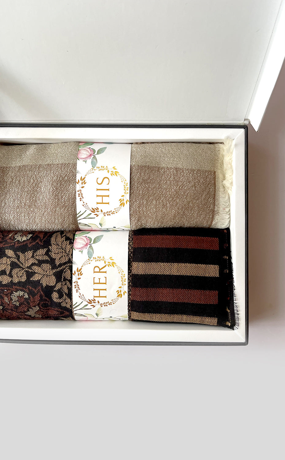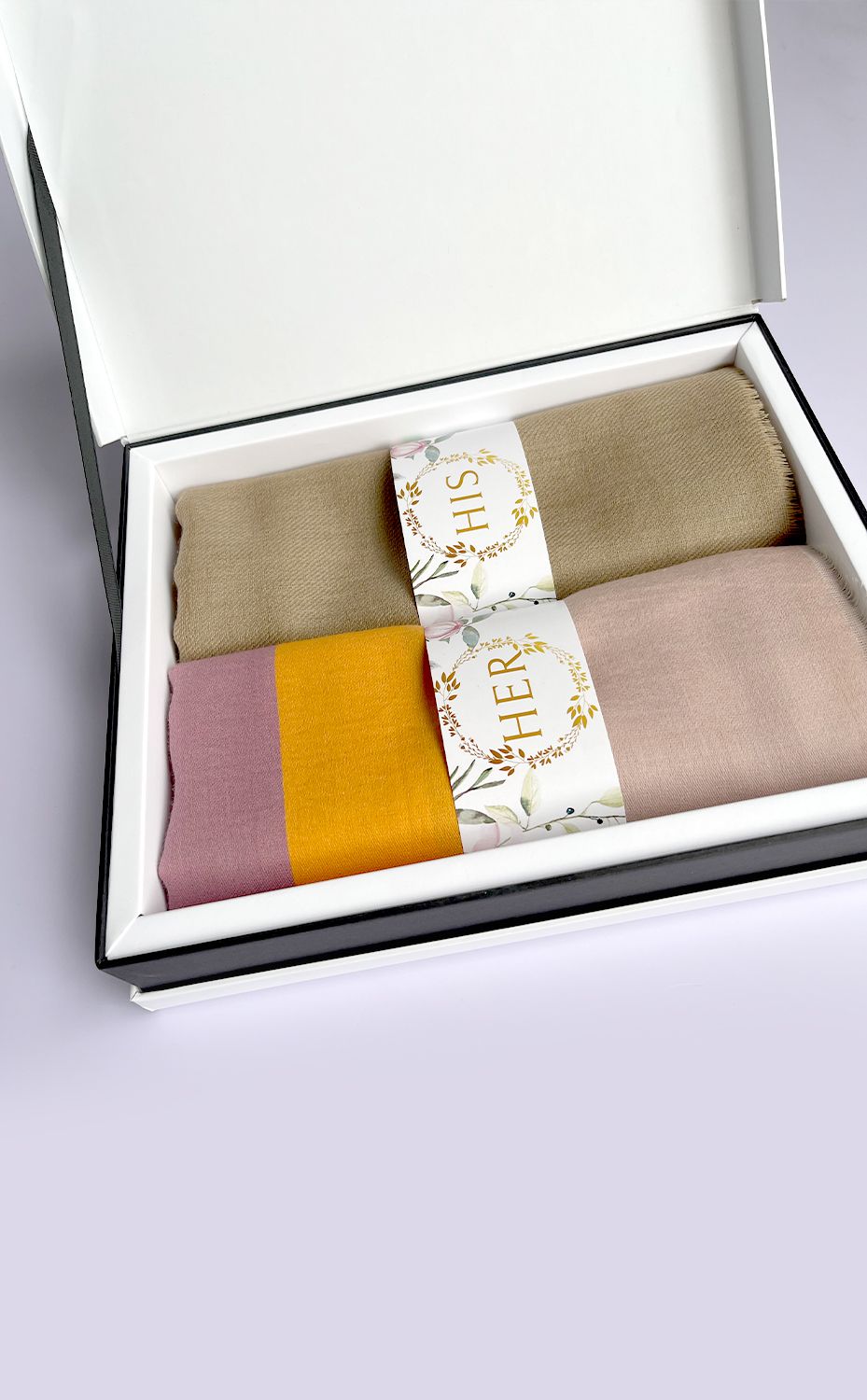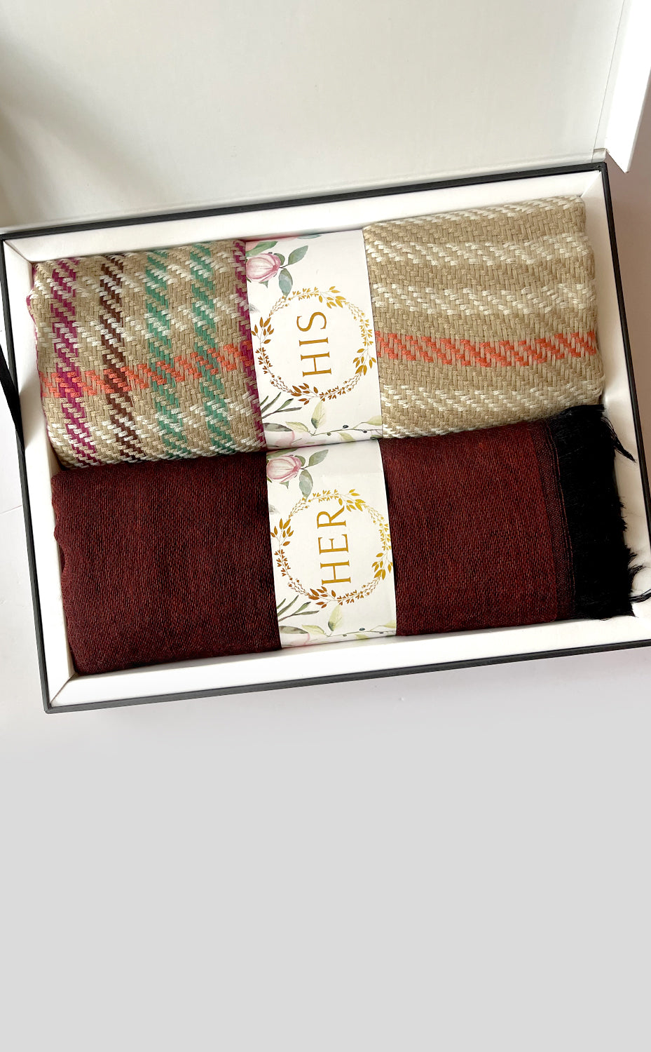 - White gift box packaging for the stole and muffler