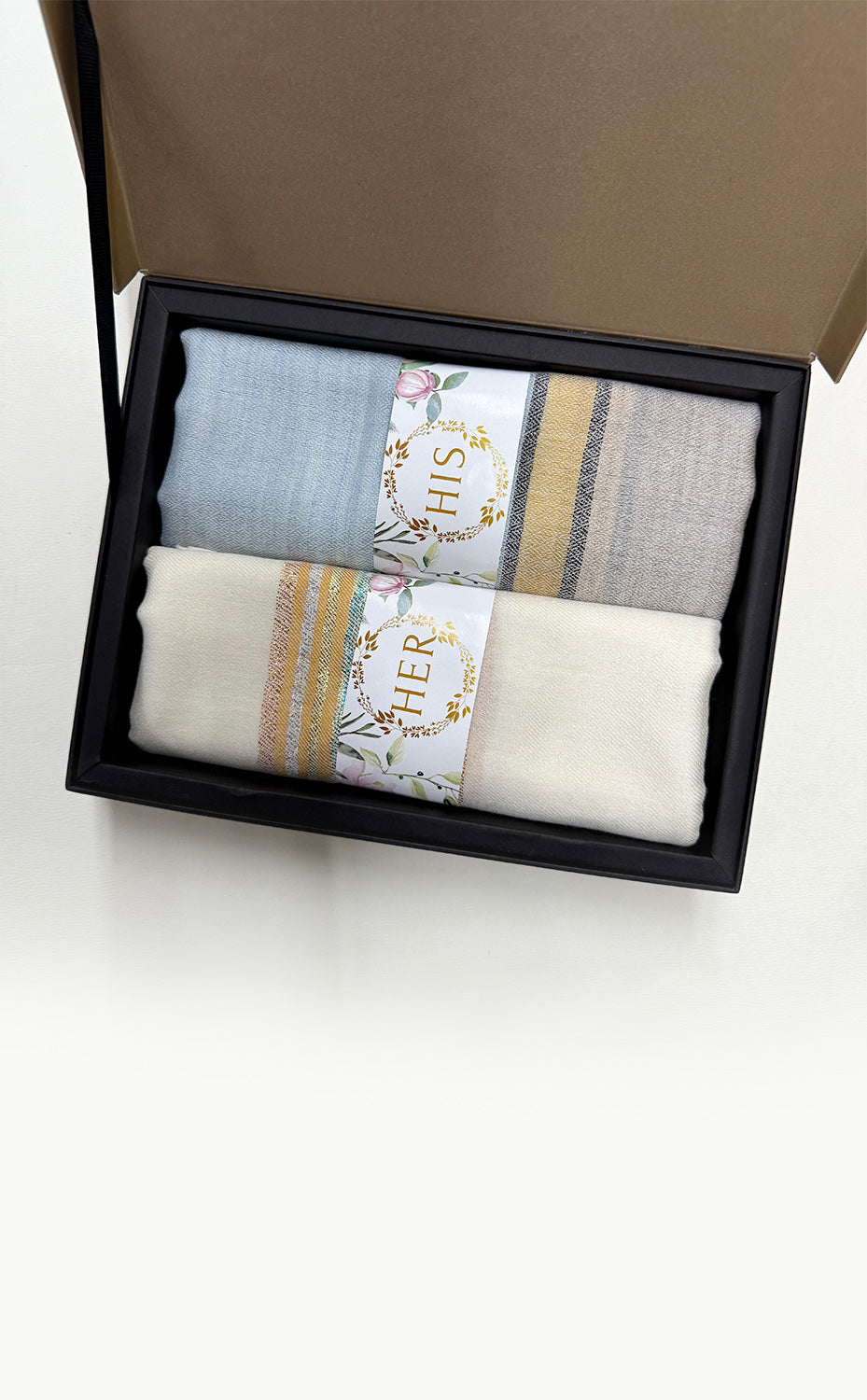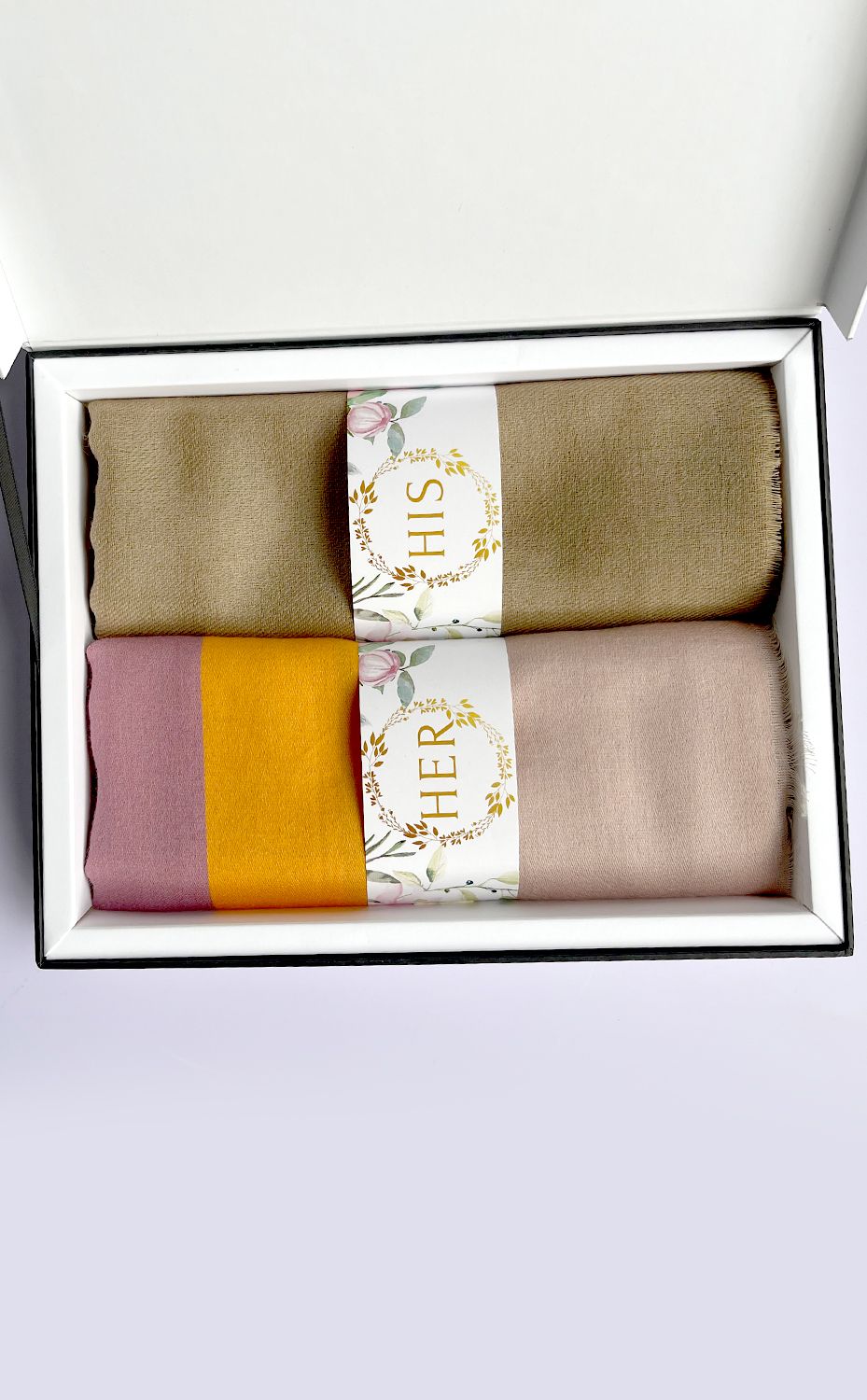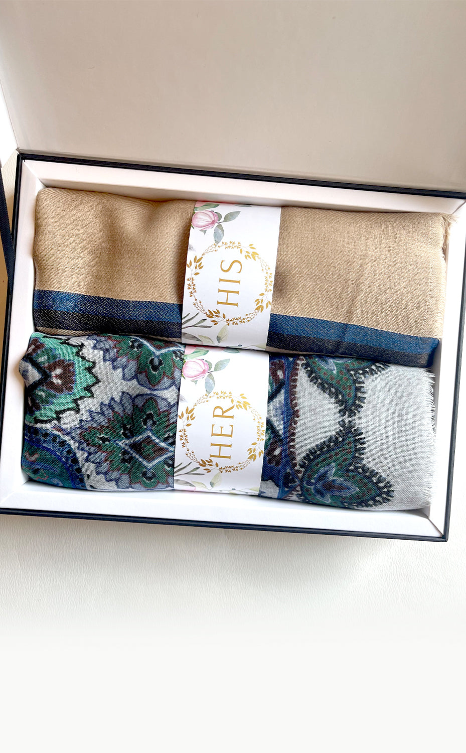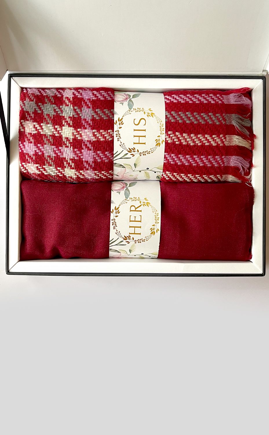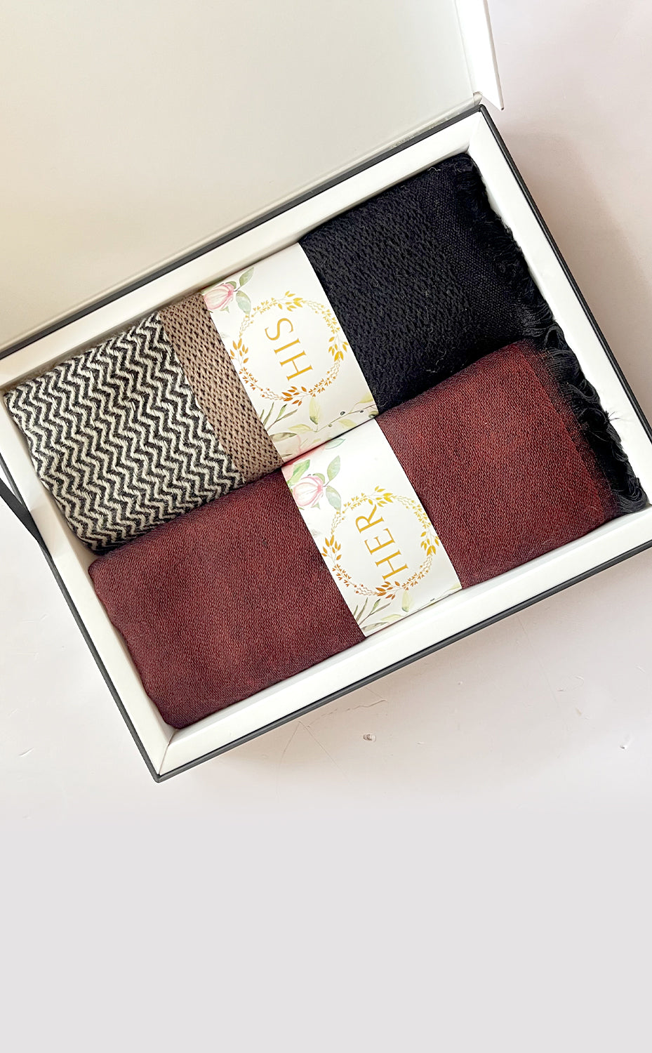 - White gift box packaging for the stole and muffler