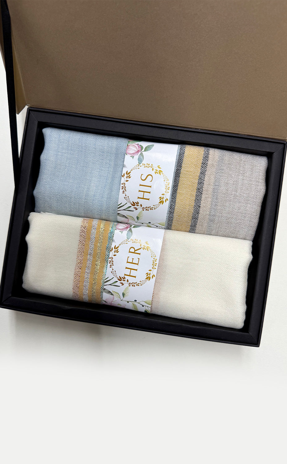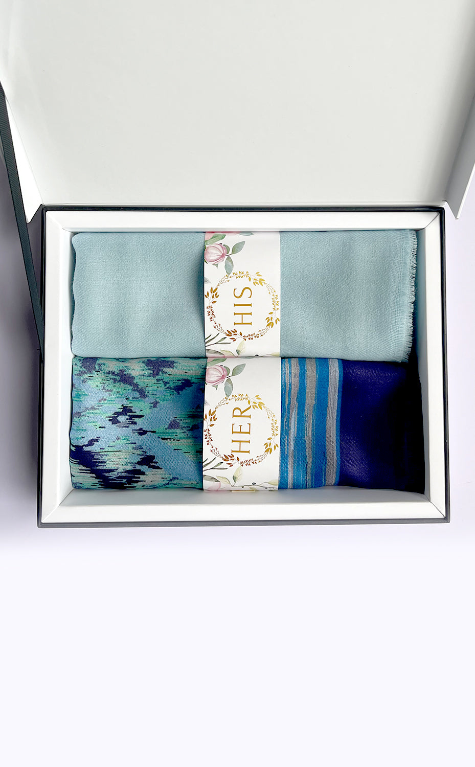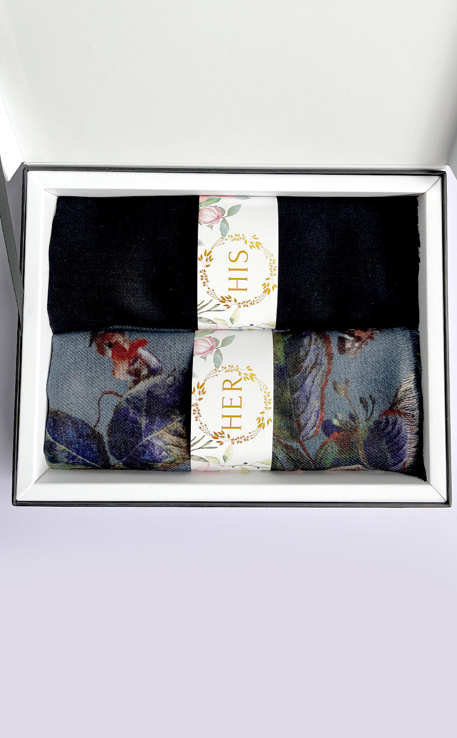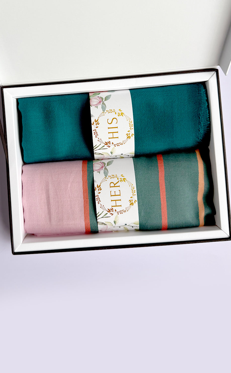 - White gift box packaging for the stole and muffler