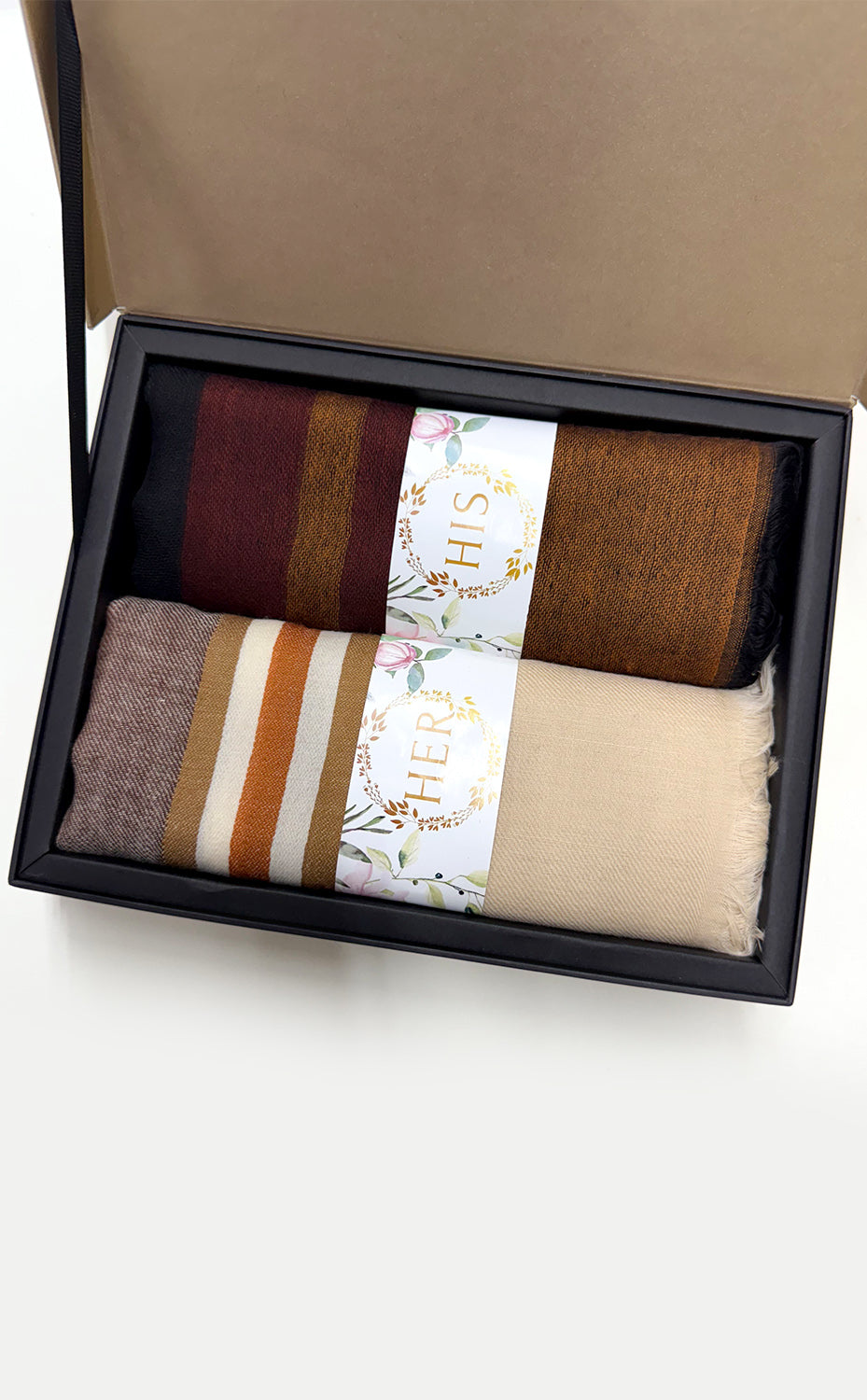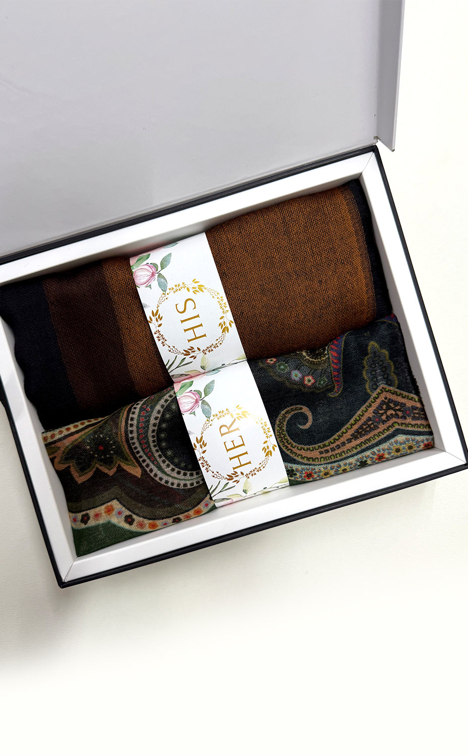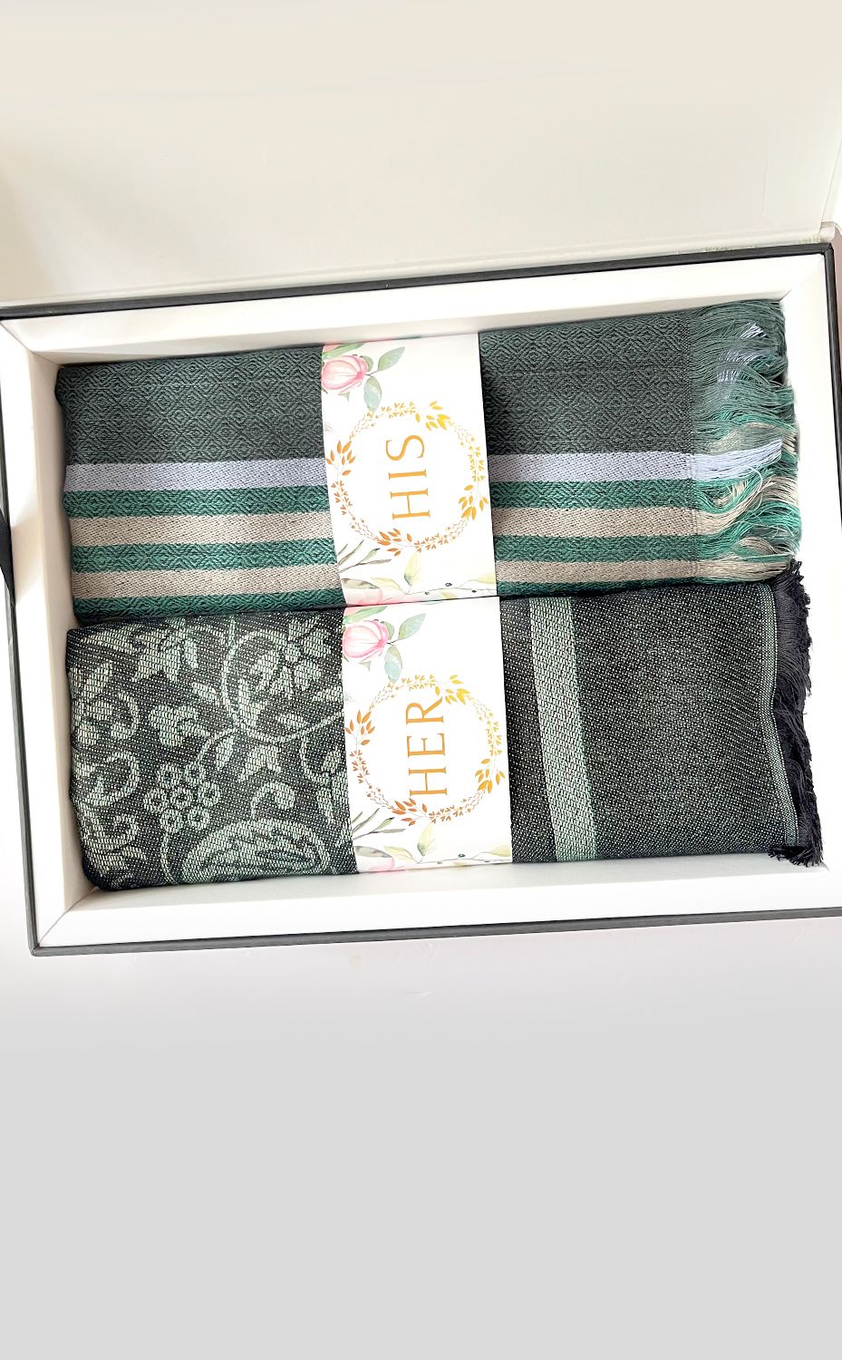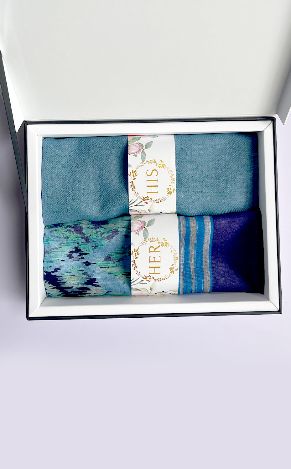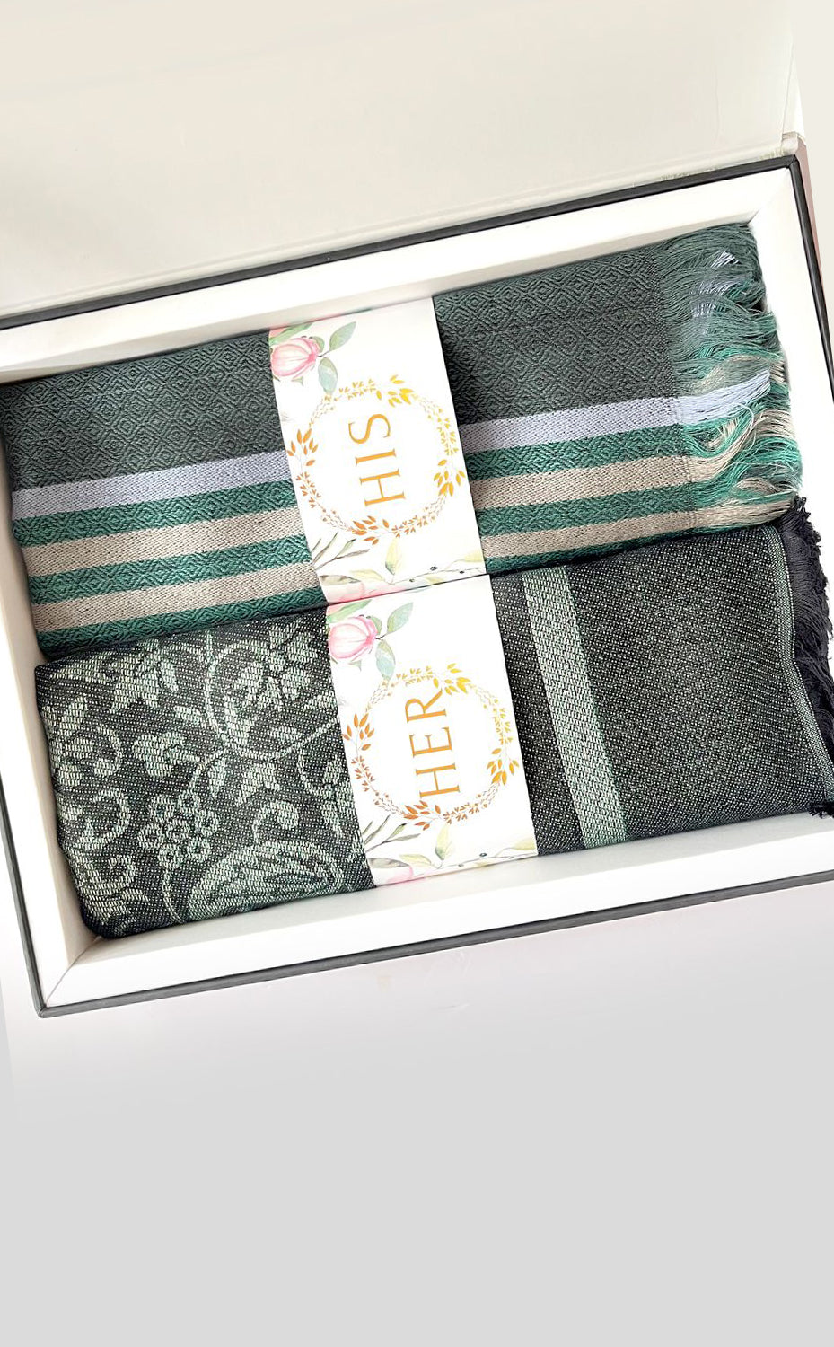 - White gift box packaging for the stole and muffler