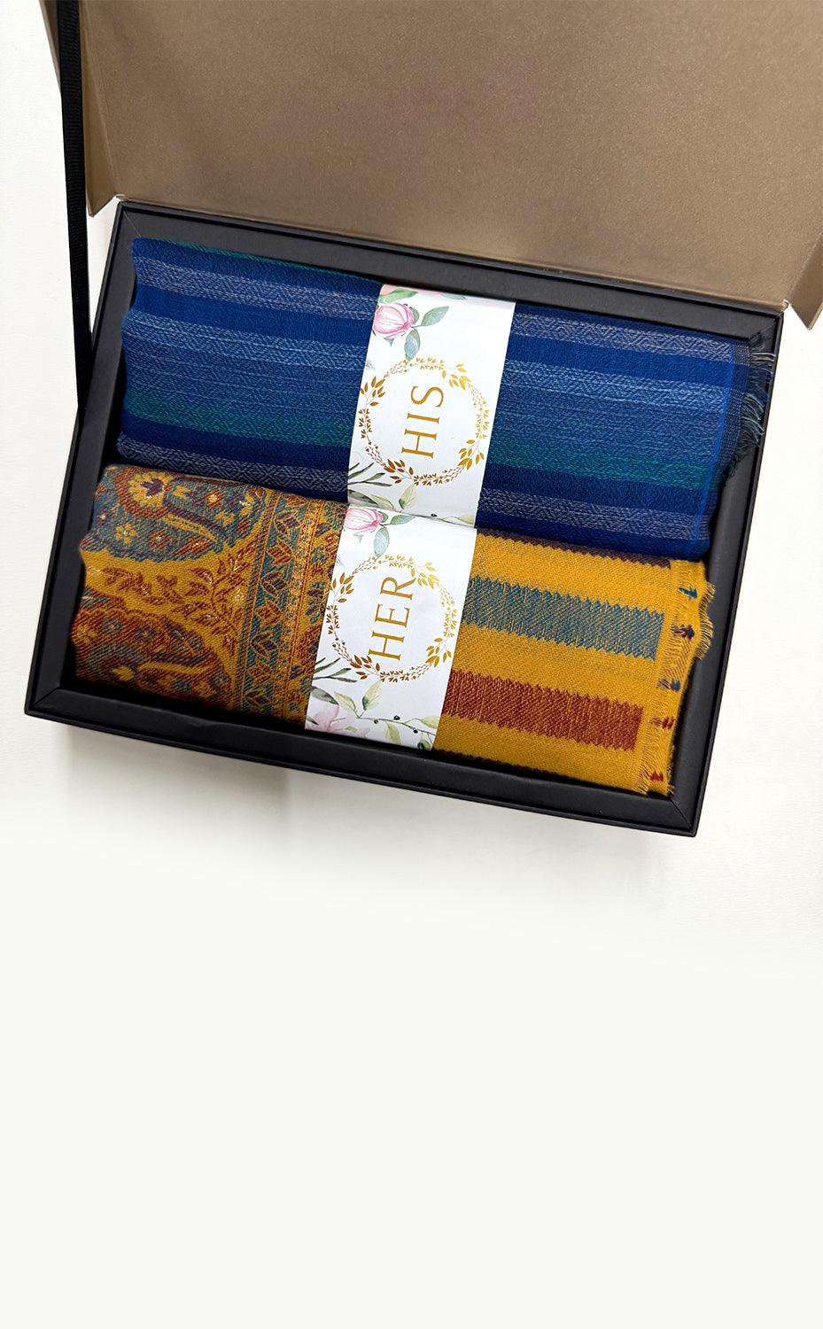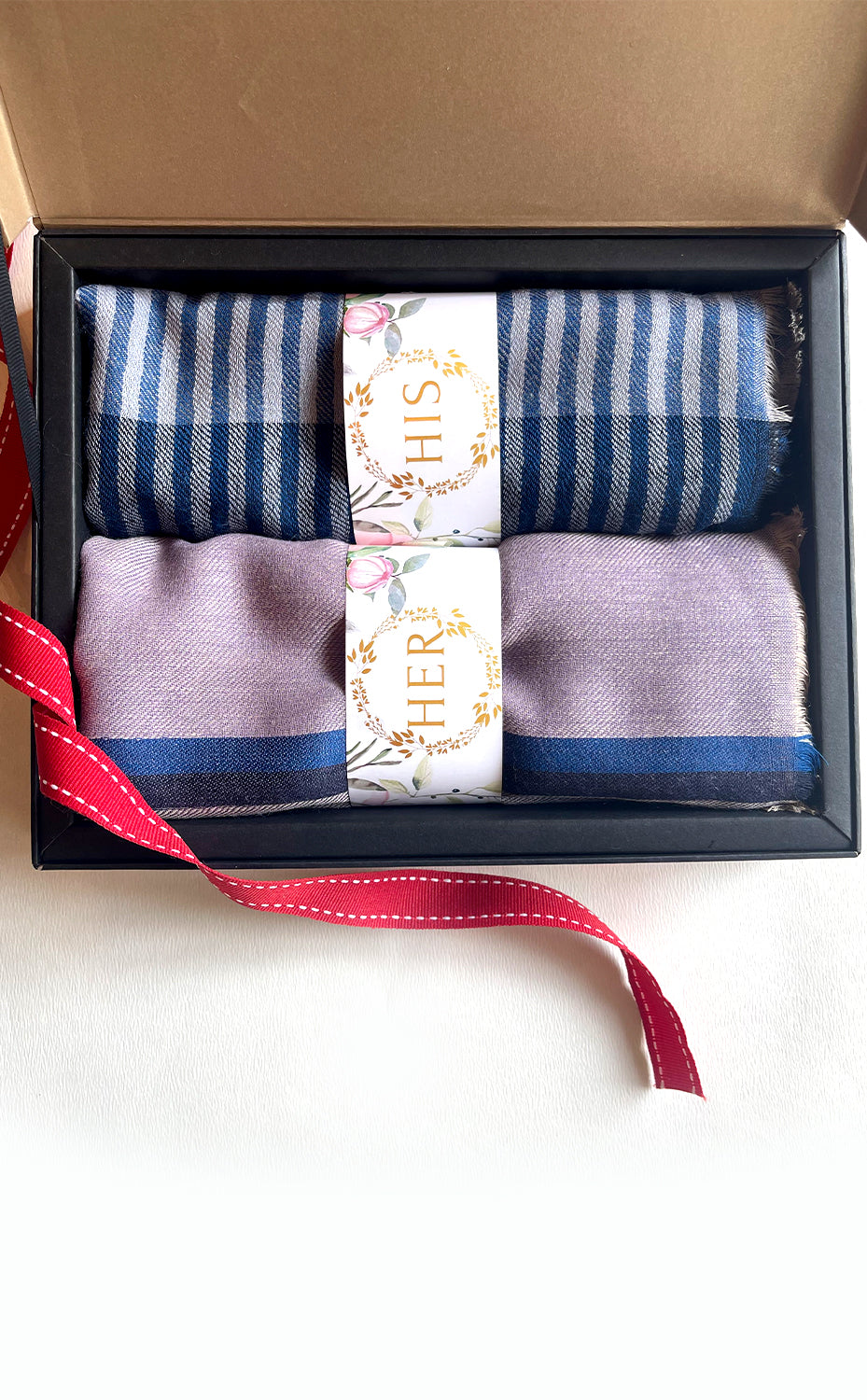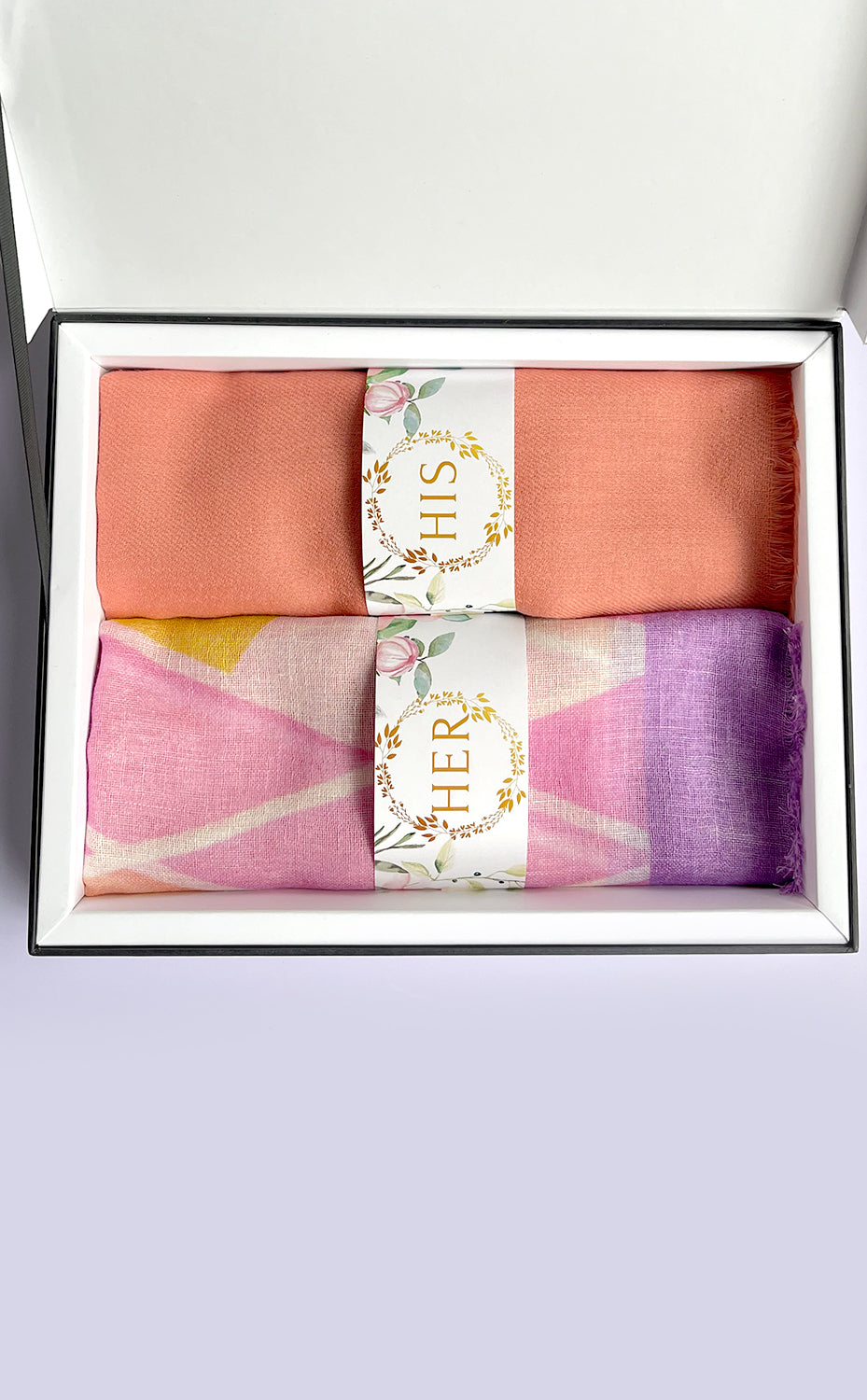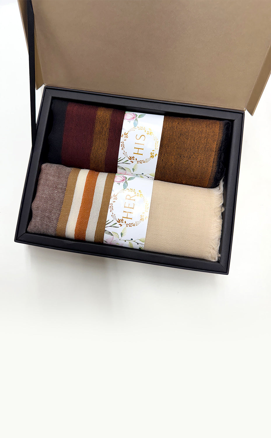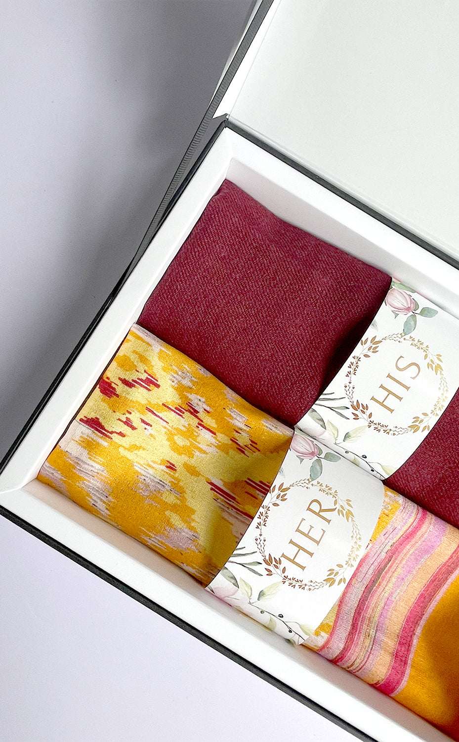 - White gift box packaging for the stole and muffler