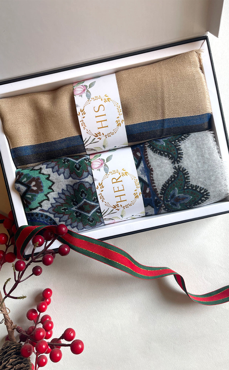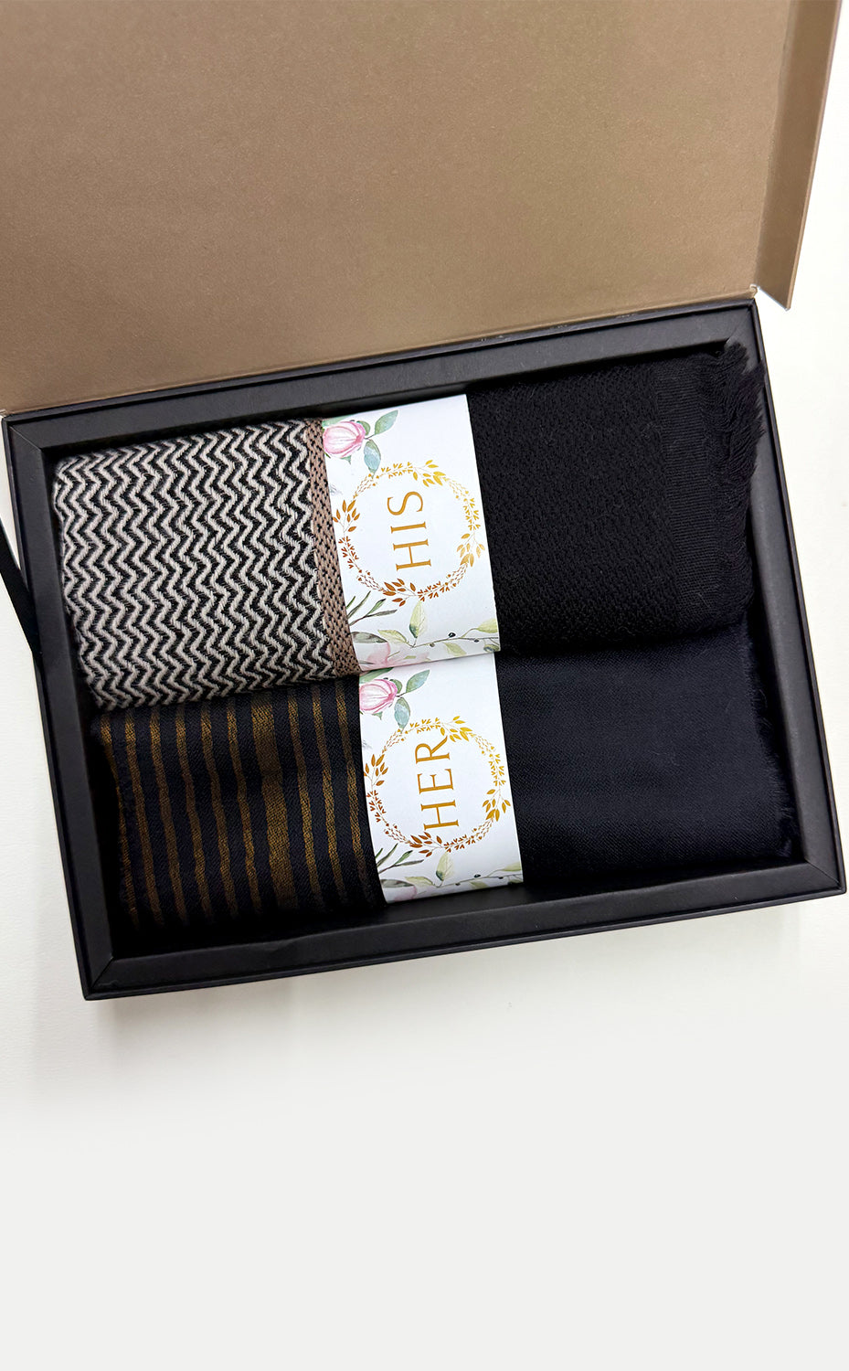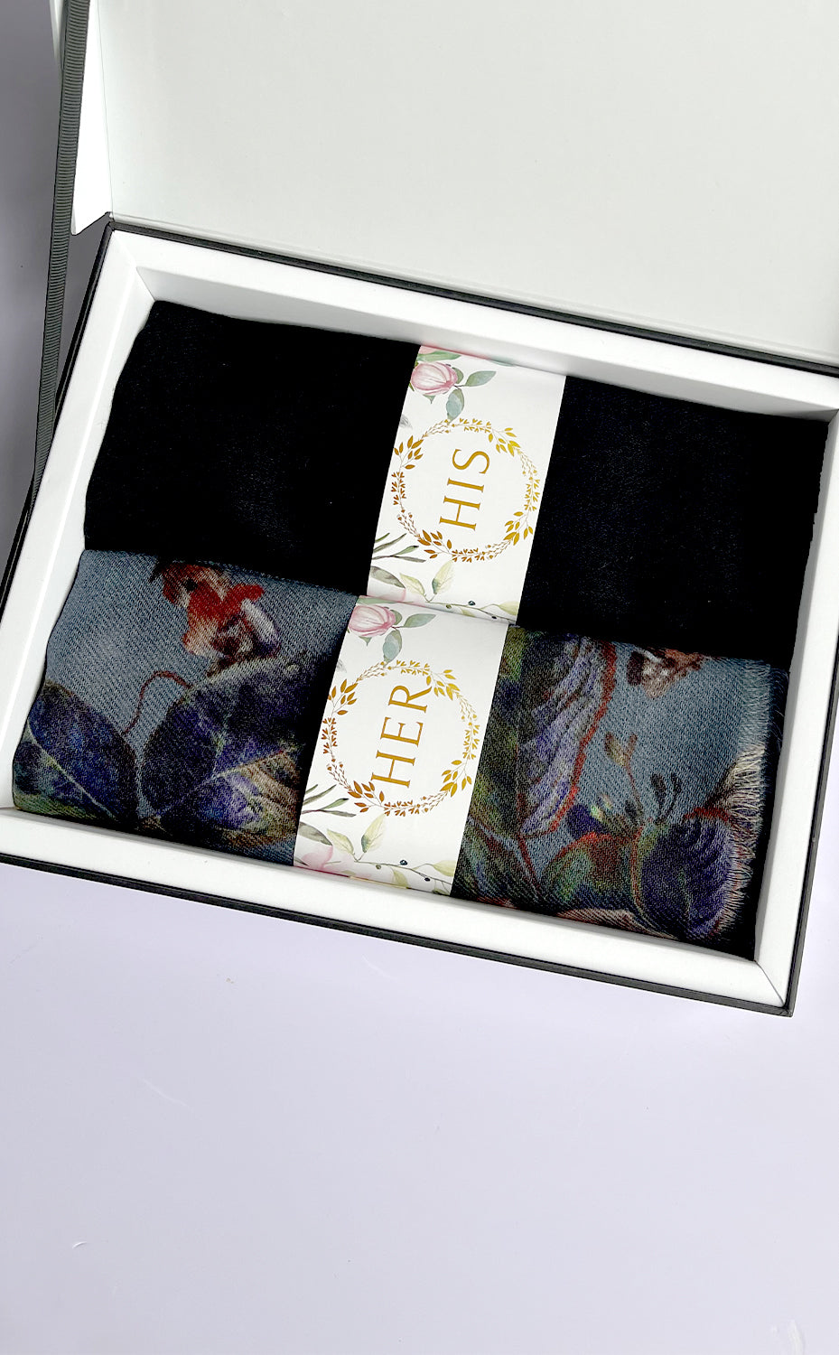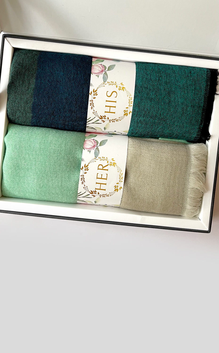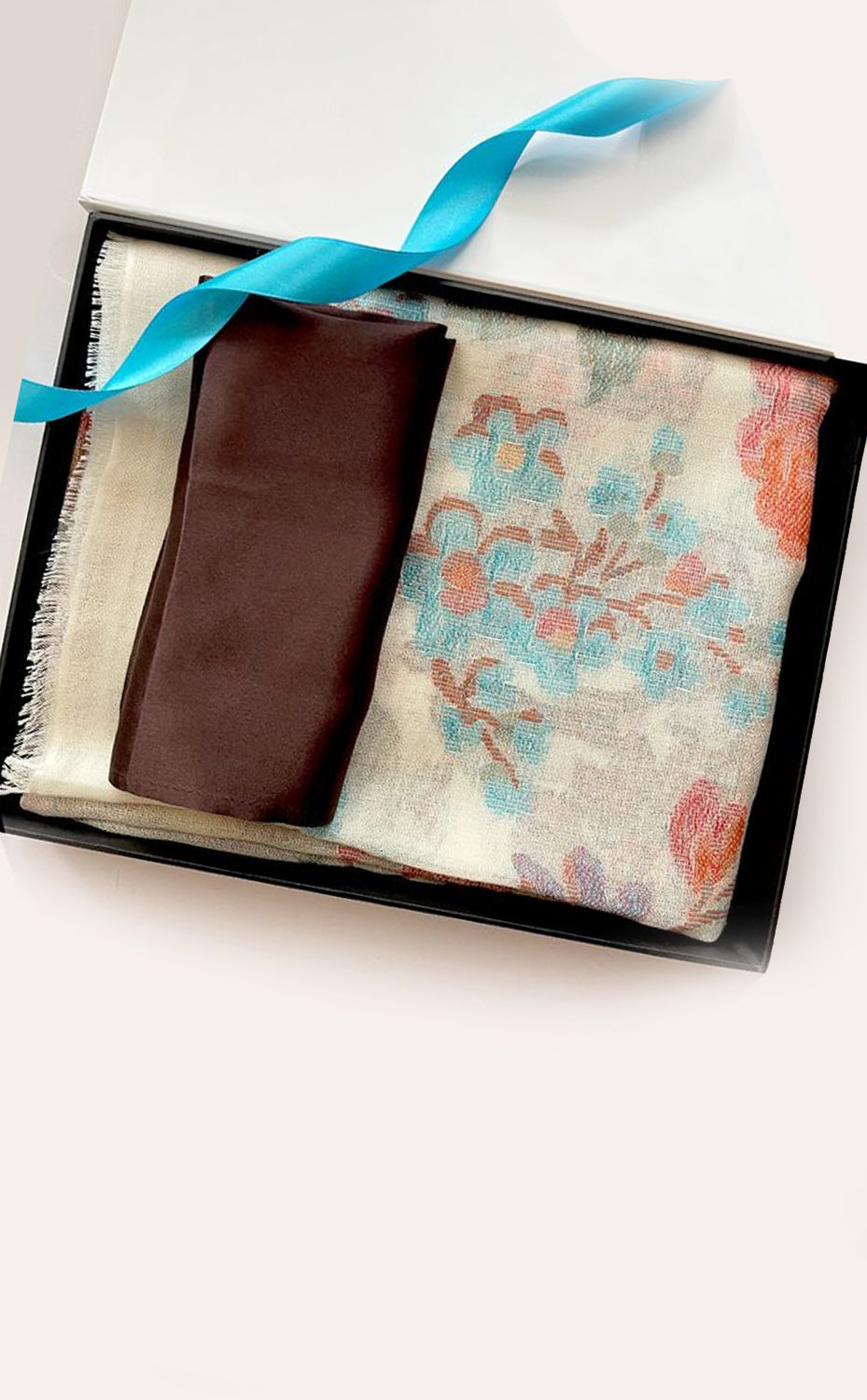 - White gift box packaging for the stole and muffler