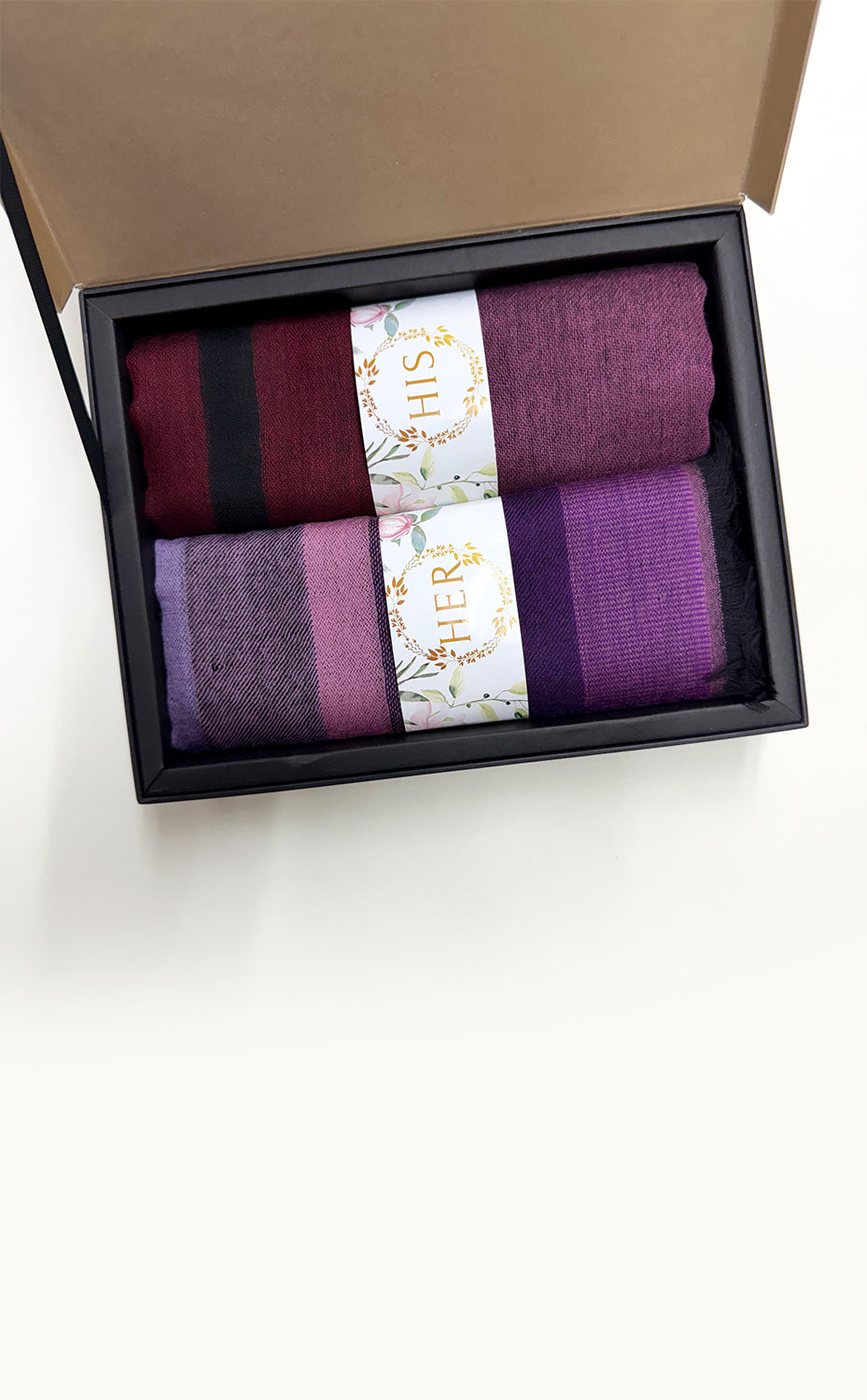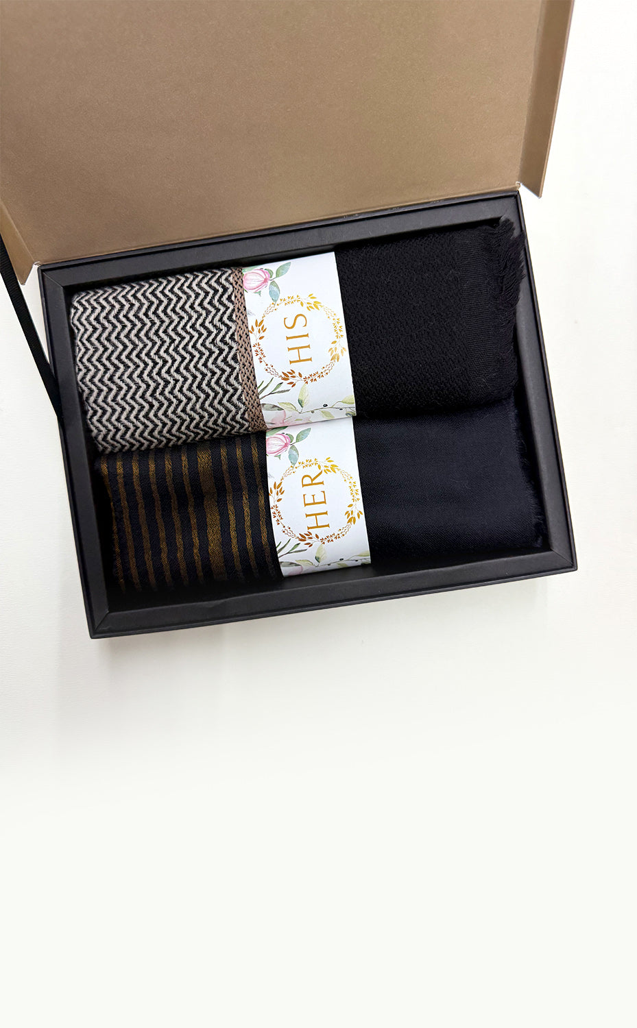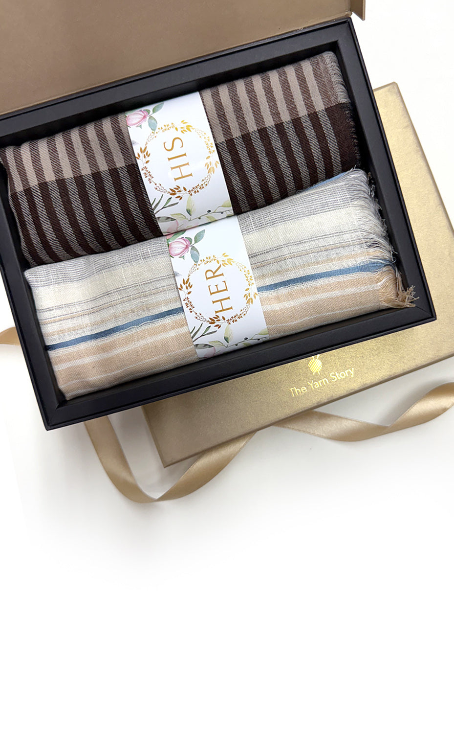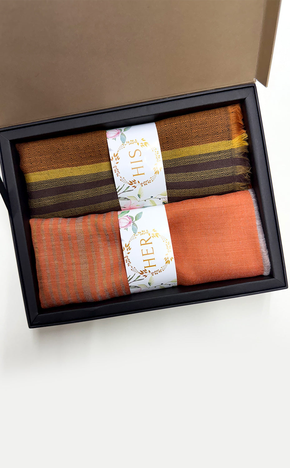 - White gift box packaging for the stole and muffler