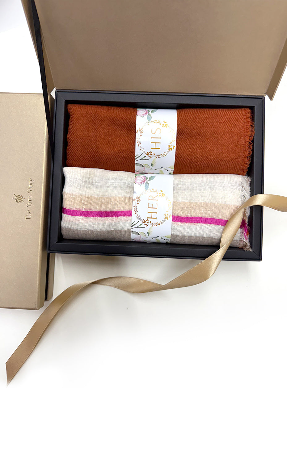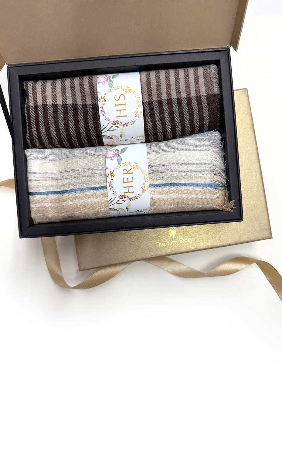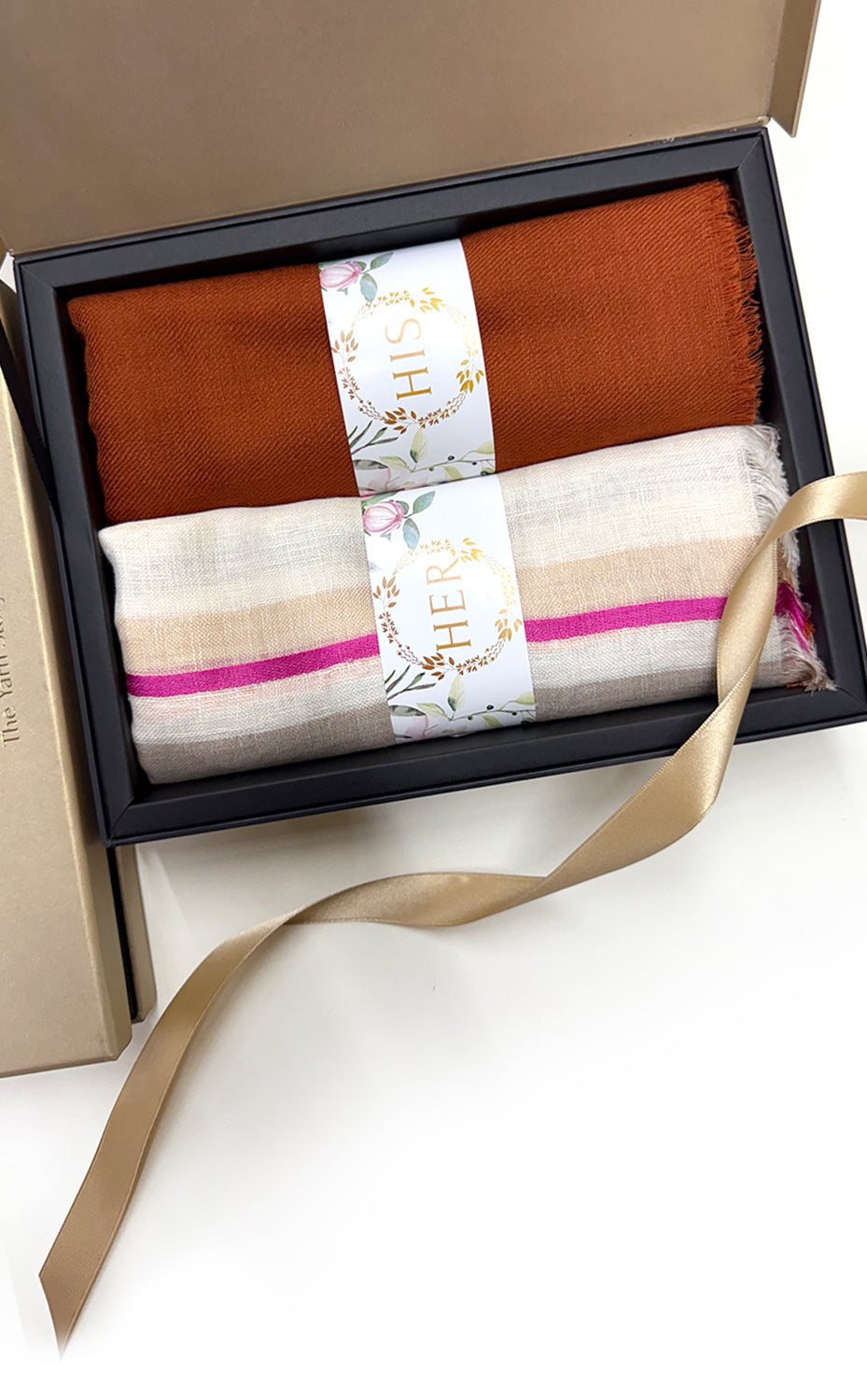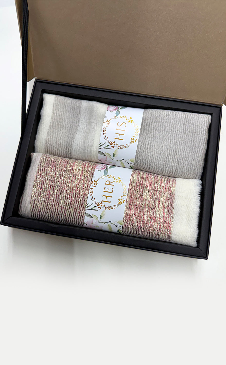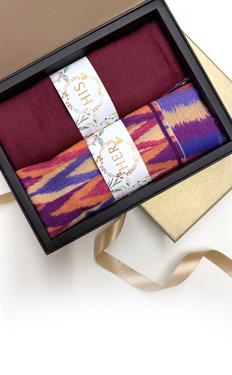 - White gift box packaging for the stole and muffler