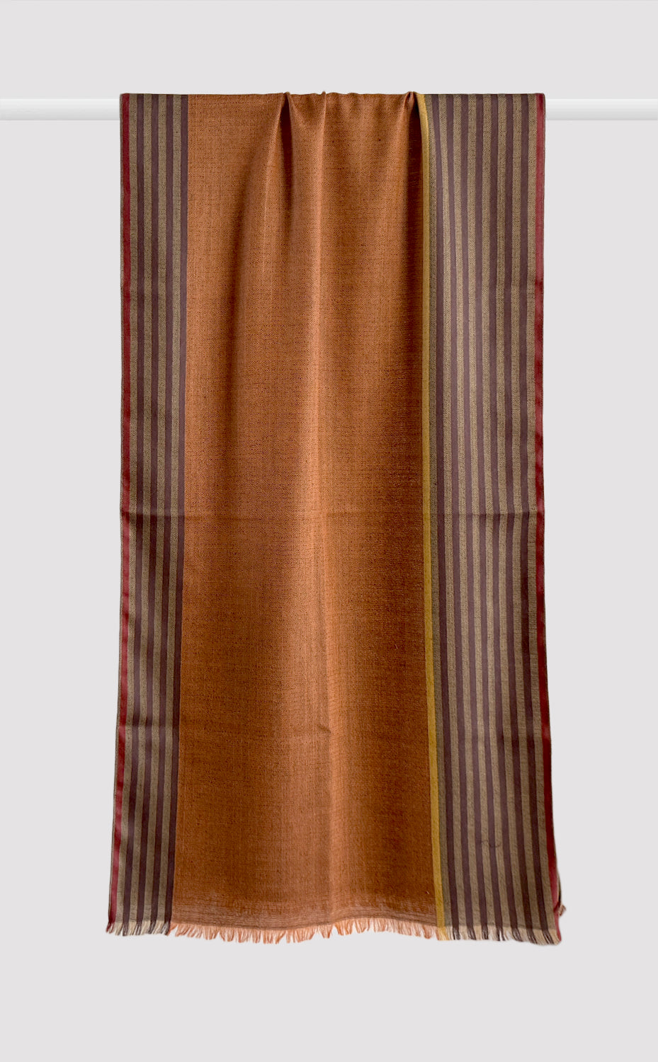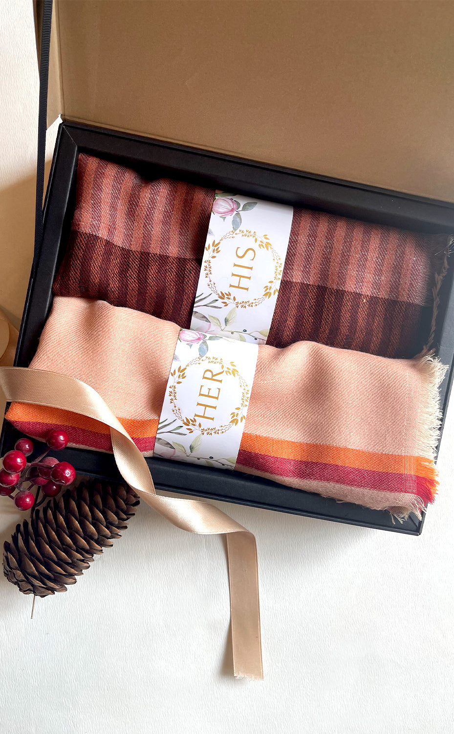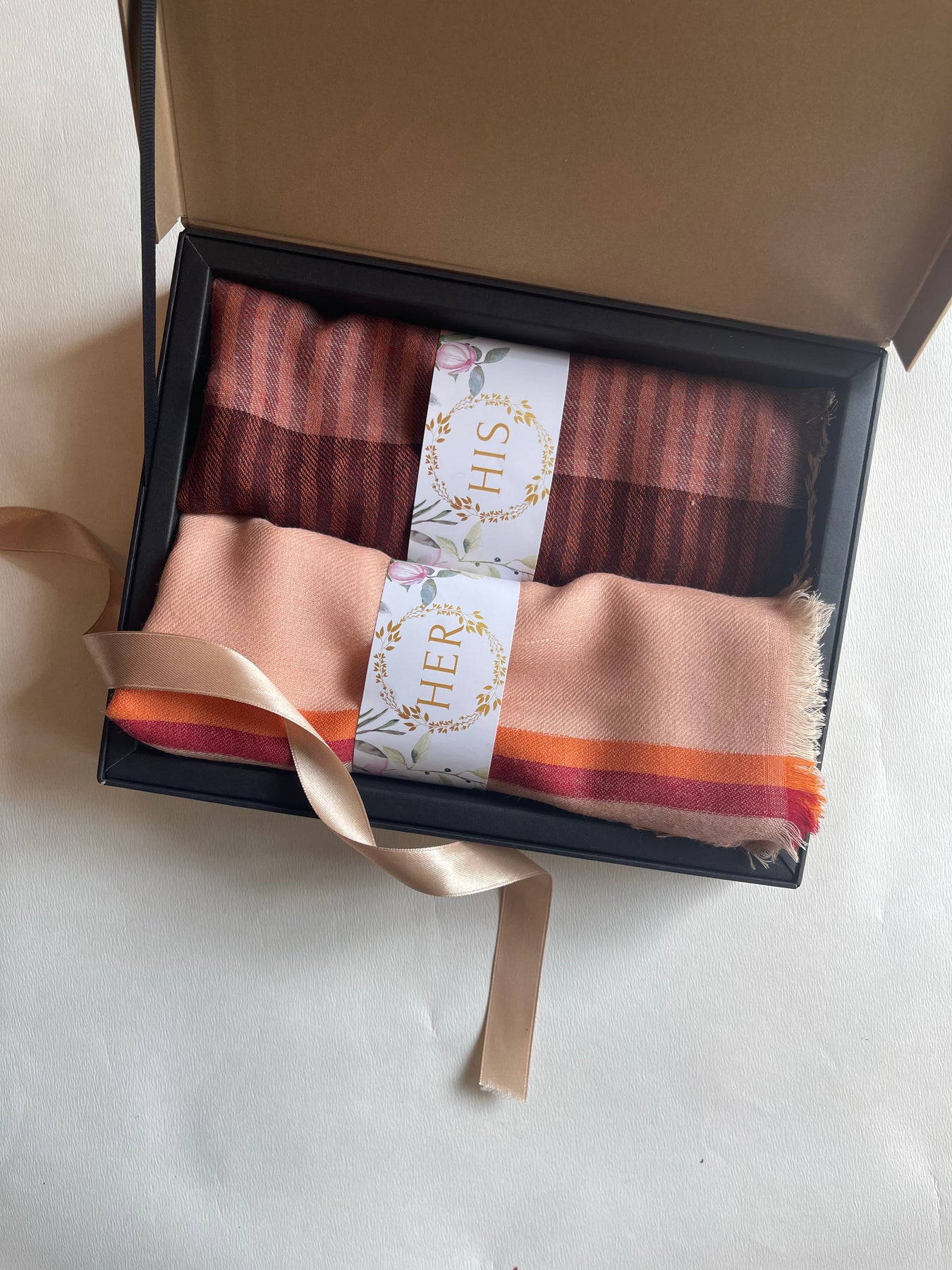 Regular price Rs. 8,000.00A beautiful peach merino stole with a dark colored stripe on the border paired with a luxurious merino striped muffler makes a perfect his and hers set for the festive season.