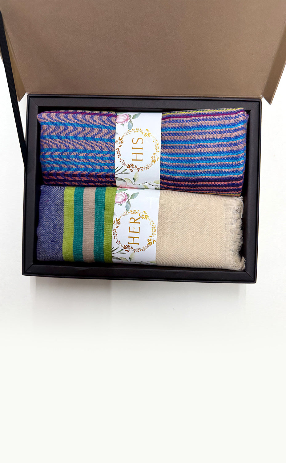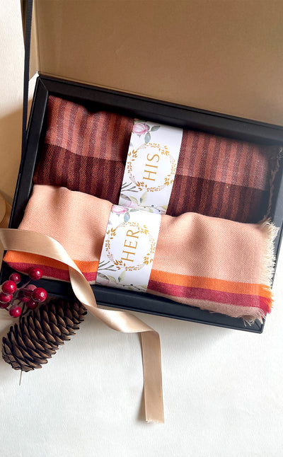 Regular price Rs. 9,000.00Luxurious wool silk stole in blocked design paired with classic merino block striped stole. Make a beautiful his & her set
