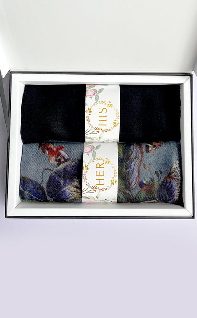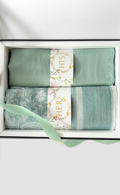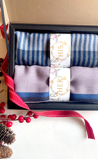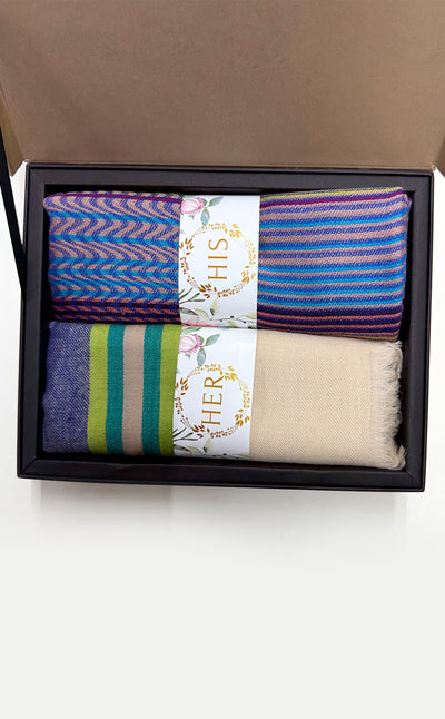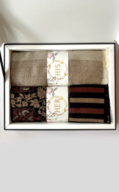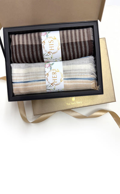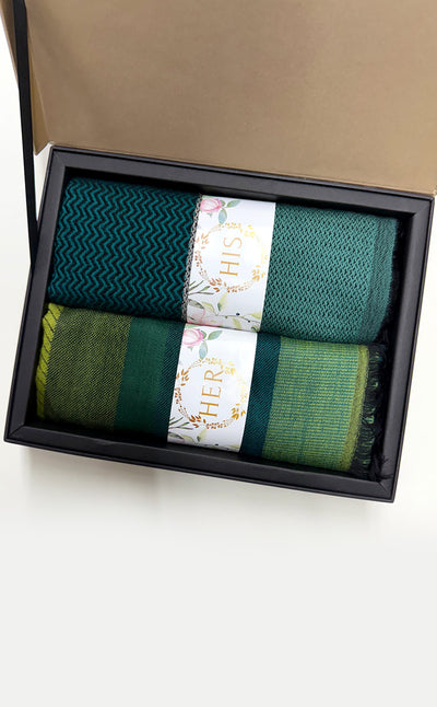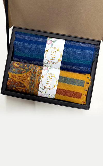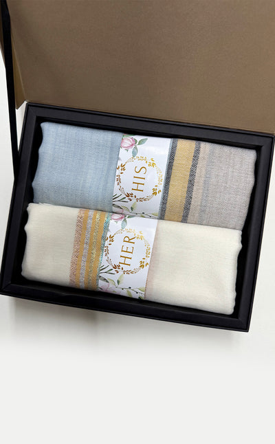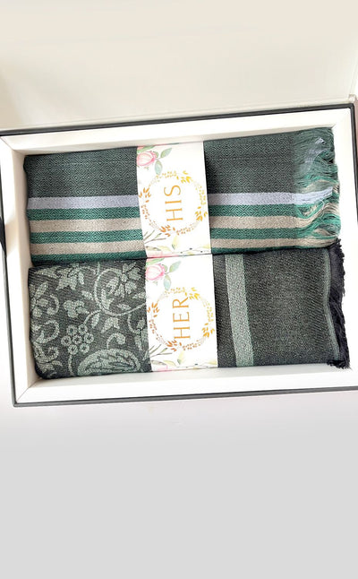Regular price Rs. 5,500.00This elegant set features a luxurious Zari jacquard stole for her and a sea green twill muffler for him. A beautiful wool stole with zari details combined with a rich merino muffler. Makes for elegant, festive gifting!