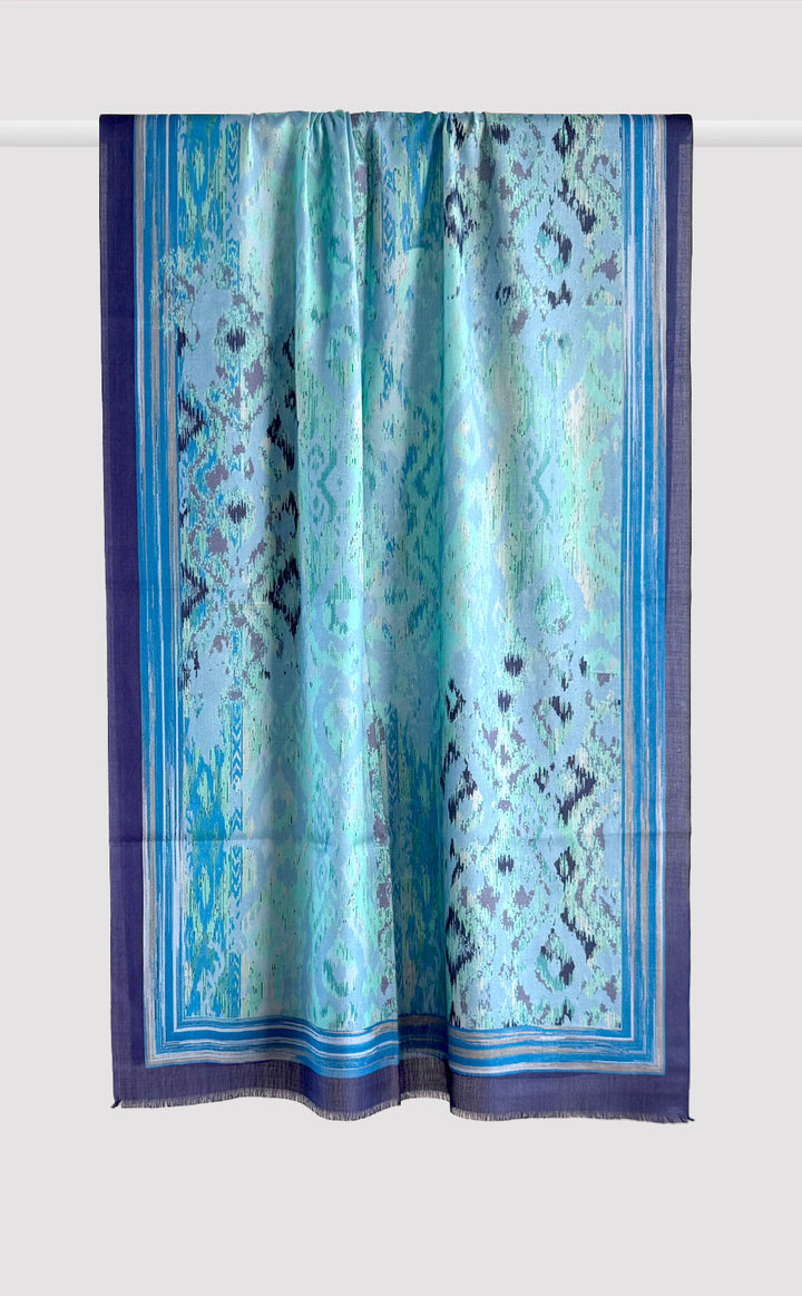 Regular price Rs. 8,500.00Luxurious silk stole with ikat design paired with our lovely egyptian blue wool twill muffler.
