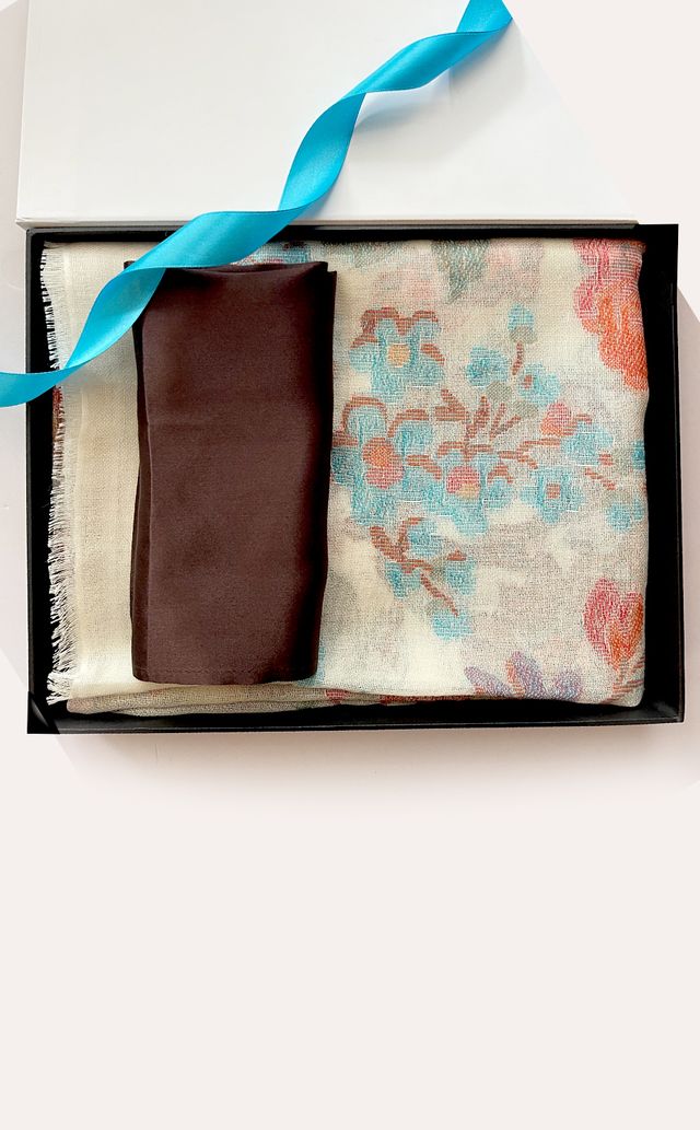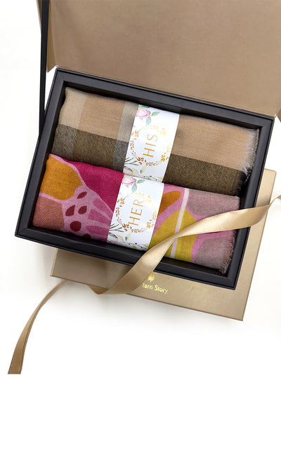 Regular price Rs. 8,000.00A beautiful wool silk stole with a floral design in a blush color paired with a luxurious merino blocked muffler makes a perfect his and hers set for the festive season.