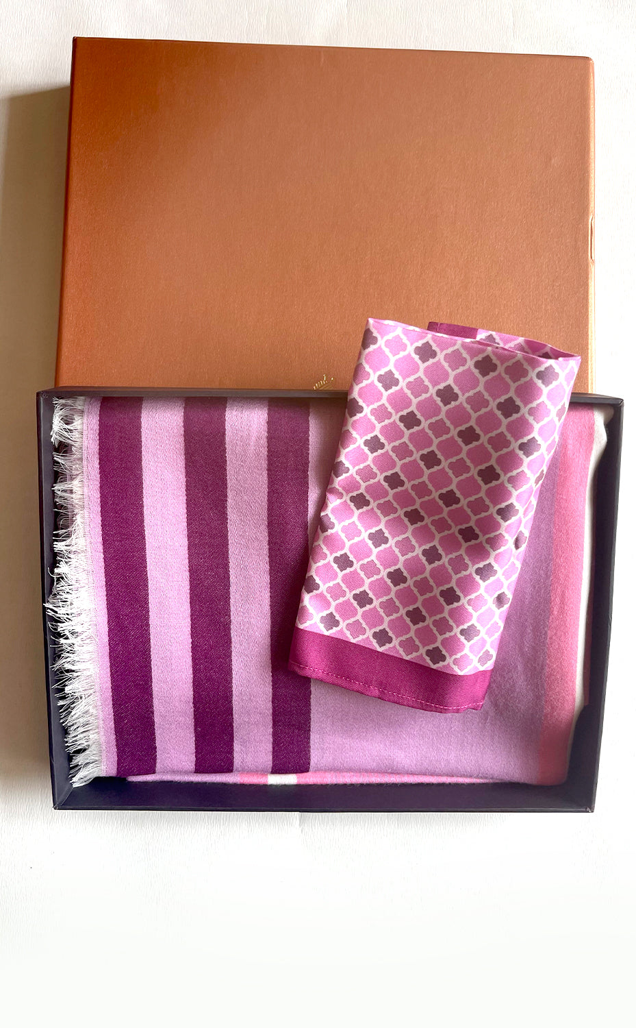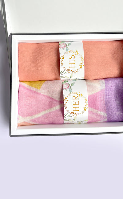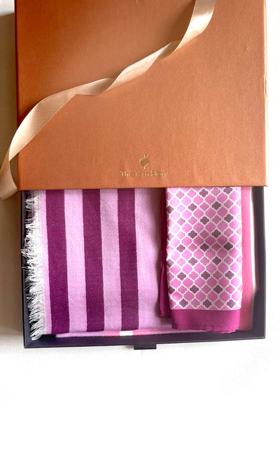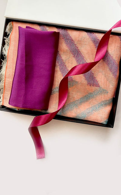 Regular price Rs. 3,100.00A refreshing gift set that includes a beautiful mauve and pink stripes stole and a moroccan designed pocket square