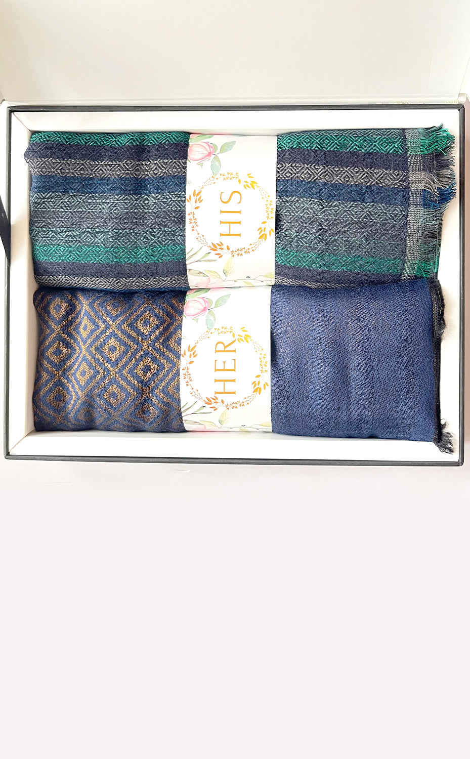 Regular price Rs. 6,500.00A perfectly paired festive winter gift set. A winter zari stolr for Her paired with a classic blue muffler for Him.