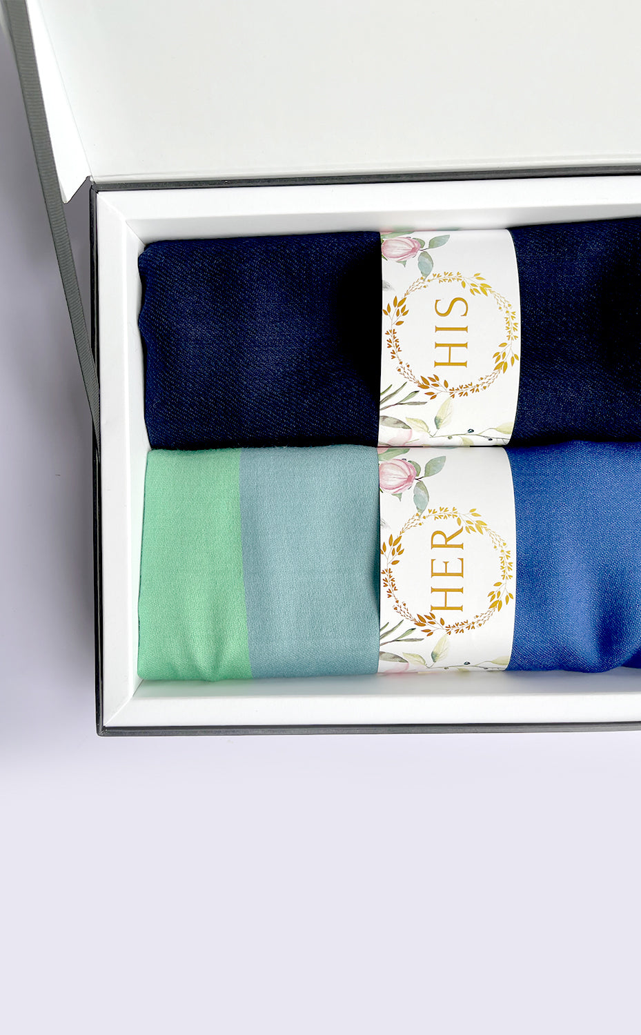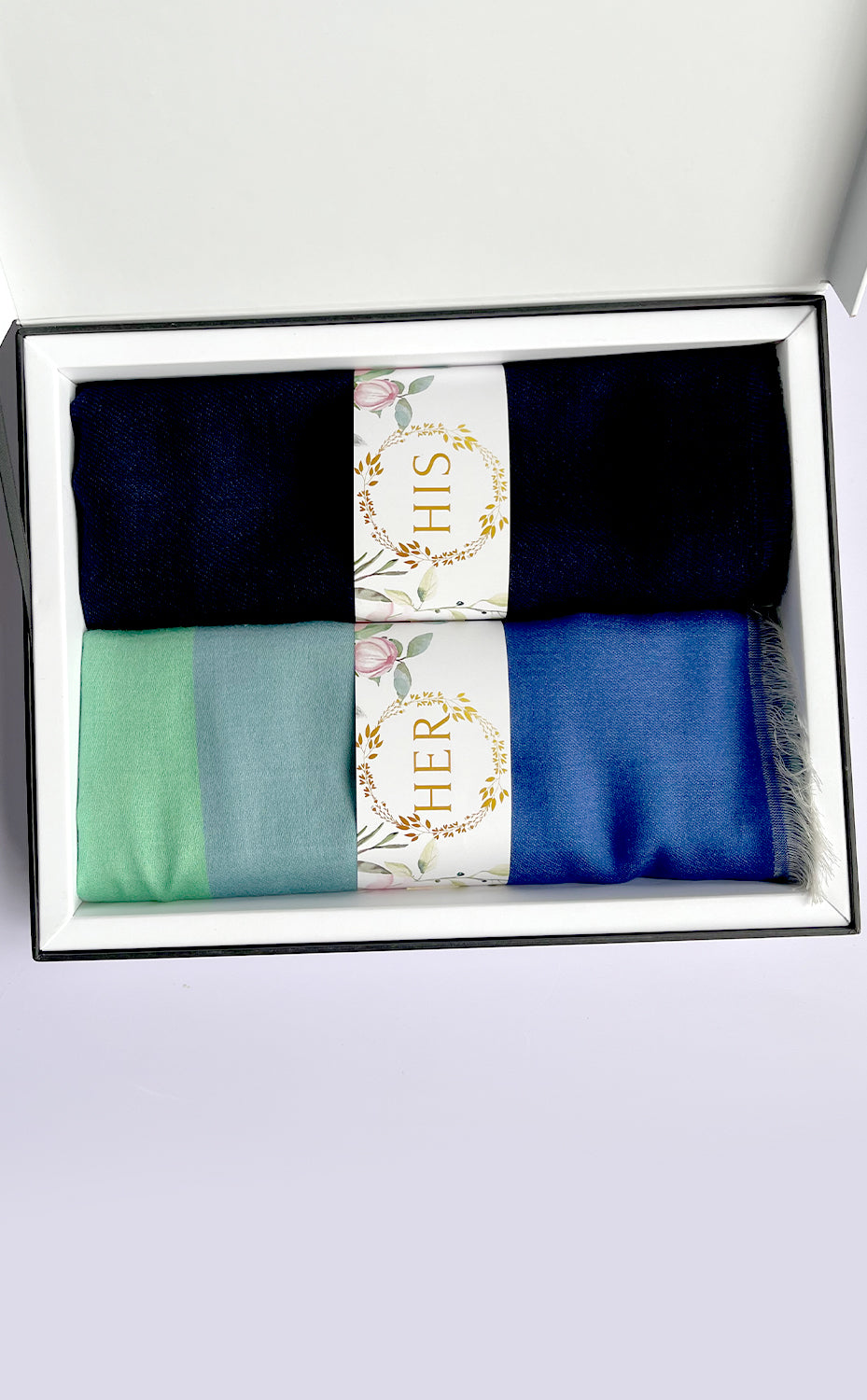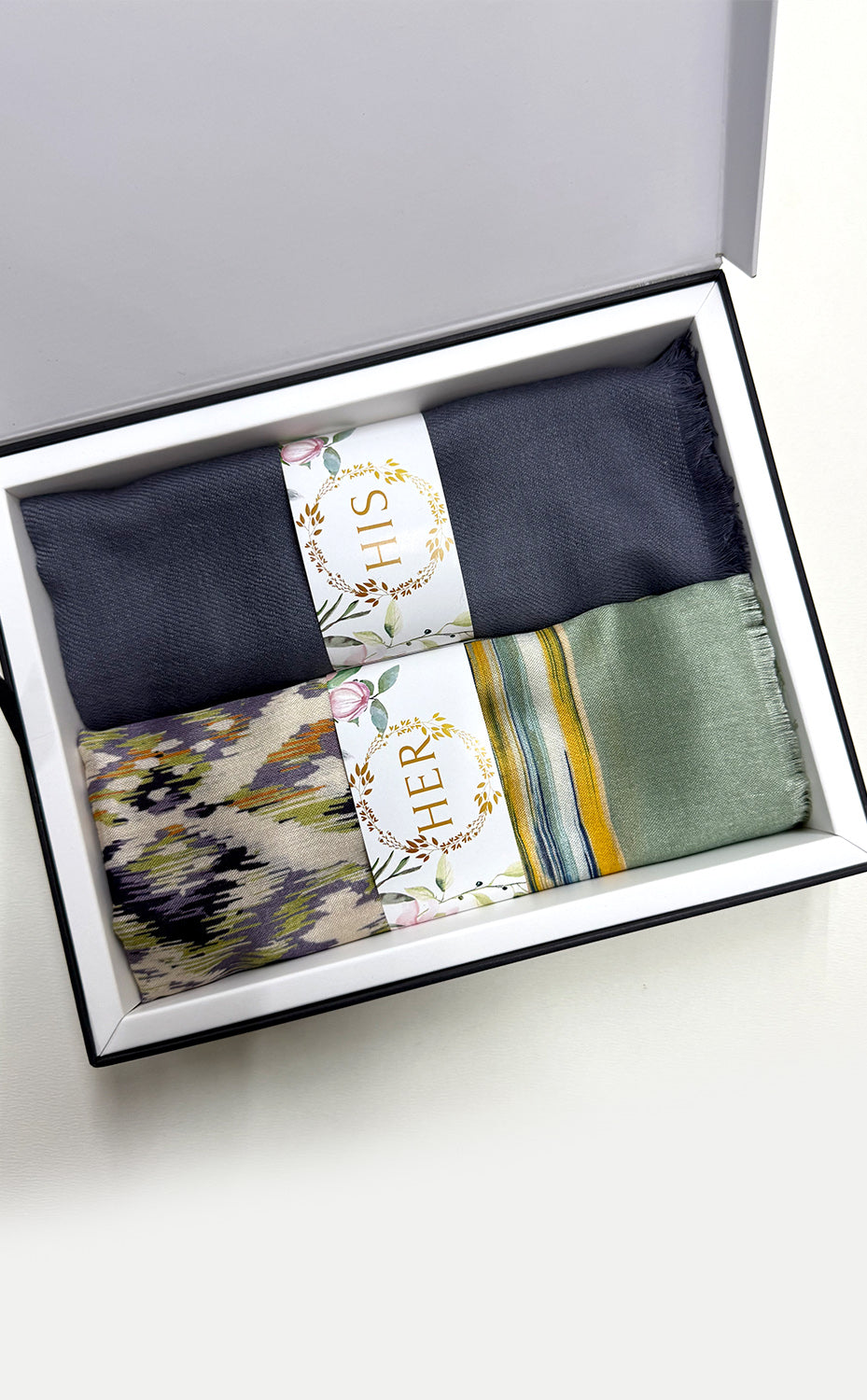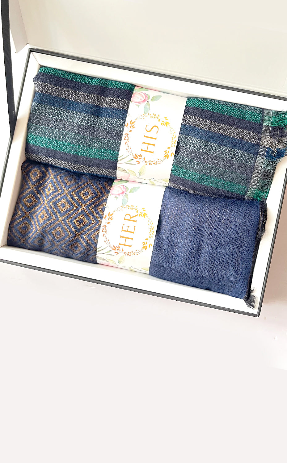 Regular price Rs. 9,500.00A perfectly paired festive winter gift set. A vibrant merino stole for Her paired with a classic maroon stole for Him.