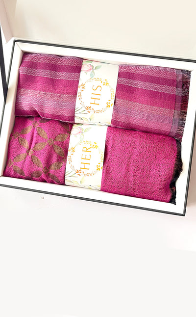 Regular price Rs. 4,200.00Beautiful cotton stole with stripes details in a bright pink color paired luxurious two tone muffler make a perfect his and her set for the festive season.