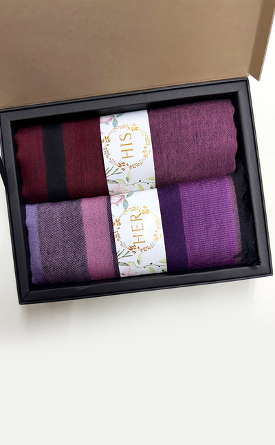 Regular price Rs. 8,000.00A beautiful lavender merino stole with a dark colored stripe on the border paired with a luxurious merino striped muffler makes a perfect his and hers set for the festive season.