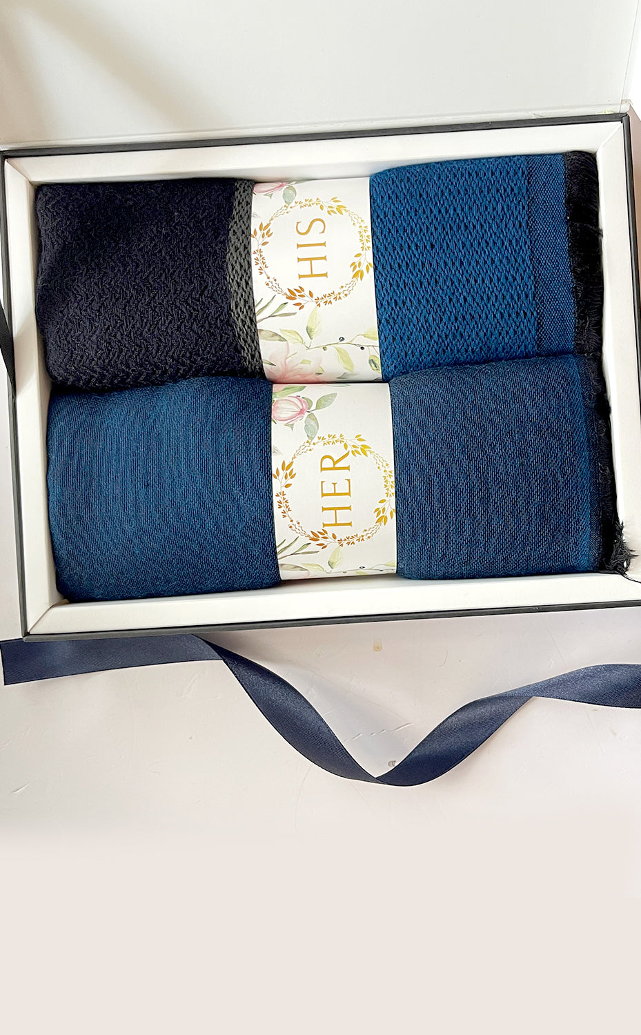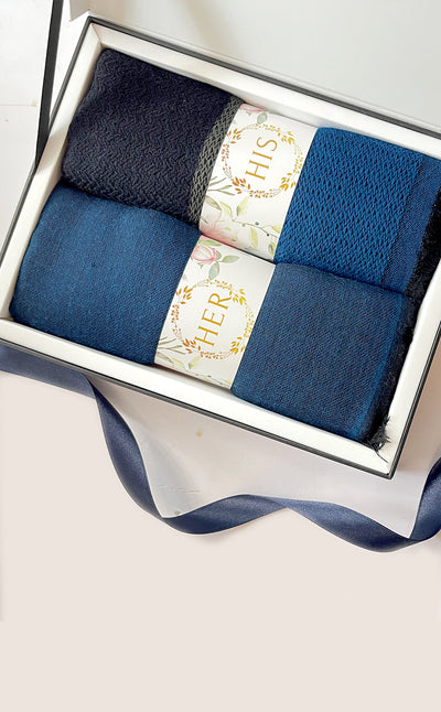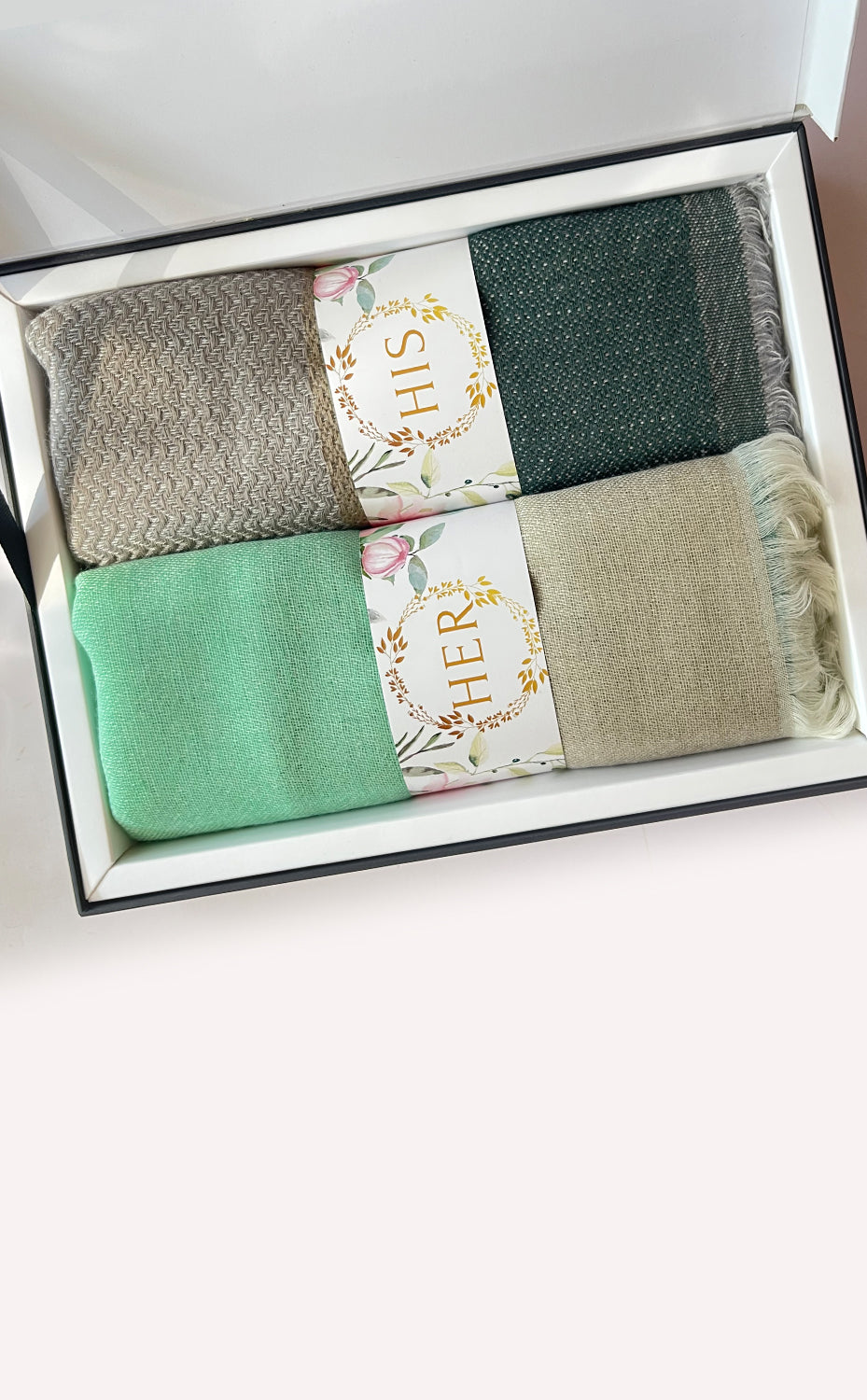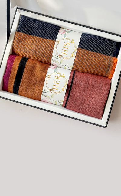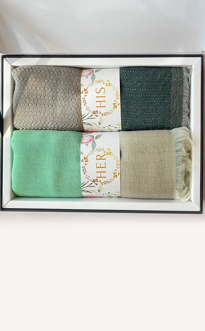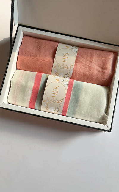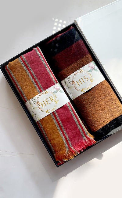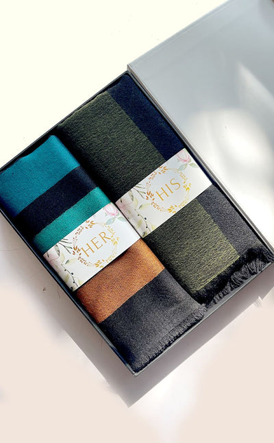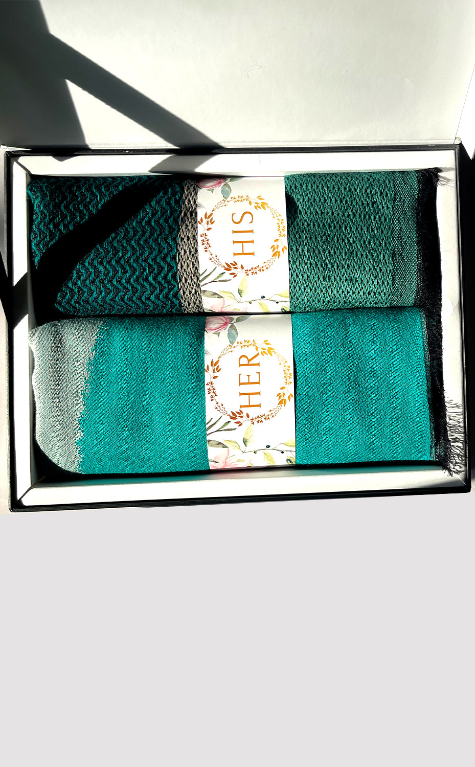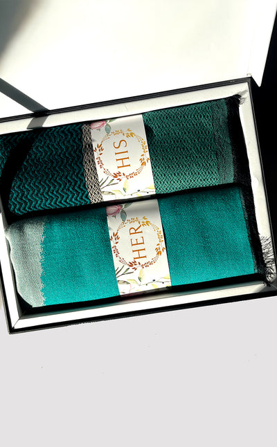 Regular price Rs. 7,500.00This elegant set features a teal two-toned muffler for him and a turquoise Zari border stole for her. A beautiful fine wool stole with zari block details combined with a classic two-toned muffler. Makes for elegant, festive gifting