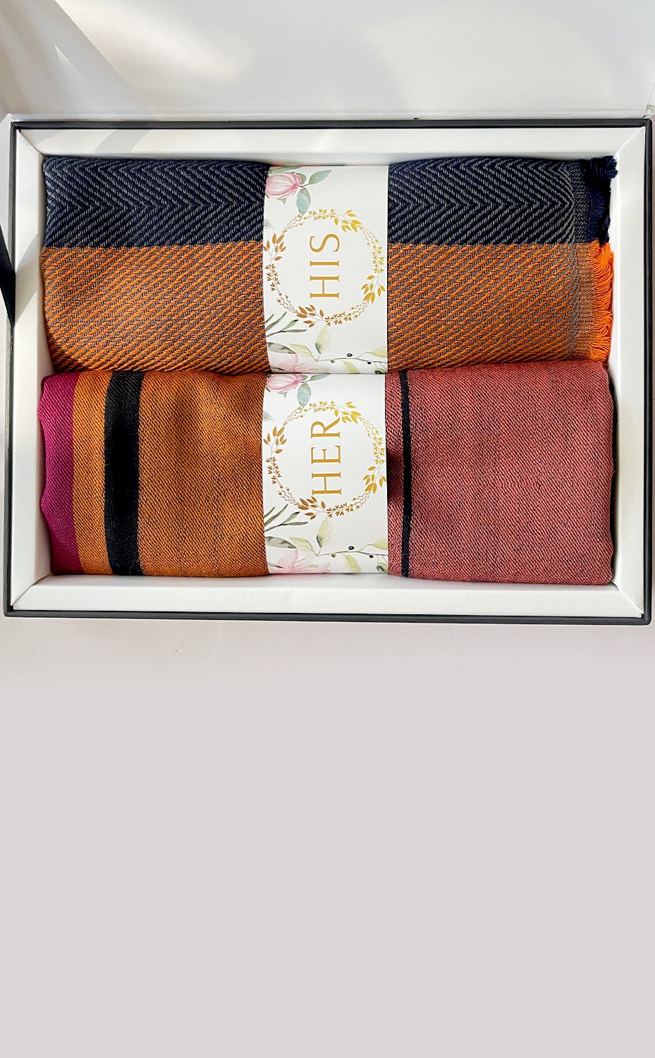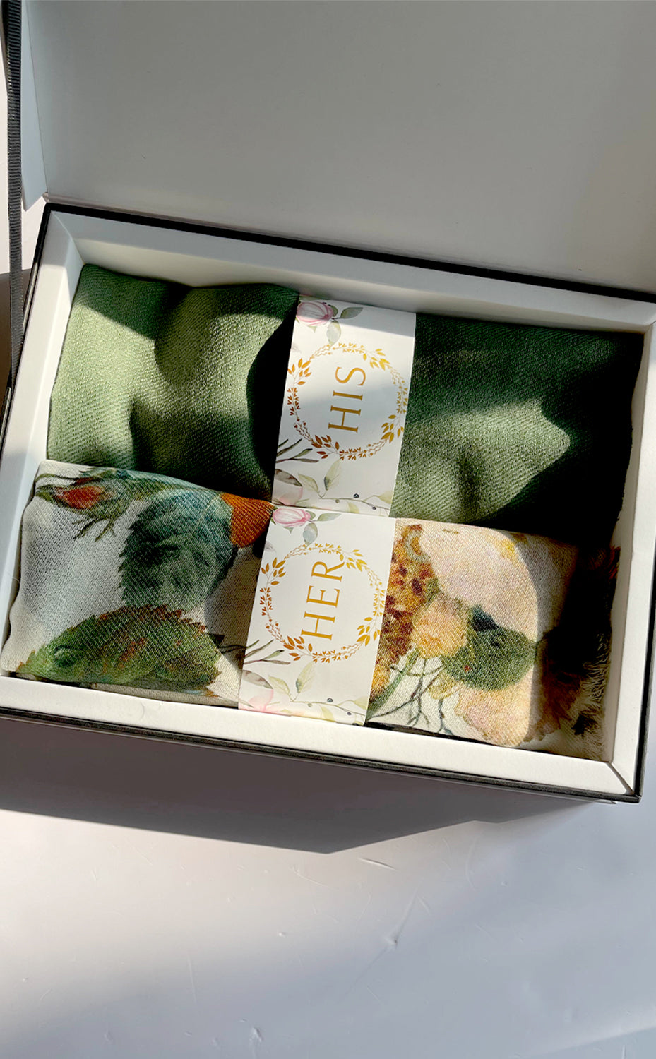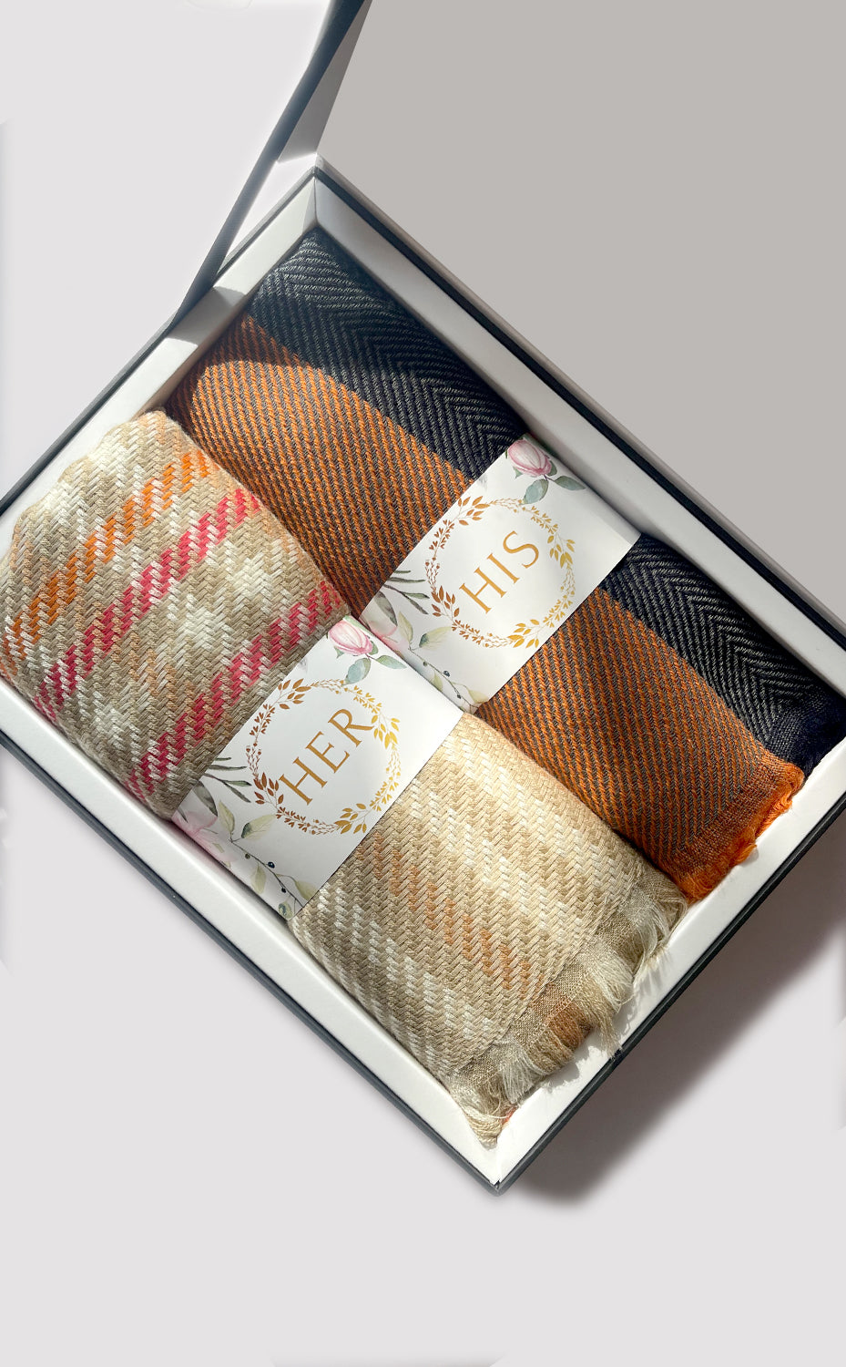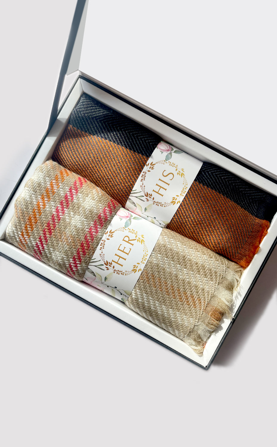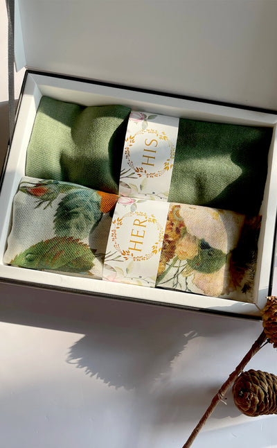 Regular price Rs. 5,100.00Luxurious wool stole in a beautiful screen-printed pattern paired with our lovely dual-tone fine wool muffler. The perfect gift to any couple!