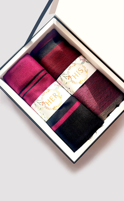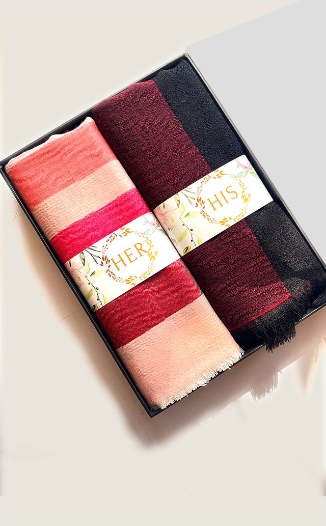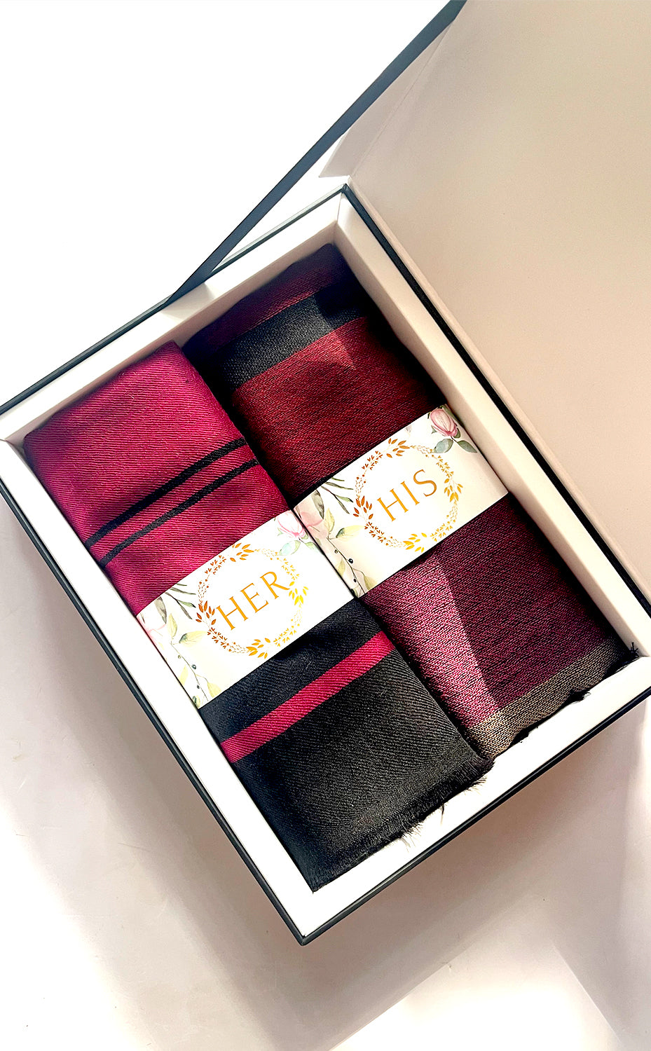 - Her: Maroon merino stripe stole in 100% wool—70 x 180 cm