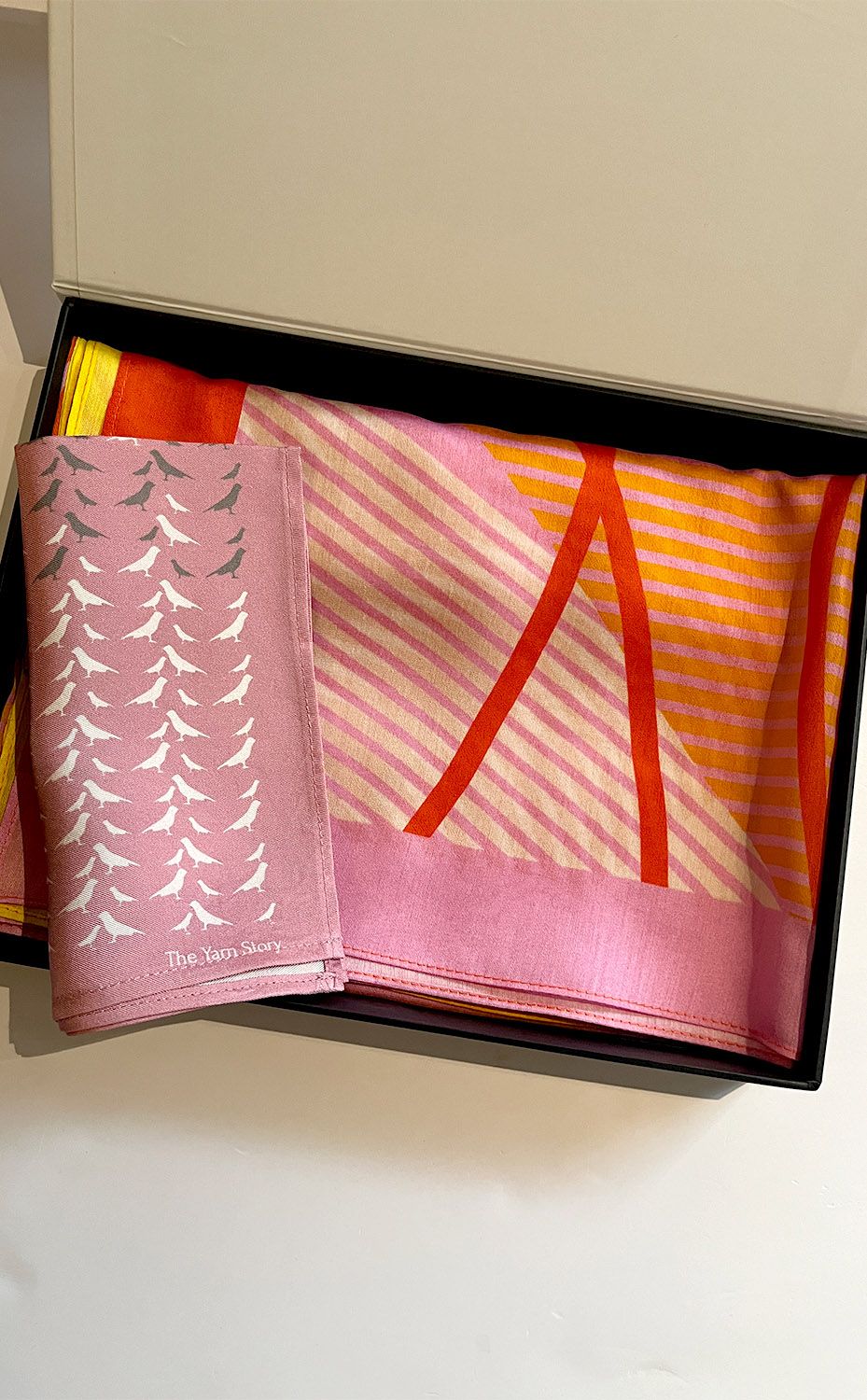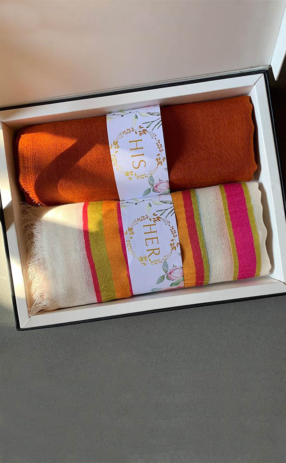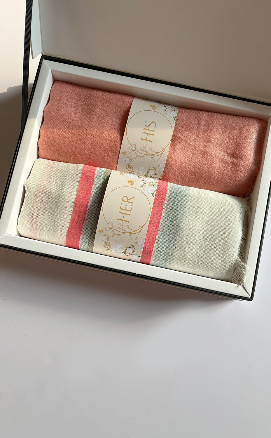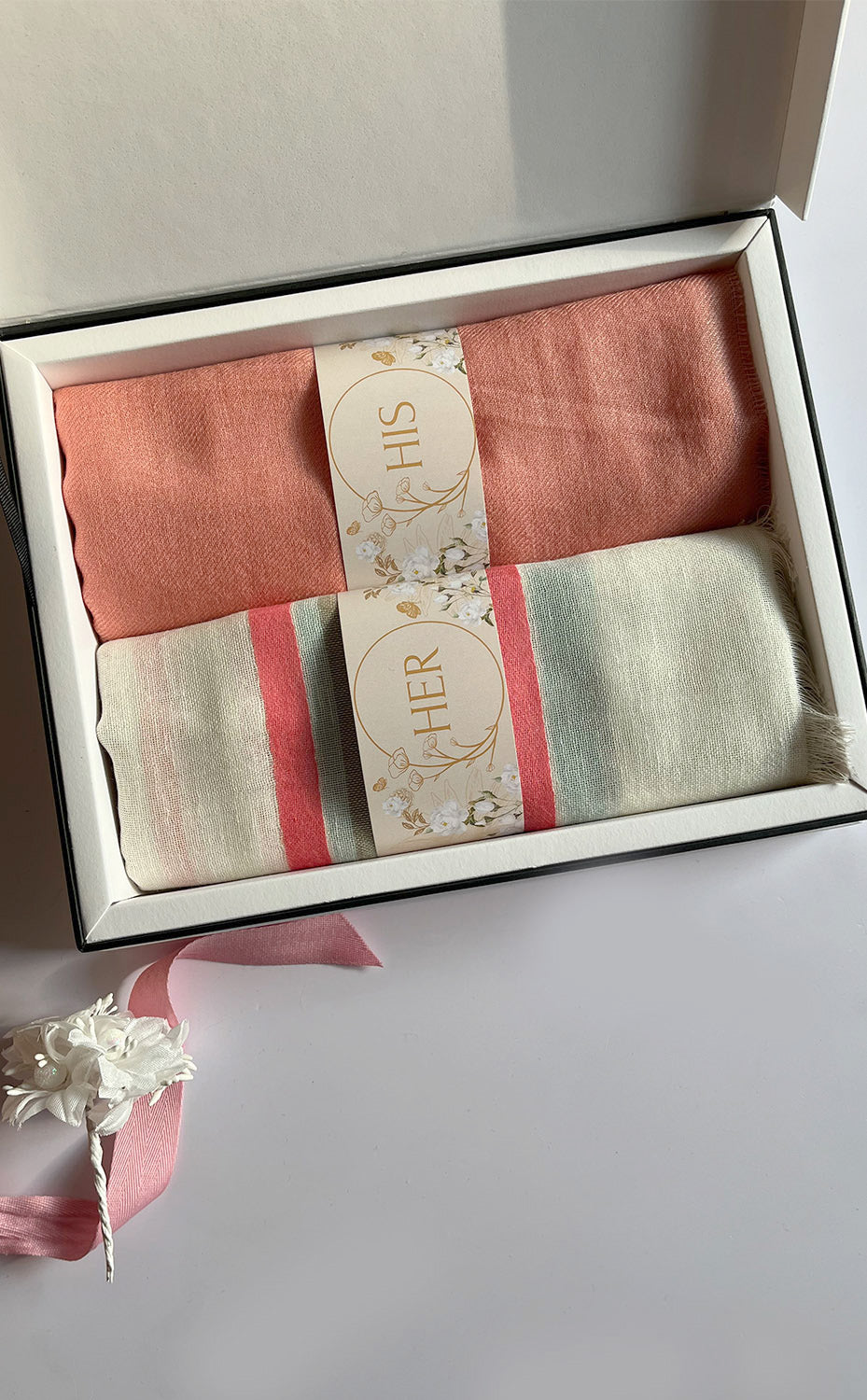 Regular price Rs. 3,800.00This vibrant set features a tangerine contour scarf for her and a pastel mauve dove pocket square for him, creating a striking and modern pairing. The contrasting colors and unique patterns makes this duo perfect for festive gifting!