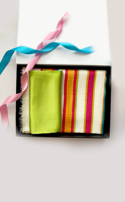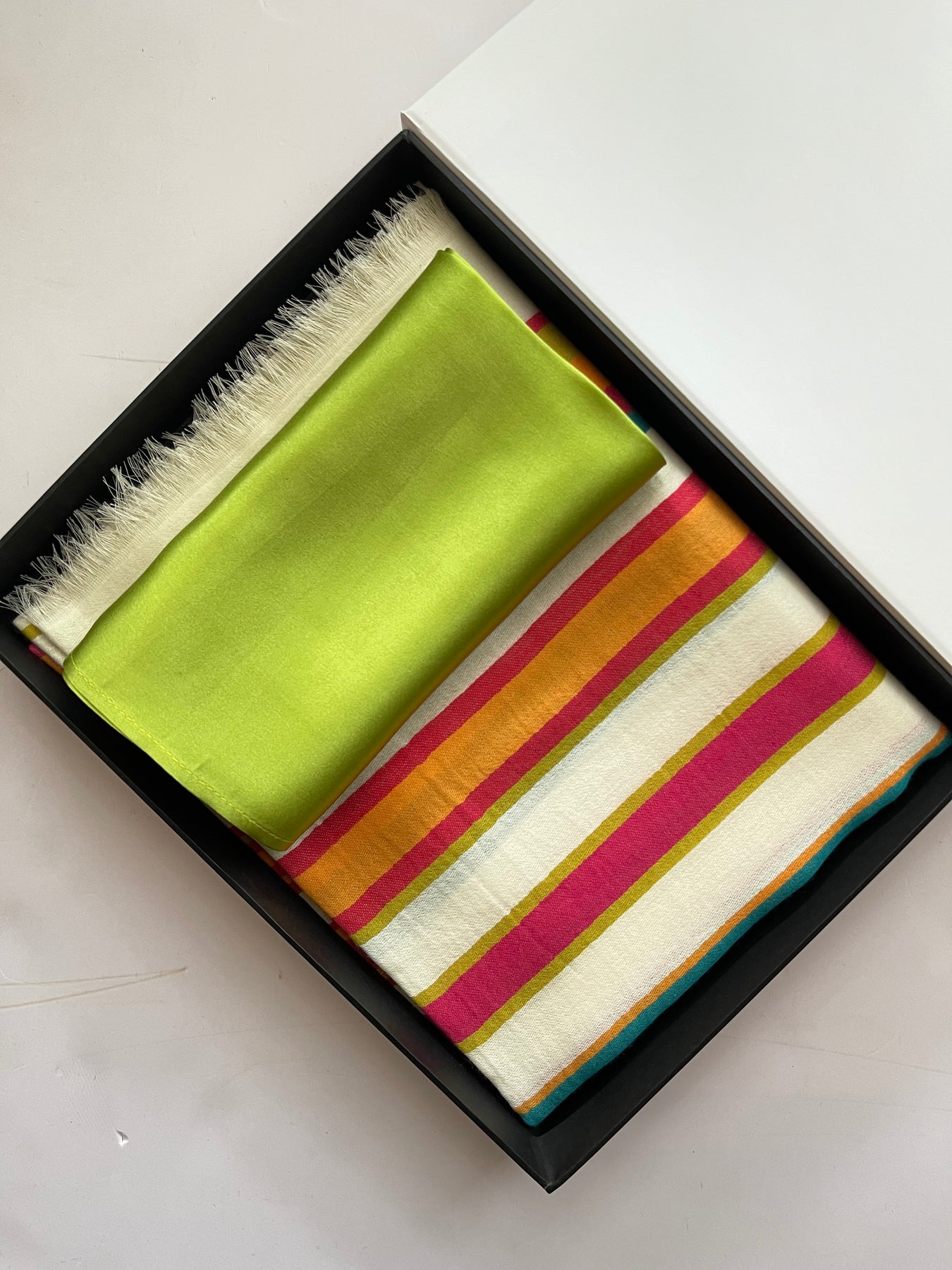 Regular price Rs. 3,100.00A refreshing summer gift set that includes a beautiful white and multicolored stripes stole and a lime-colored pocket square