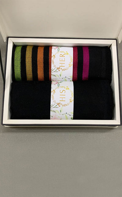 Regular price Rs. 6,500.00Luxurious textured woven merino wool stole in black base and contrasting hues & fine wool twill muffler, with one tone color. Make a beautiful his & her set