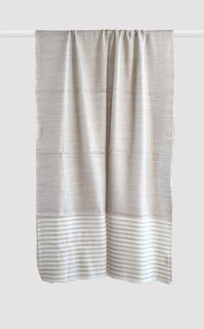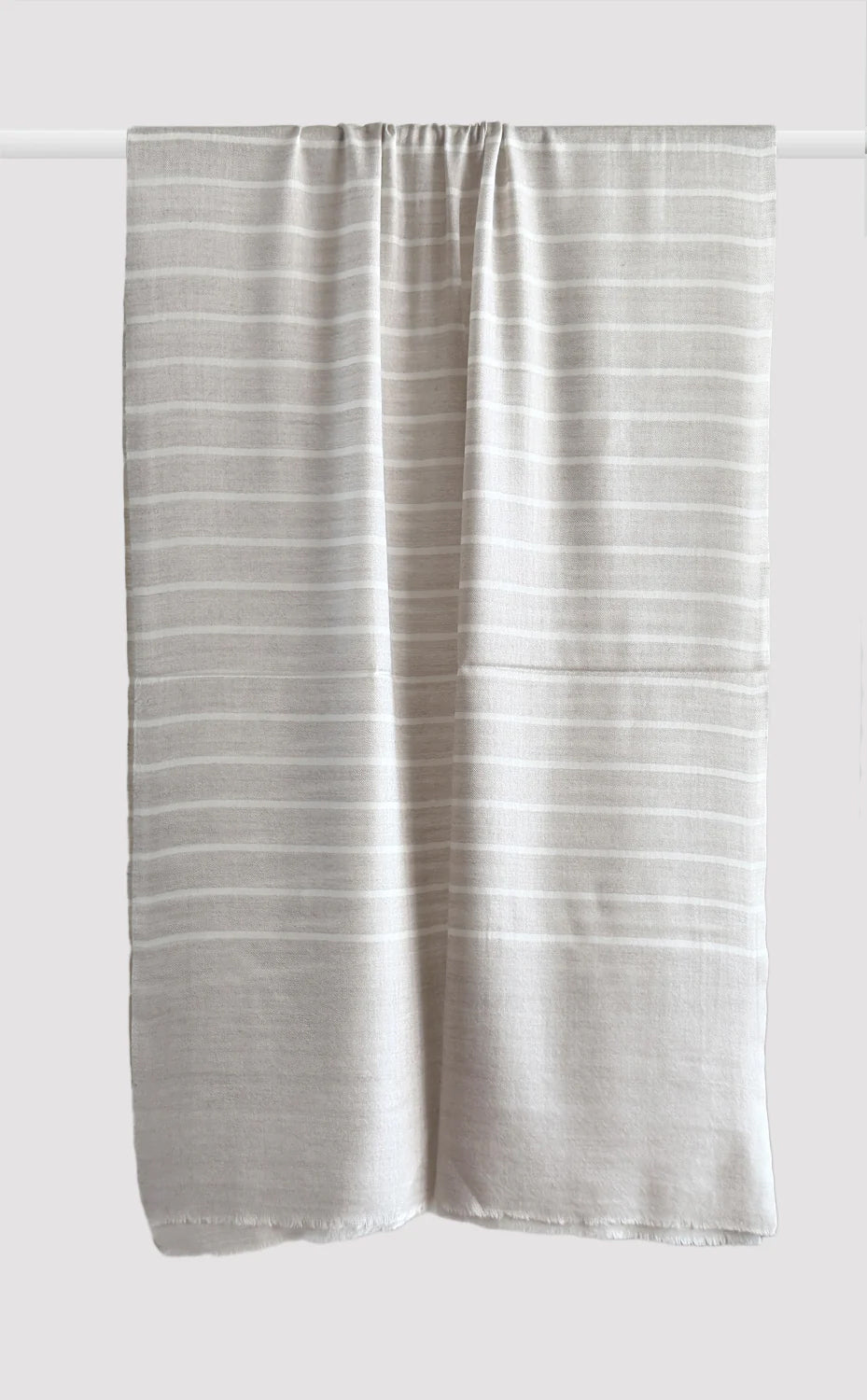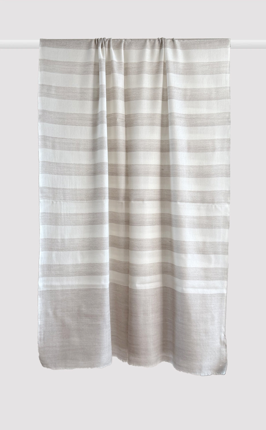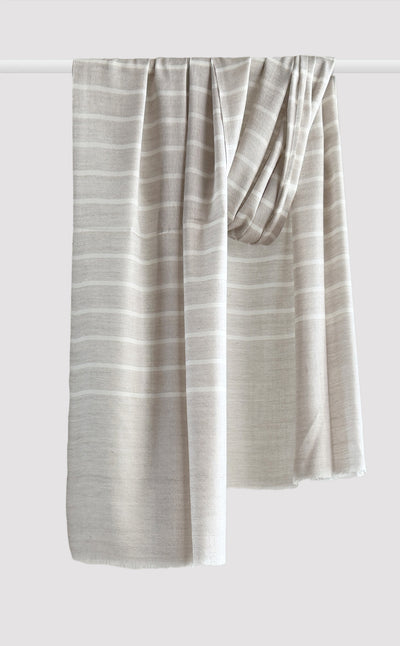 Luxurious fine wool stole in grey tone with subtle white stripes. Fine wool blended with silk gives it an ultra soft & cosy feel
