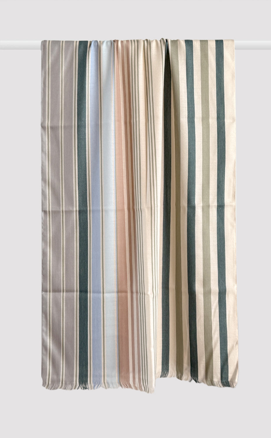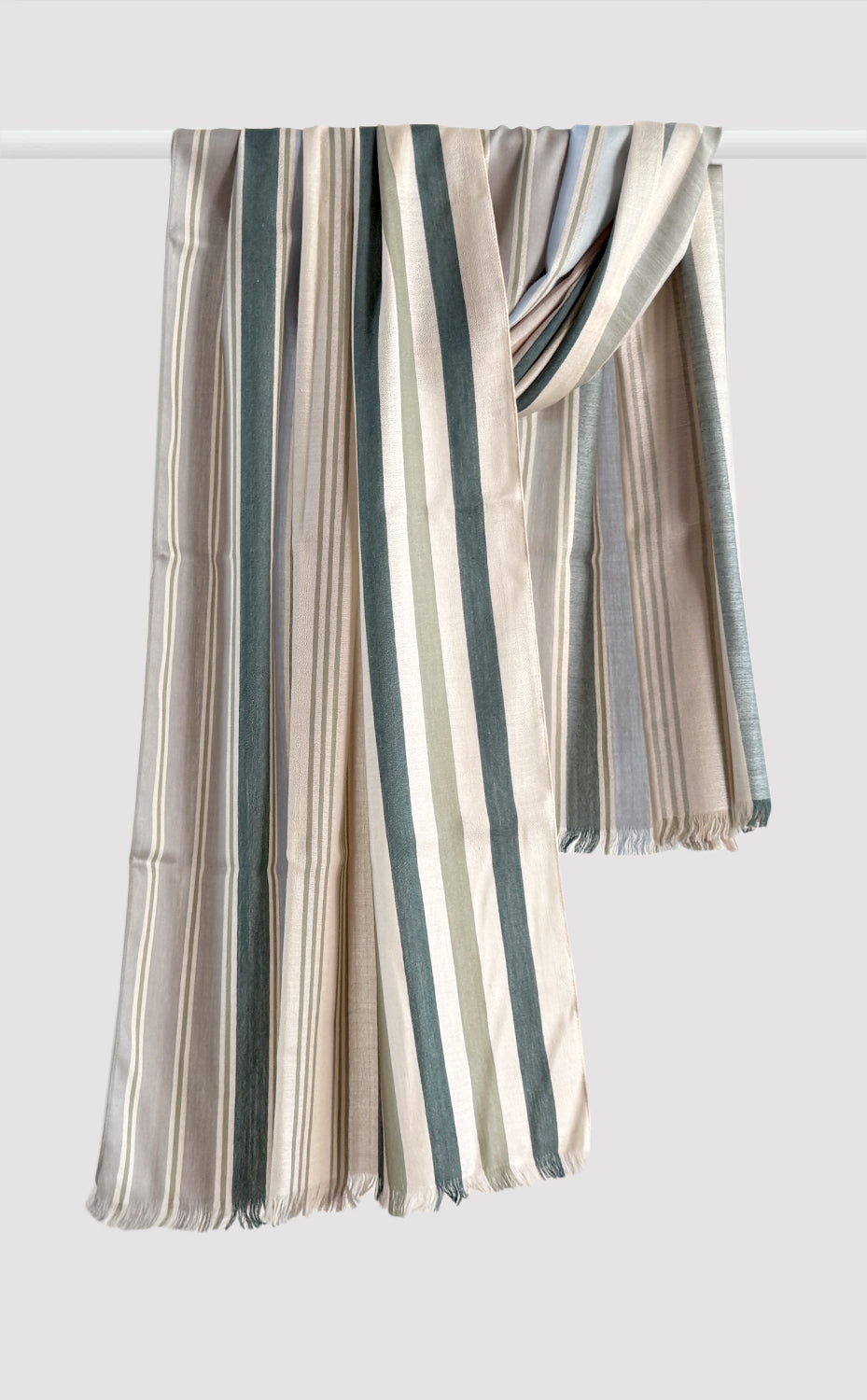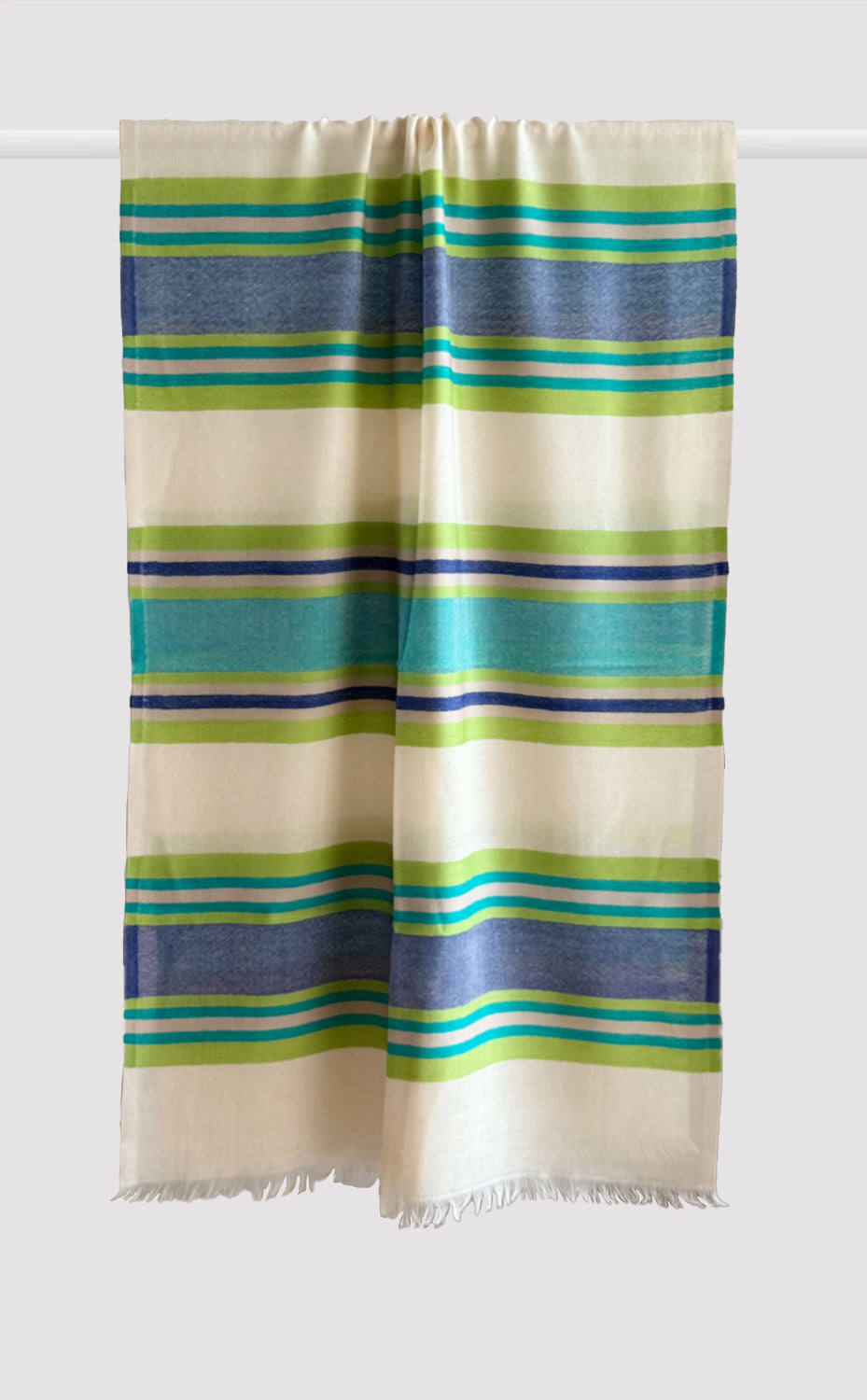 Regular price Rs. 6,000.00This is a stole made from merino wool featuring a vibrant striped pattern in shades of white, beige, dusty blue, and green. The alternating wide and narrow stripes give it a dynamic and elegant look. The stole is lightweight, soft, and warm, making it perfect for both casual and formal occasions. Its versatile design can complement a variety of outfits, adding a touch of sophistication and color