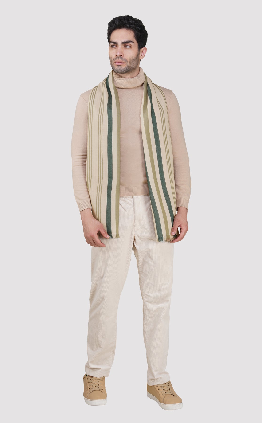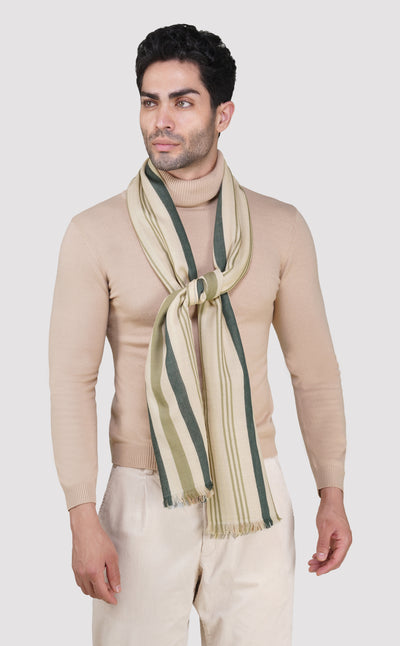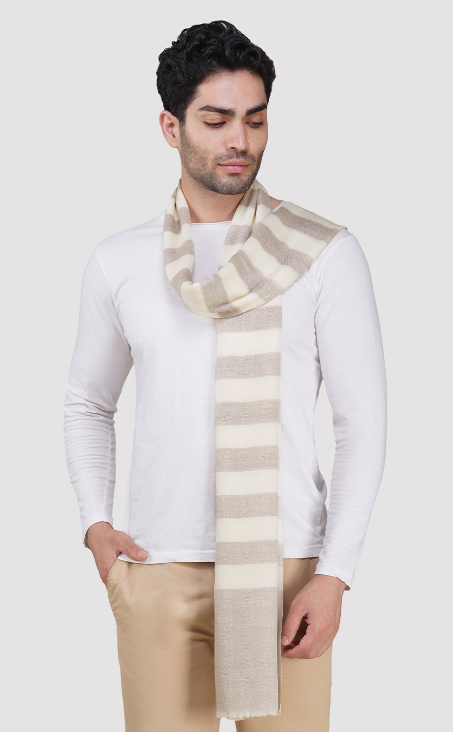 Regular price Rs. 6,000.00This is a stole made from merino wool featuring a vibrant striped pattern in shades of white, beige, dusty blue, and green. The alternating wide and narrow stripes give it a dynamic and elegant look. The stole is lightweight, soft, and warm, making it perfect for both casual and formal occasions. Its versatile design can complement a variety of outfits, adding a touch of sophistication and color