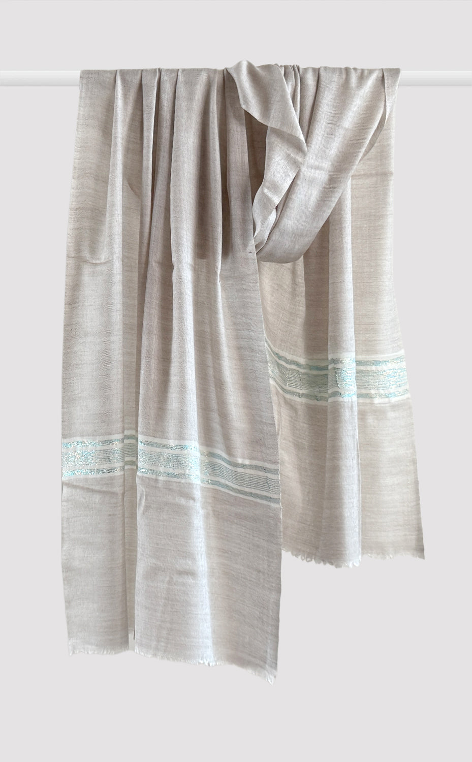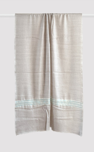 Regular price Rs. 5,500.00Luxurious fine wool stole in cream tone with beautiful aqua zari stripes. Fine wool blended with silk gives it an ultra soft & cosy feel