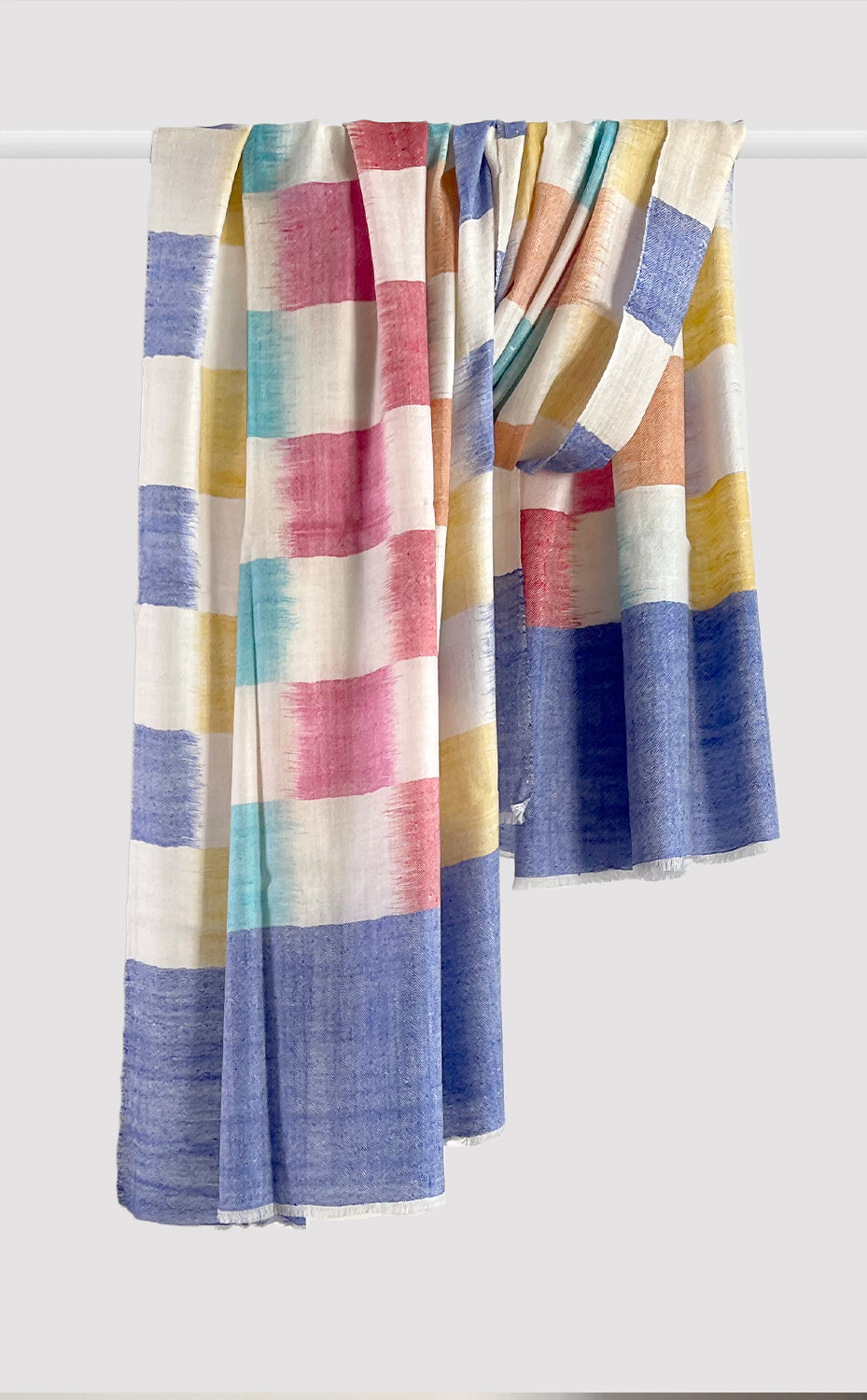 Regular price Rs. 5,000.00This design creates a visually captivating and harmonious blend of vibrant colours and texture. Featuring a series of asymmetrical stripes in hues seamlessly woven together adding depth and dimension to the shawl. Each piece is crafted using fine merino wool with a textured feel perfect for winter