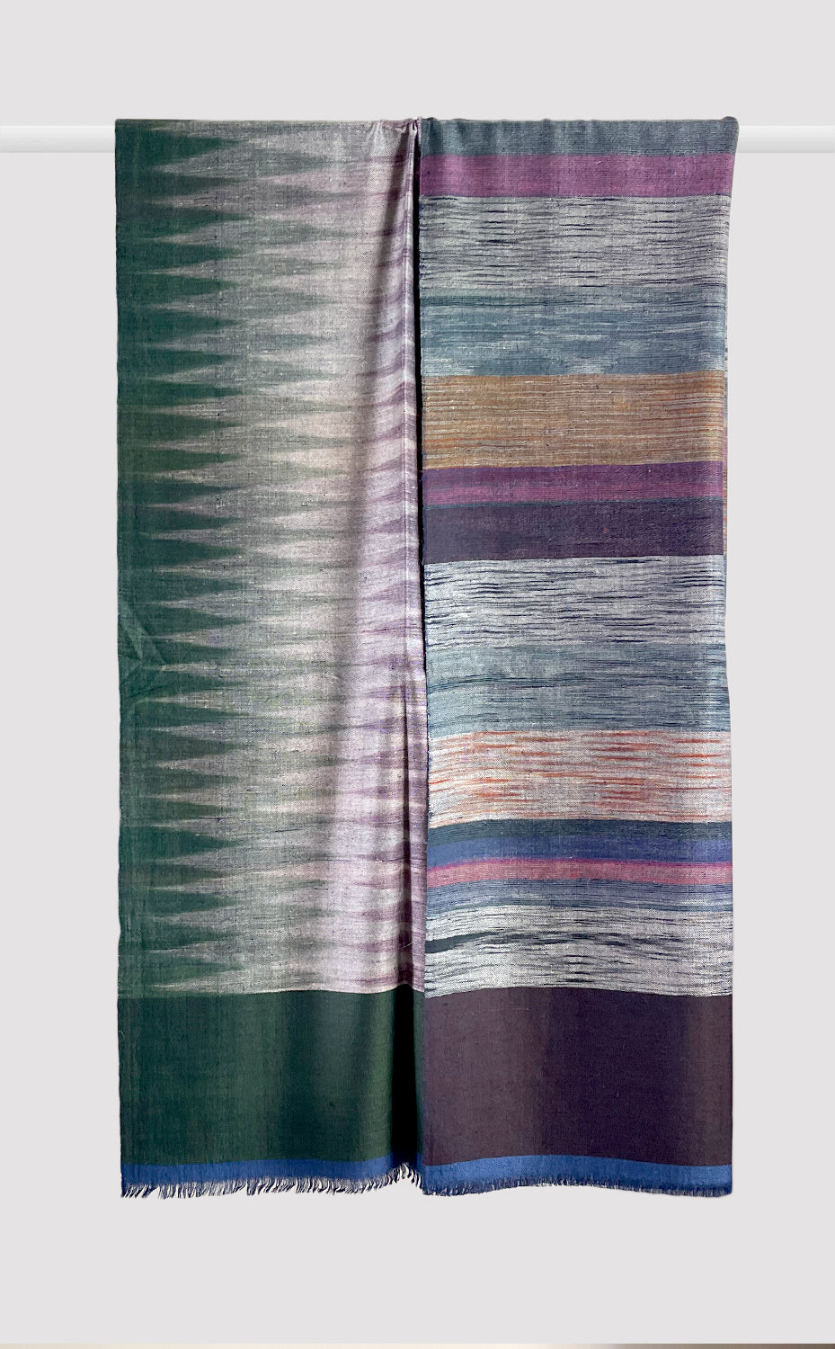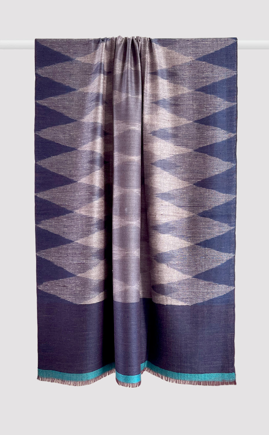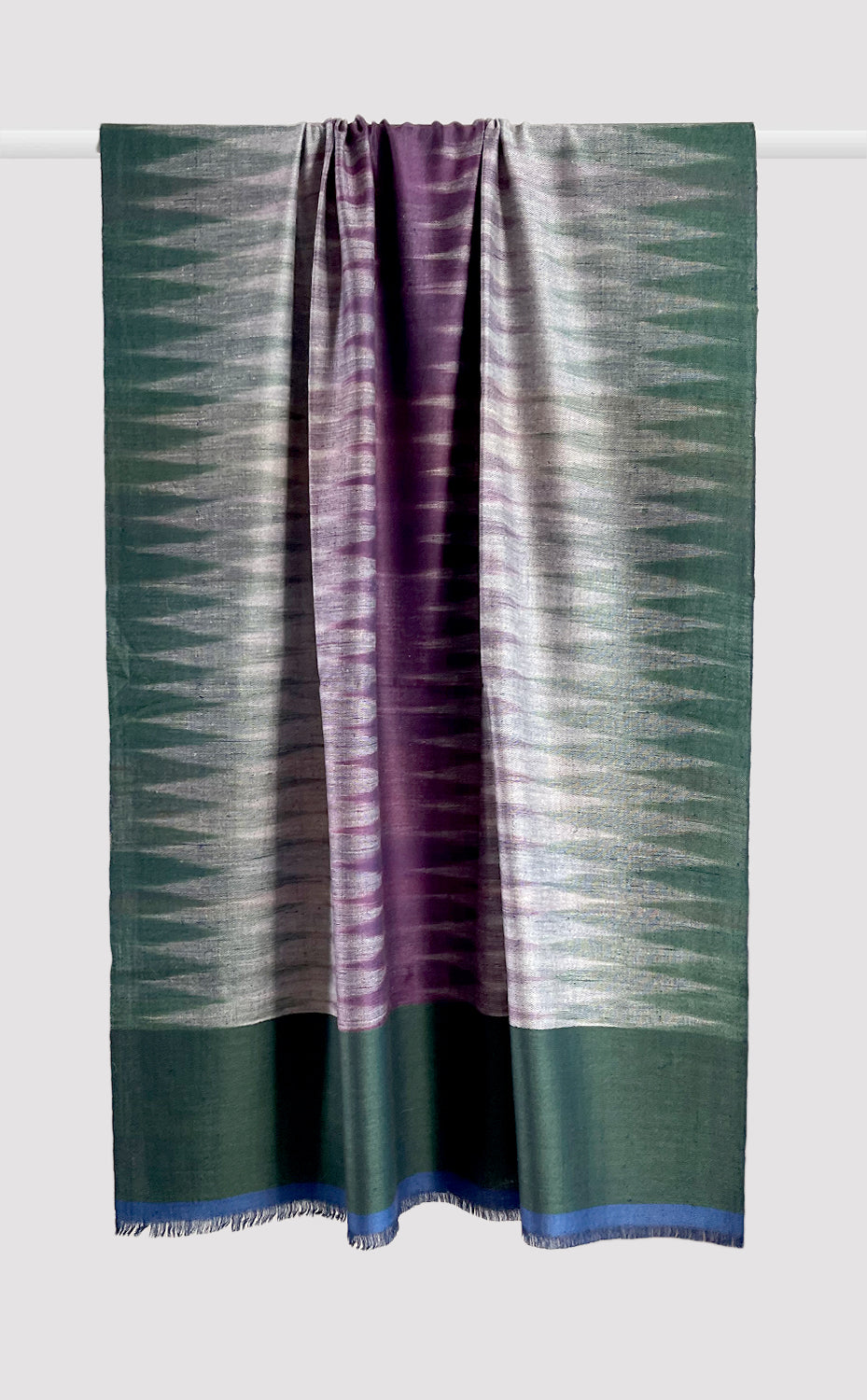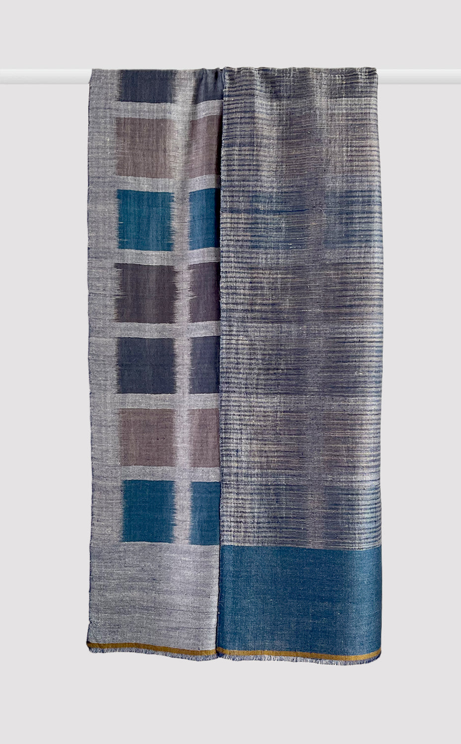 Regular price Rs. 60,000.00Made in Kashmir from natural & organically sourced wool pashmina, these shawls are pure and magical. The ultra fine fabric with purple and navy ikat stripes and reversible back makes for an elegant shawl for men & women. Each piece is handmade by our artisan in the heart of Kashmir