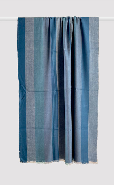 Regular price Rs. 24,000.00Made in Kashmir from natural & organically sourced wool pashmina, these shawls are pure and magical. The ultra fine fabric with blue ikat stripes and reversible back makes for an elegant stole for men & women. Each piece is handmade by our artisan in the heart of Kashmir
