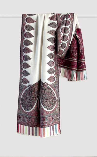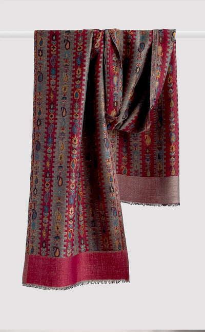 Regular price Rs. 24,000.00Made in Kashmir from natural & organically sourced wool pashmina, these shawls are pure and magical. The ultra fine fabric with burgundy ikat stripes and reversible back makes for an elegant stole for men & women. Each piece is handmade by our artisan in the heart of Kashmir