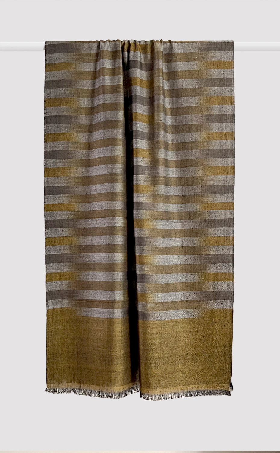 Regular price Rs. 40,000.00Made in Kashmir from natural & organically sourced wool pashmina, these shawls are pure and magical. The ultra fine fabric with honey color ikat stripes and reversible back makes for an elegant shawl for men & women. Each piece is handmade by our artisan in the heart of Kashmir