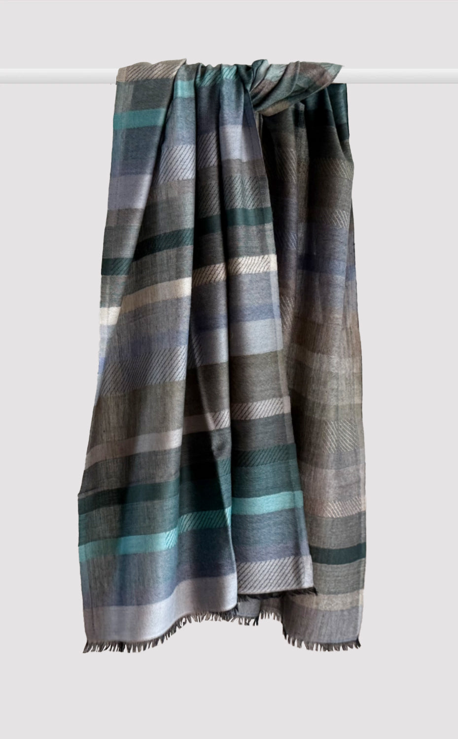 Luxurious fine wool stole in grey with a contrasting block stripes. The fine wool blended with silk gives it an ultra soft & cosy feel
