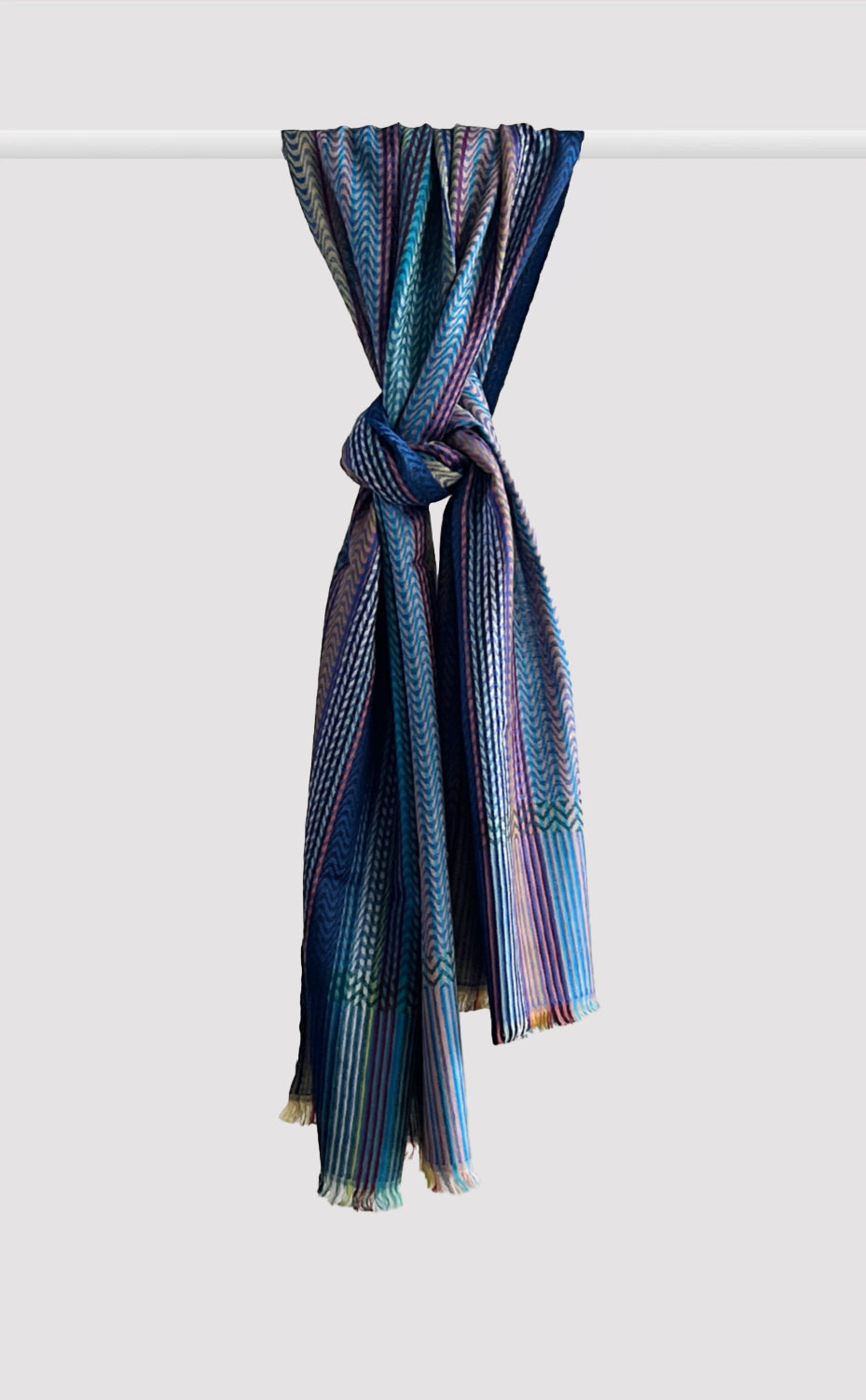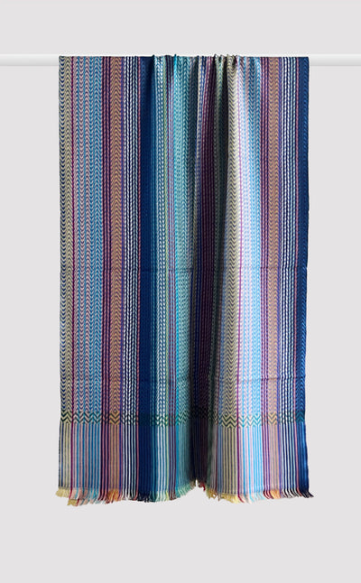 Regular price Rs. 4,000.00This design creates a visually captivating and harmonious blend of vibrant colours and texture. Featuring a series of asymmetrical stripes in hues seamlessly woven together adding depth and dimension to the shawl. Each piece is crafted using fine merino wool with a textured feel perfect for winter
