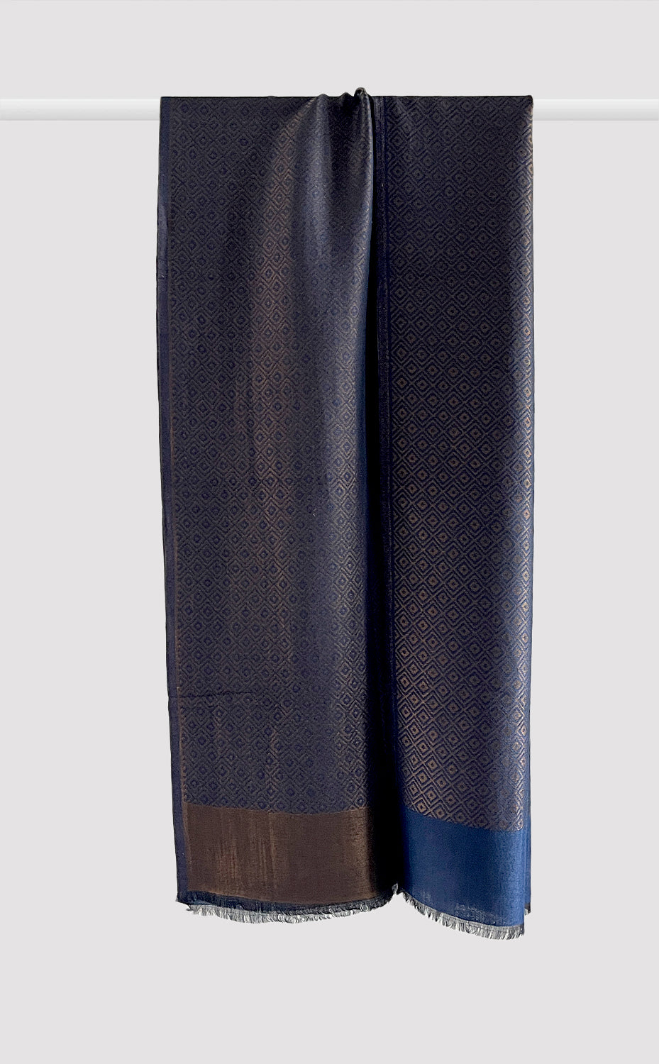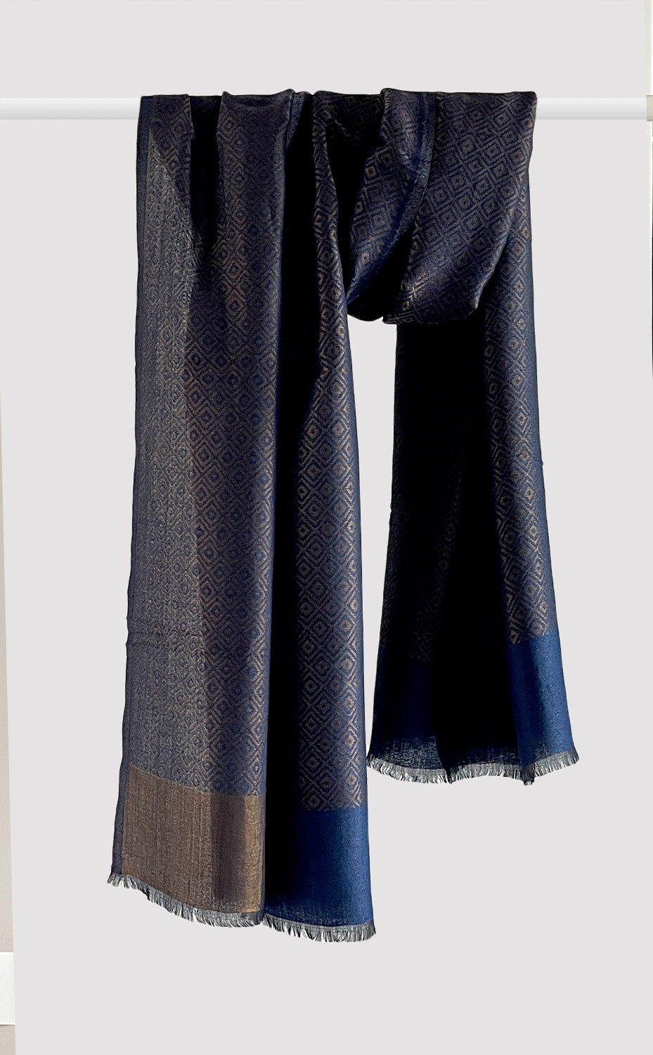 Regular price Rs. 6,000.00 Sale price Rs. 4,200.00 Save 30%Luxurious fine wool stole in a festive navy shade and zari geometric design. The all over woven zari gives a seamless & elegant festive look. The perfect accessory for the festive winter season that will elevate all your outfits