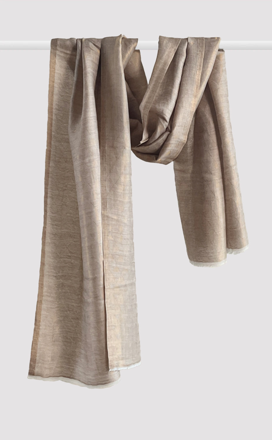 Regular price Rs. 9,600.00Luxurious fine wool shawl in beige with contrasting gold zari stripes. The fine wool blended with silk gives it an ultra soft & cozy feel