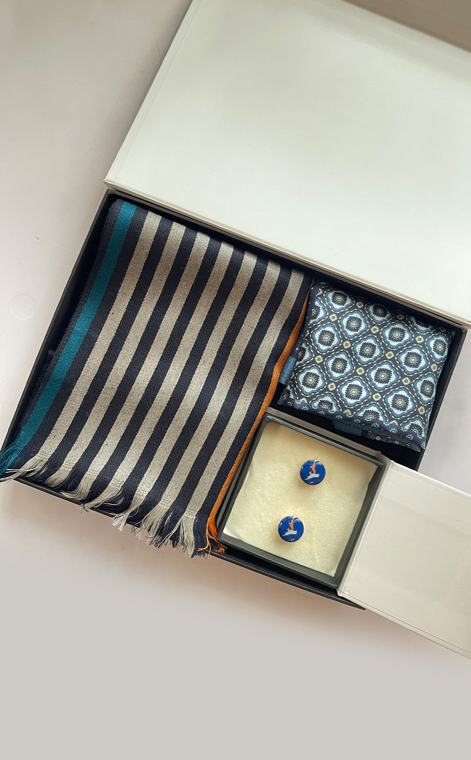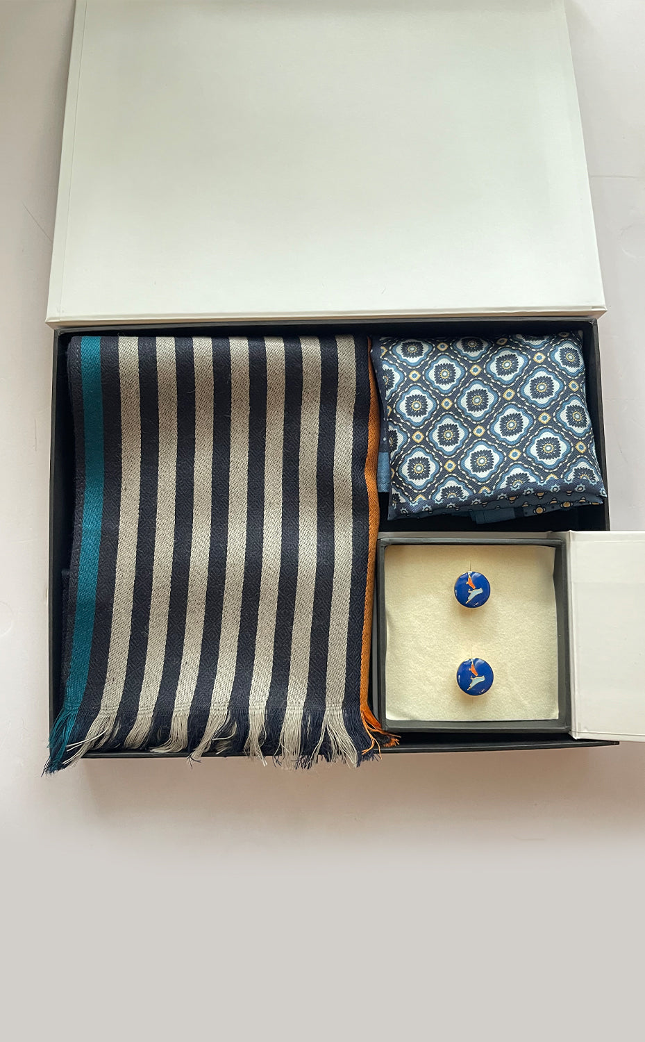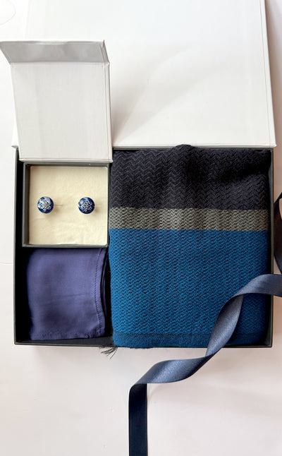 Regular price Rs. 9,120.00Luxurious wool muffler paired with our geometric blue cufflink & pocket square