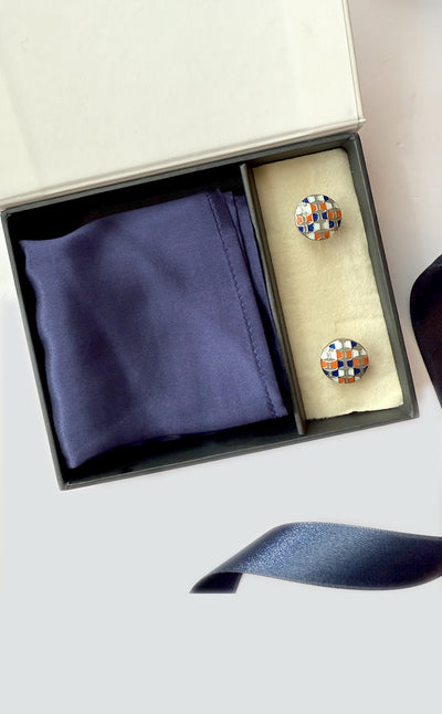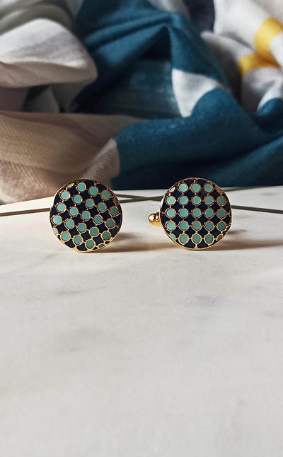 Regular price Rs. 4,560.00The elegant combination of deep navy, slate blue, mint green, and subtle blush accents offers a refreshing, oceanic depth, these cufflinks are handmade by artisans in Jaipur who intricately enamel each piece. Wear it with any solid shirt for a pop of colour and style to your outfit
