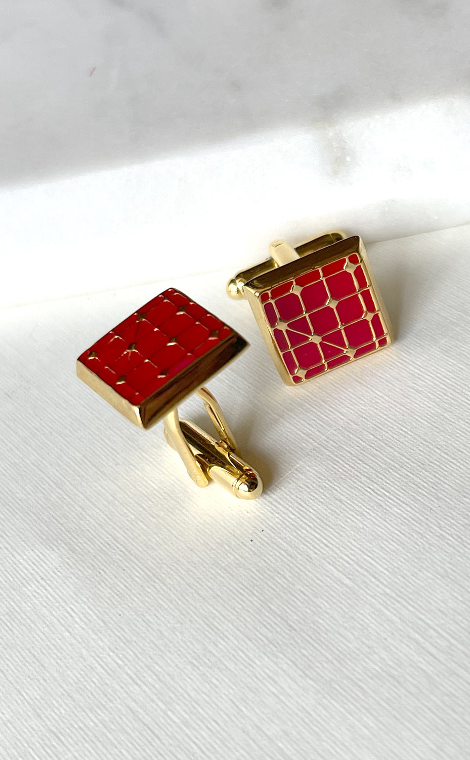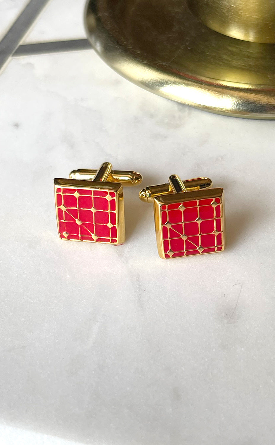 Regular price Rs. 4,560.00Inspired by the precise lines of modern architecture and polka dots in gold and scarlet colors, these cufflinks are handmade by artisans in Jaipur who intricately enamel each piece. Wear it with any solid shirt for a pop of colour and style to your outfit