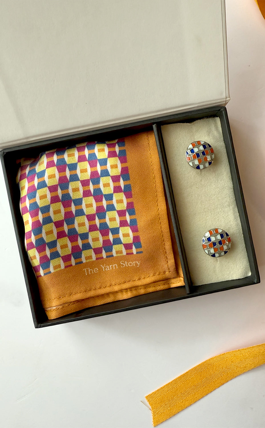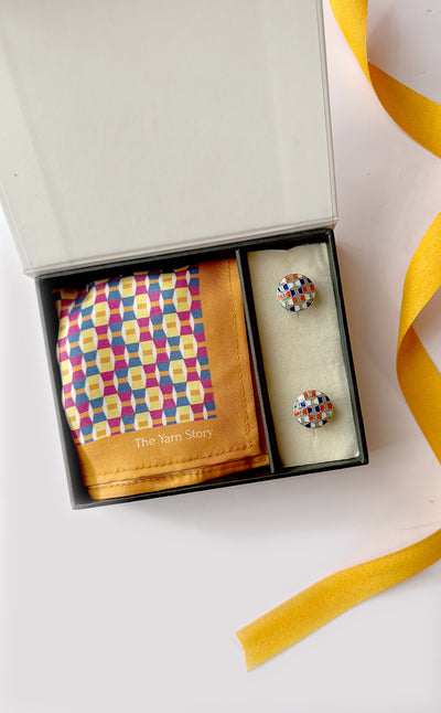 Regular price Rs. 4,560.00Inspired by the precise lines of modern architecture and polka dots in gold and yellow colors, these cufflinks are handmade by artisans in Jaipur who intricately enamel each piece. Wear it with any solid shirt for a pop of colour and style to your outfit