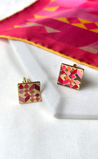 Regular price Rs. 4,560.00Inspired by the lively hues of a sunset with hues of fiery orange, rose pink and deep coral, these cufflinks are handmade by artisans in Jaipur who intricately enamel each piece. Wear it with any solid shirt for a pop of colour and style to your outfit