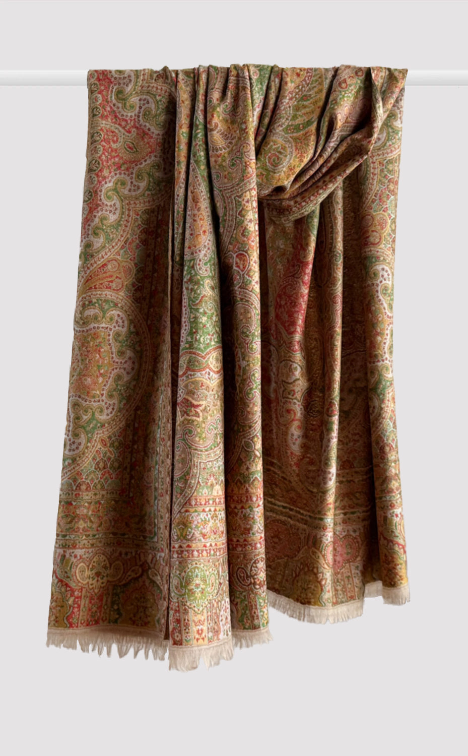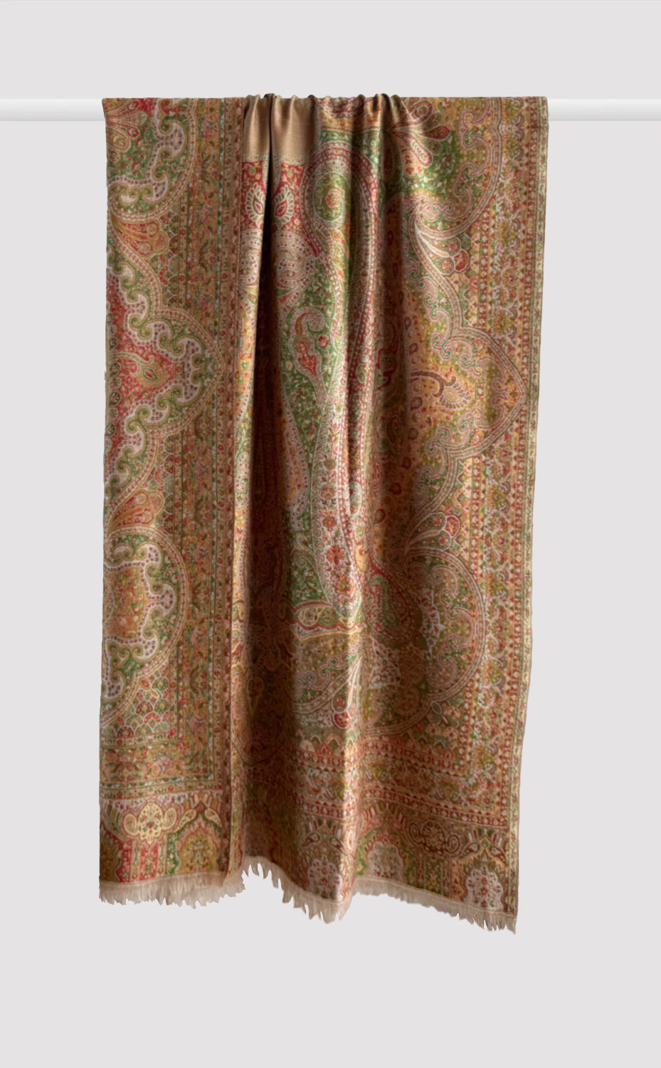 Our traditional Kani shawl is a woven masterpiece, crafted with vibrant threads to create regal paisley and floral designs. This unique piece is double-sided, featuring different colors on each side, adding to its charm. Showcasing exquisite Kani work that narrates ancient stories, this stole is both classic and timeless—a must-have for any wardrobe