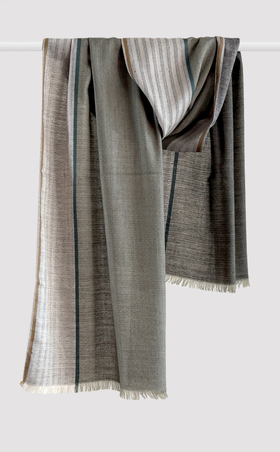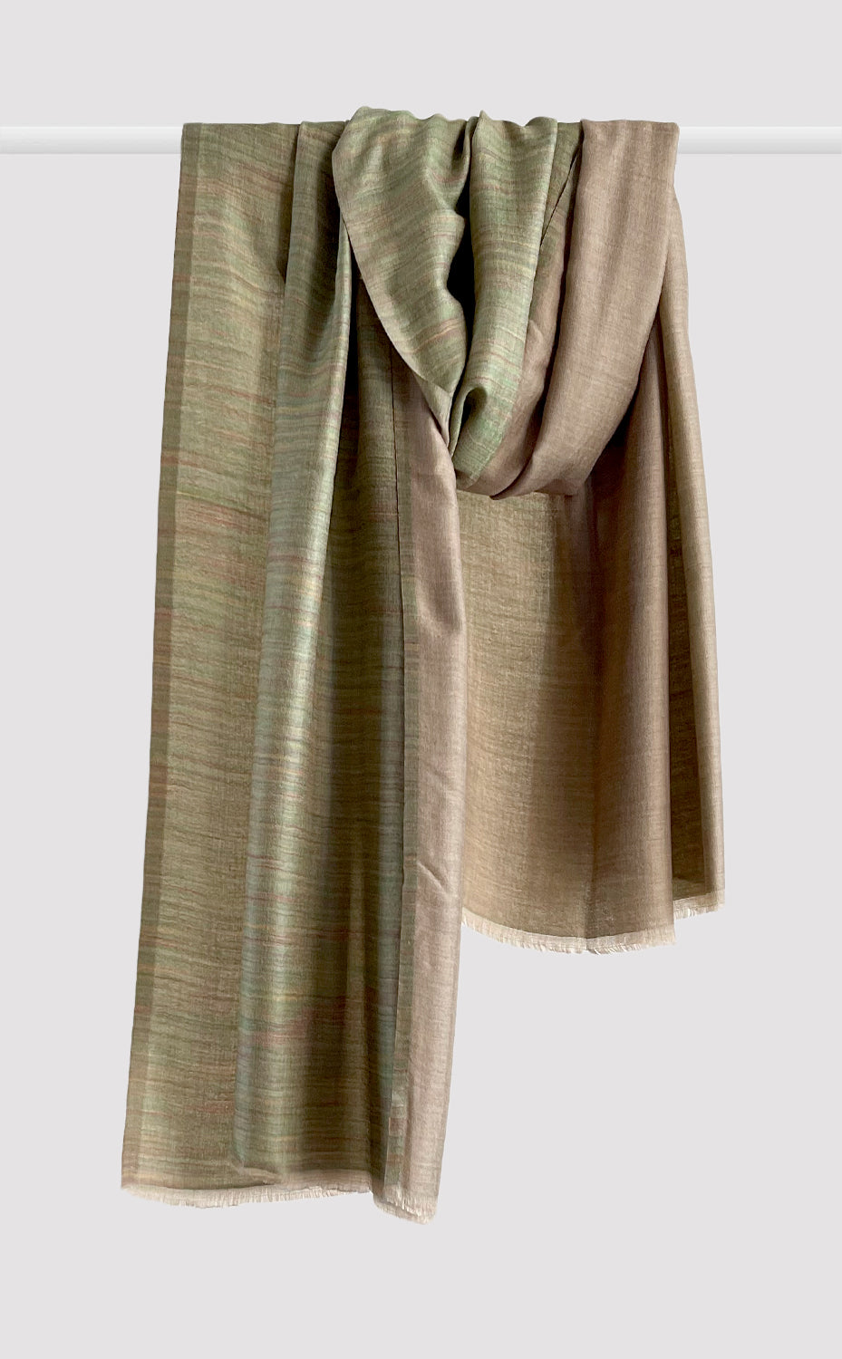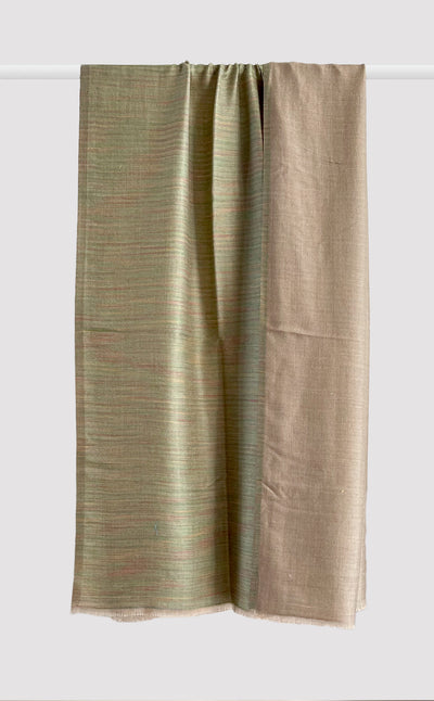 Regular price Rs. 10,800.00A beautiful pashmina shawl with dual colours, olive ikat on one side and beige colour on the other. Carry it on a formal winter evening for a classic & elegant look. Each dual coloured piece has been finely woven to create a seamless, reversible look
